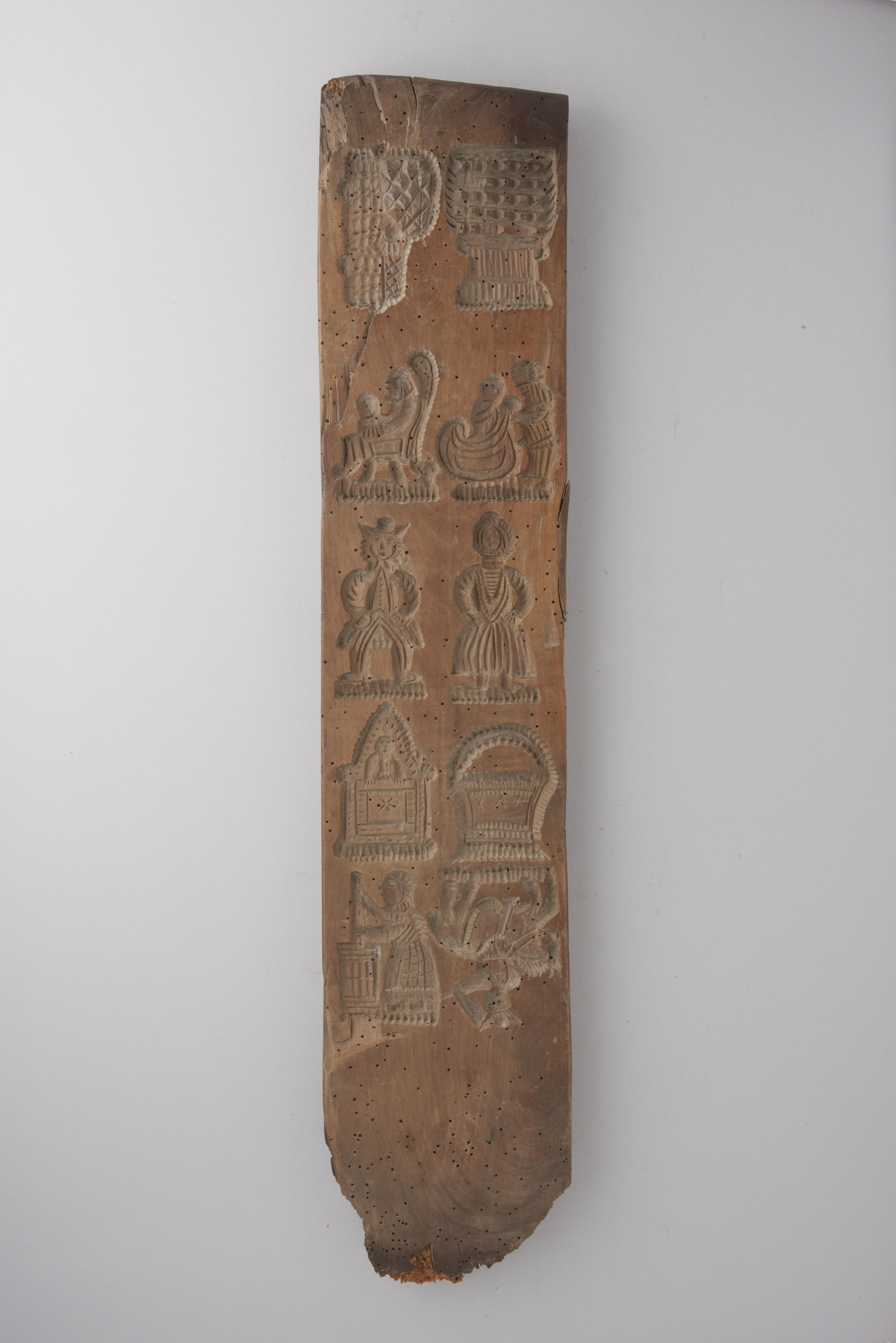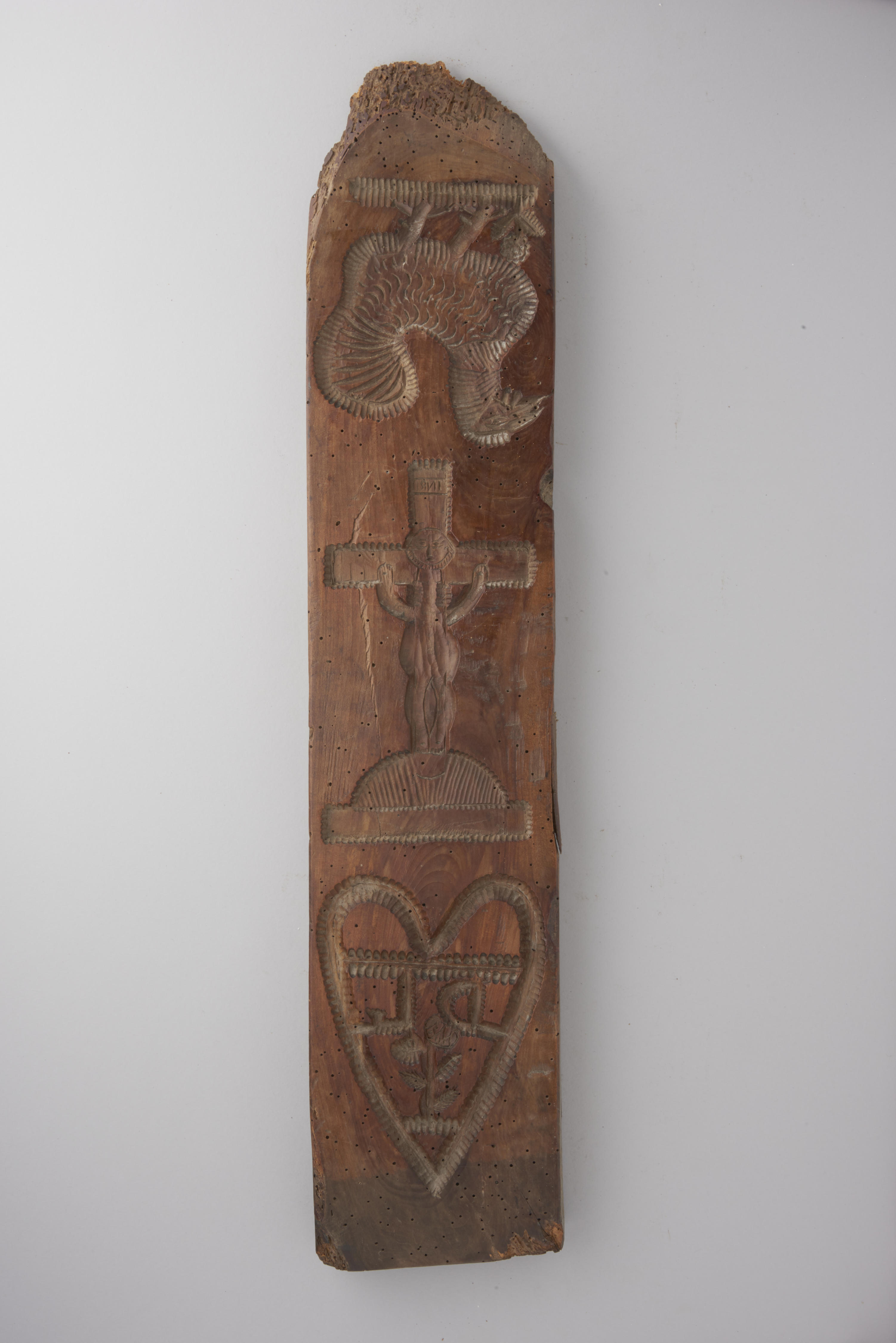 Houten koekplank. De plank is aan één zijde besneden met tien voorstellingen, waaronder een wieg, een karnende vrouw en een ruiter te paard. De andere zijde van de plank is besneden met drie voorstellingen: een vogel, Christus aan het kruis en een hart.