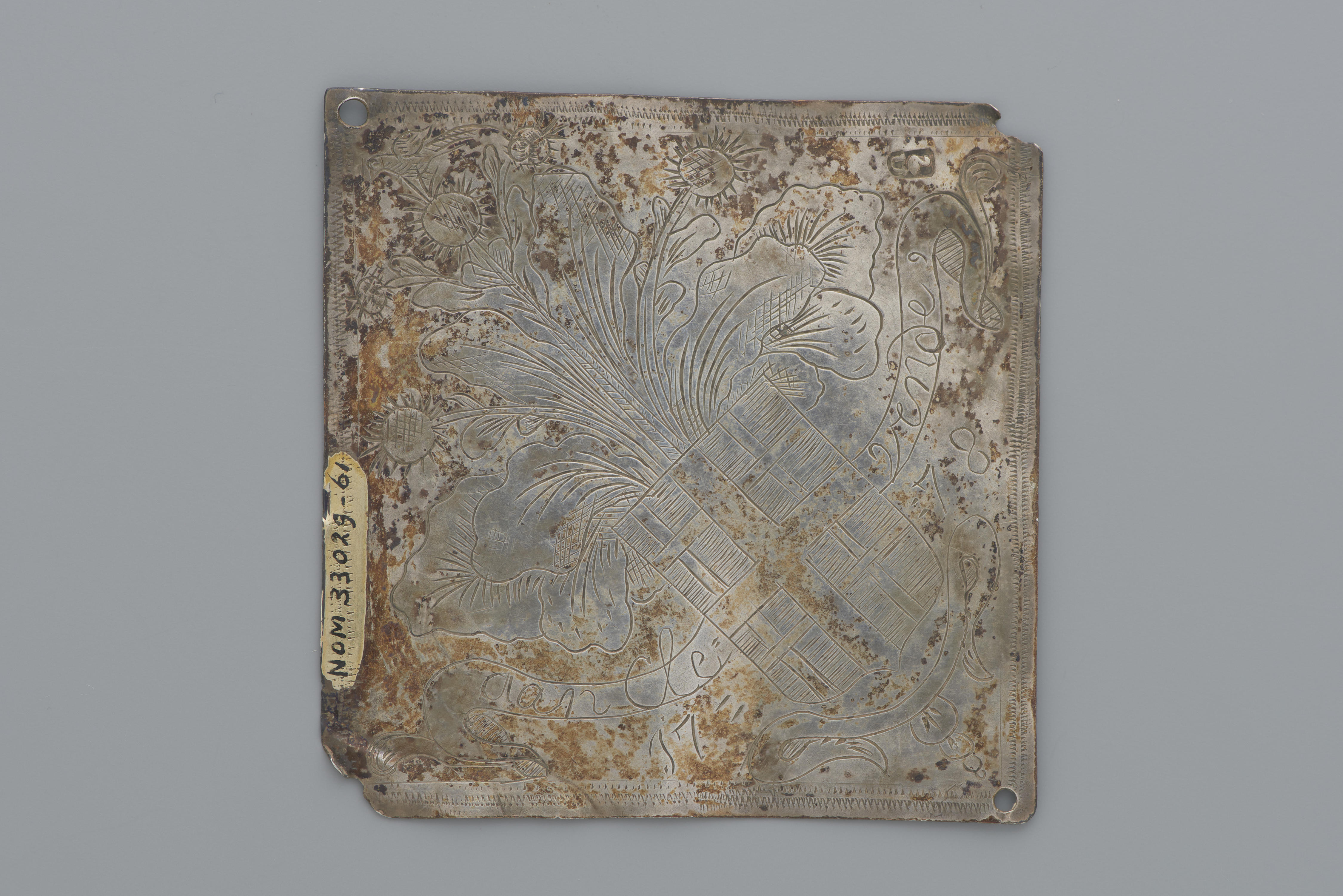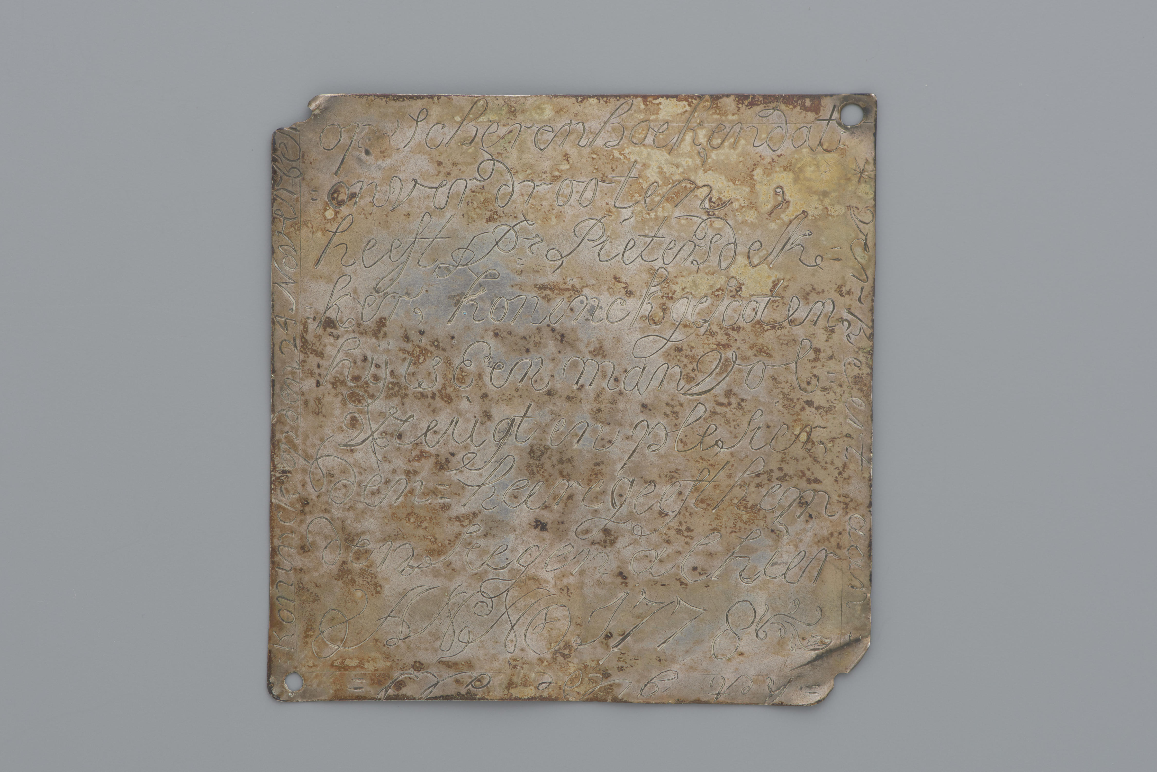 Zilveren schuttersplaat uit 's-Heerenhoek. In de voorzijde zijn het wapen van het gilde en bloemen met daarop een vogel gegraveerd. De inscriptie luidt: 'aan Clevende 1778'. In de achterzijde is de volgende tekst gegraveerd: 'Verheert aan het gilde als koninck op den 24 November op scherenhoek, en dat onverdrooten, heeft Dr. Pieters Dekker, Koninck gescoten, ...
