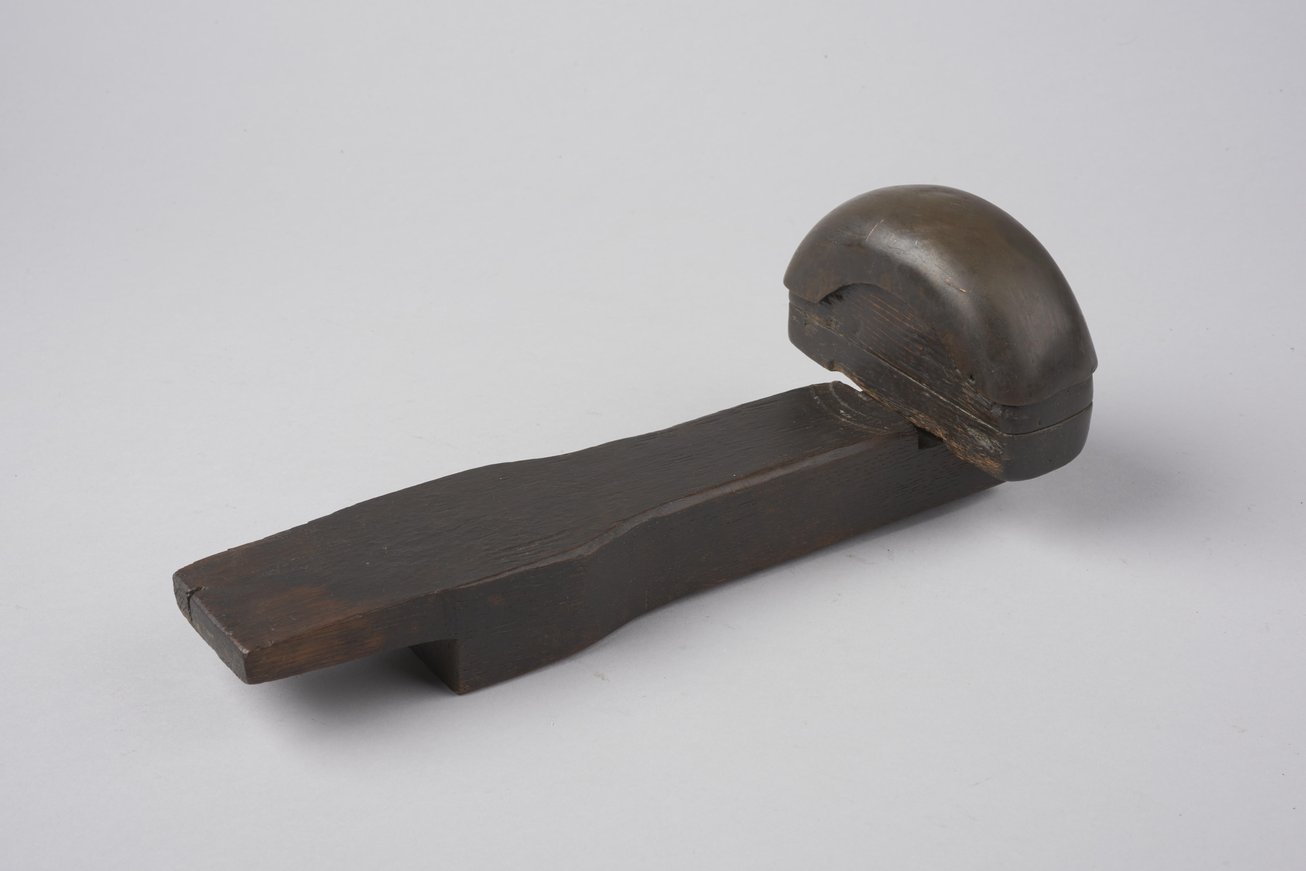 Vurenhouten tas met koperen afdekplaatje. De tas is door een zilversmid gebruikt als een soort aambeeld voor het in vorm hameren van oorijzerbeugels.