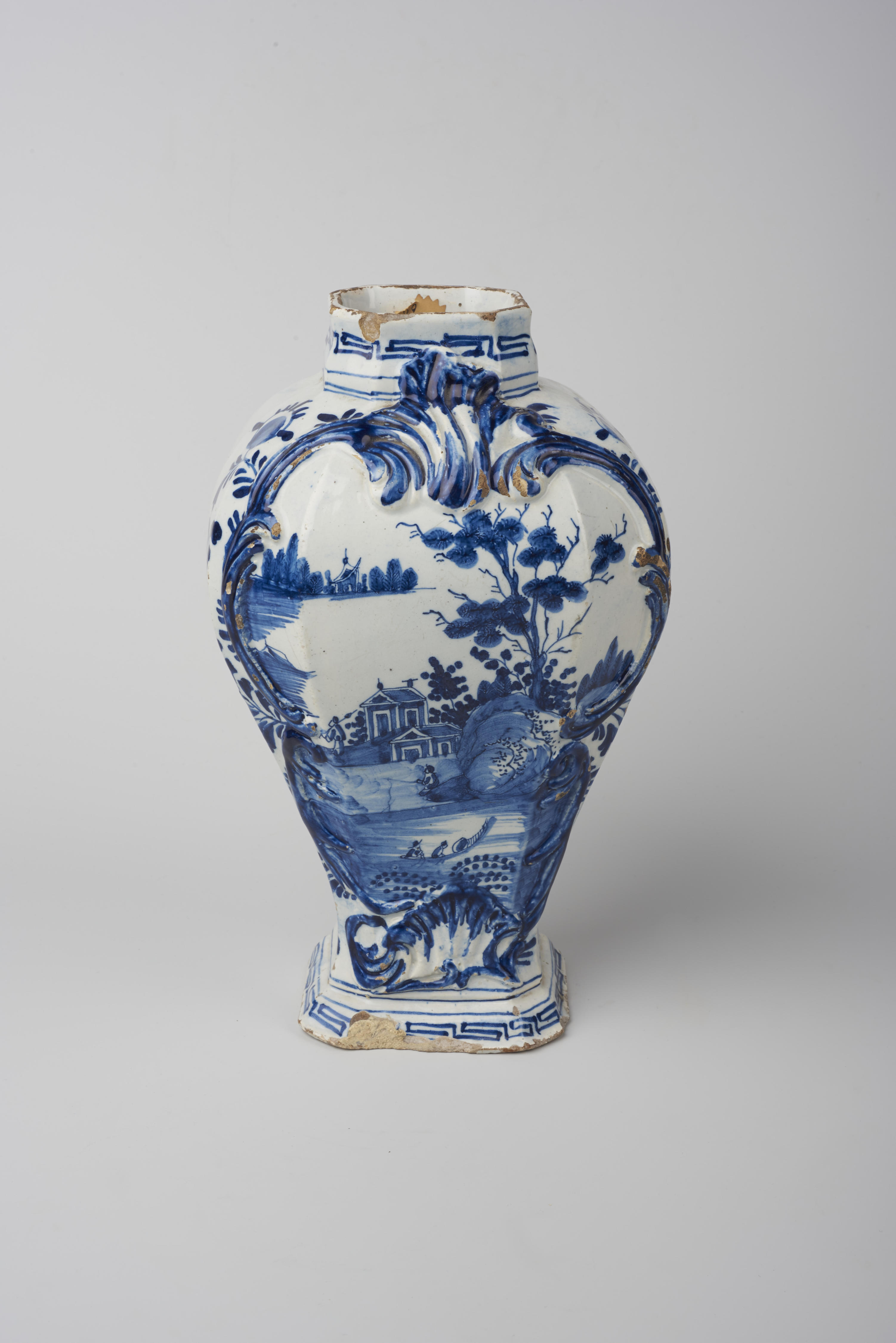 Kastvaas, versierd met een landschap met personen, onder wie een hengelaar, en een villa in een omlijsting in reliëf.