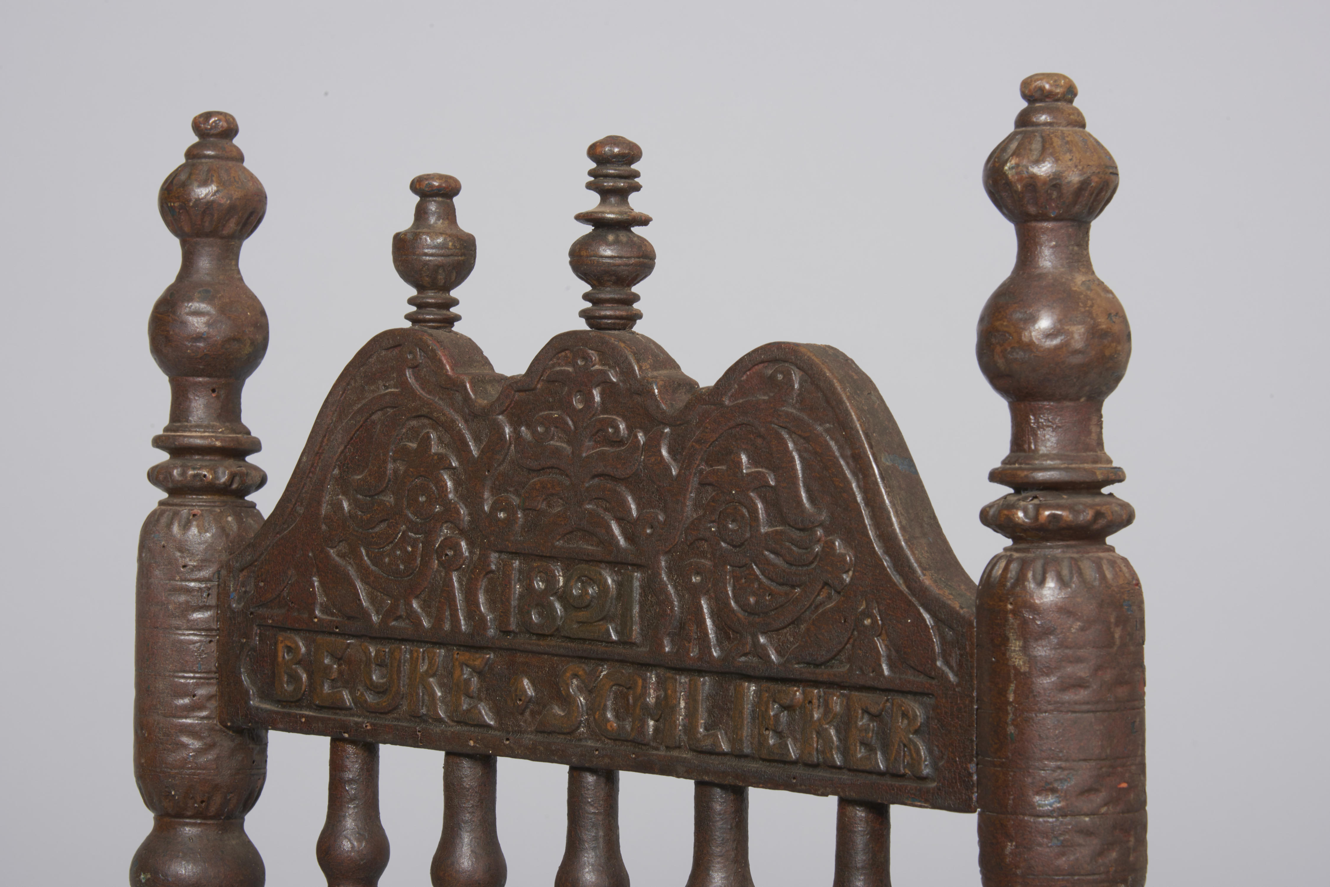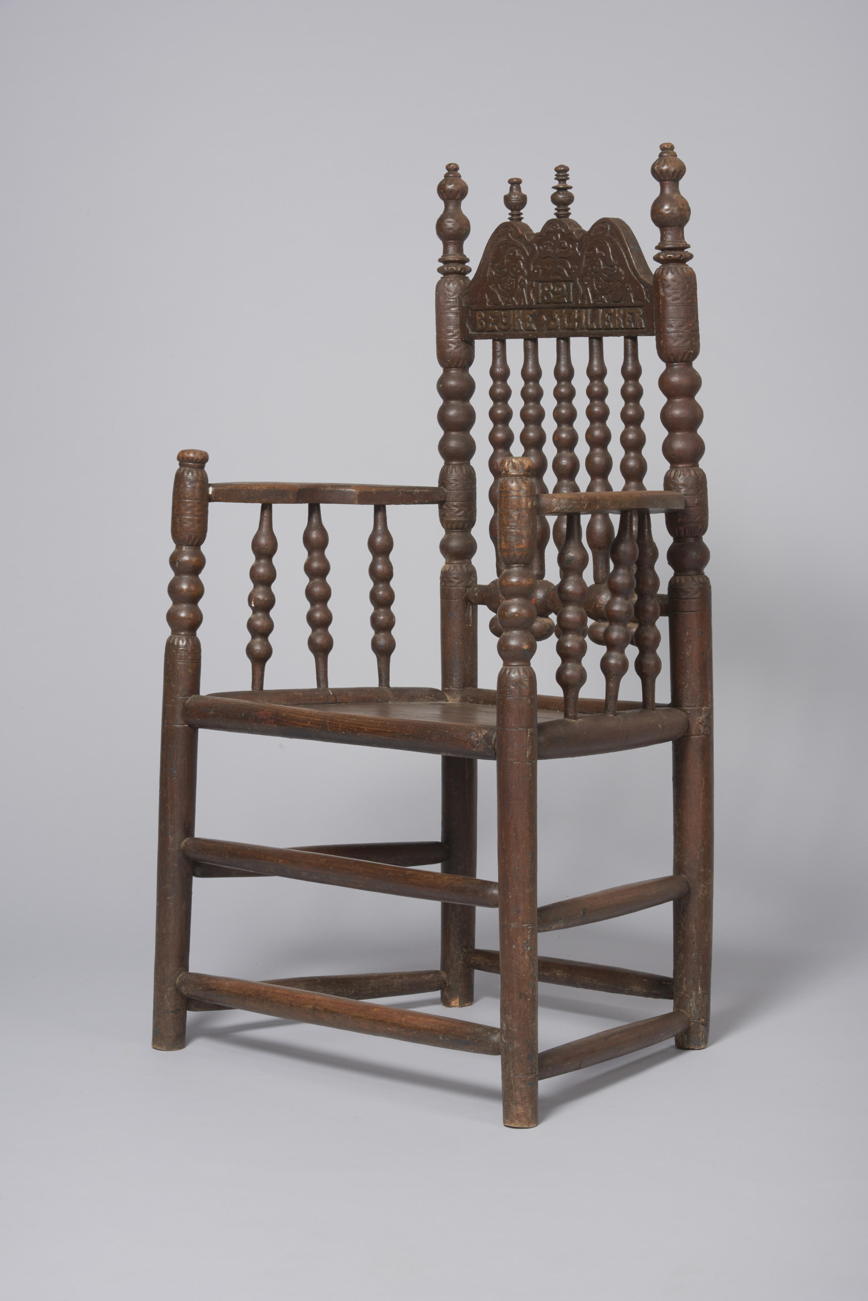 Beukenhouten knopstoel uit Altes Land, Duitsland. De zitting is gemaakt van beukenhouten planken. Onder de huidige omberkleurige houtimitatiebeschildering zit over de hele stoel blauwe verf. Onder de blauwe verf zit een nog oudere en waarschijnlijk oranje loodmenie kleur. De dieper gelegen delen van het kraaldraaiwerk waren oorspronkelijk groen aangezet. De constructie van de zitting is ...