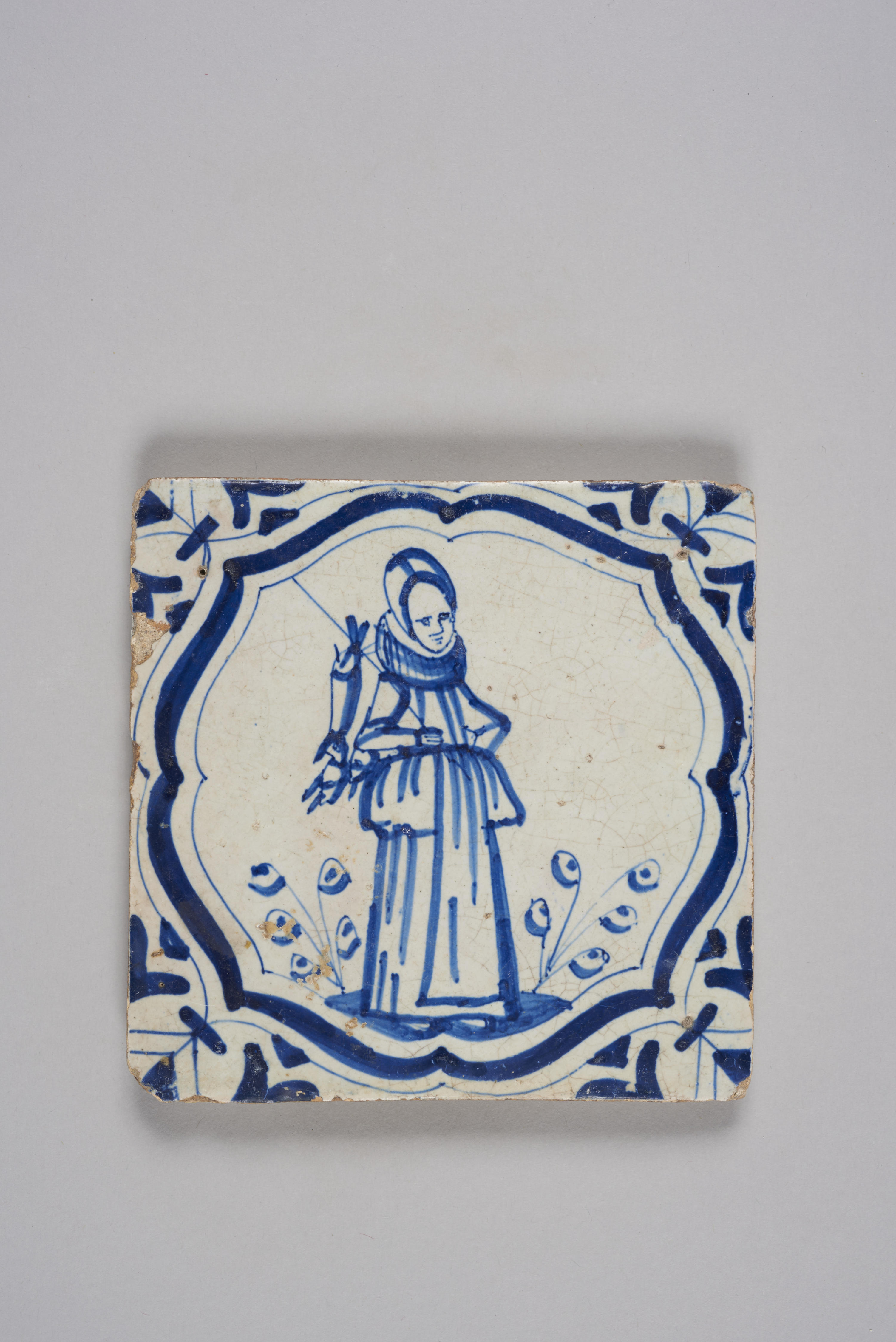 Wandtegel met afbeelding vrouw met dier aan stok in accolade-omlijsting, 1625–1650