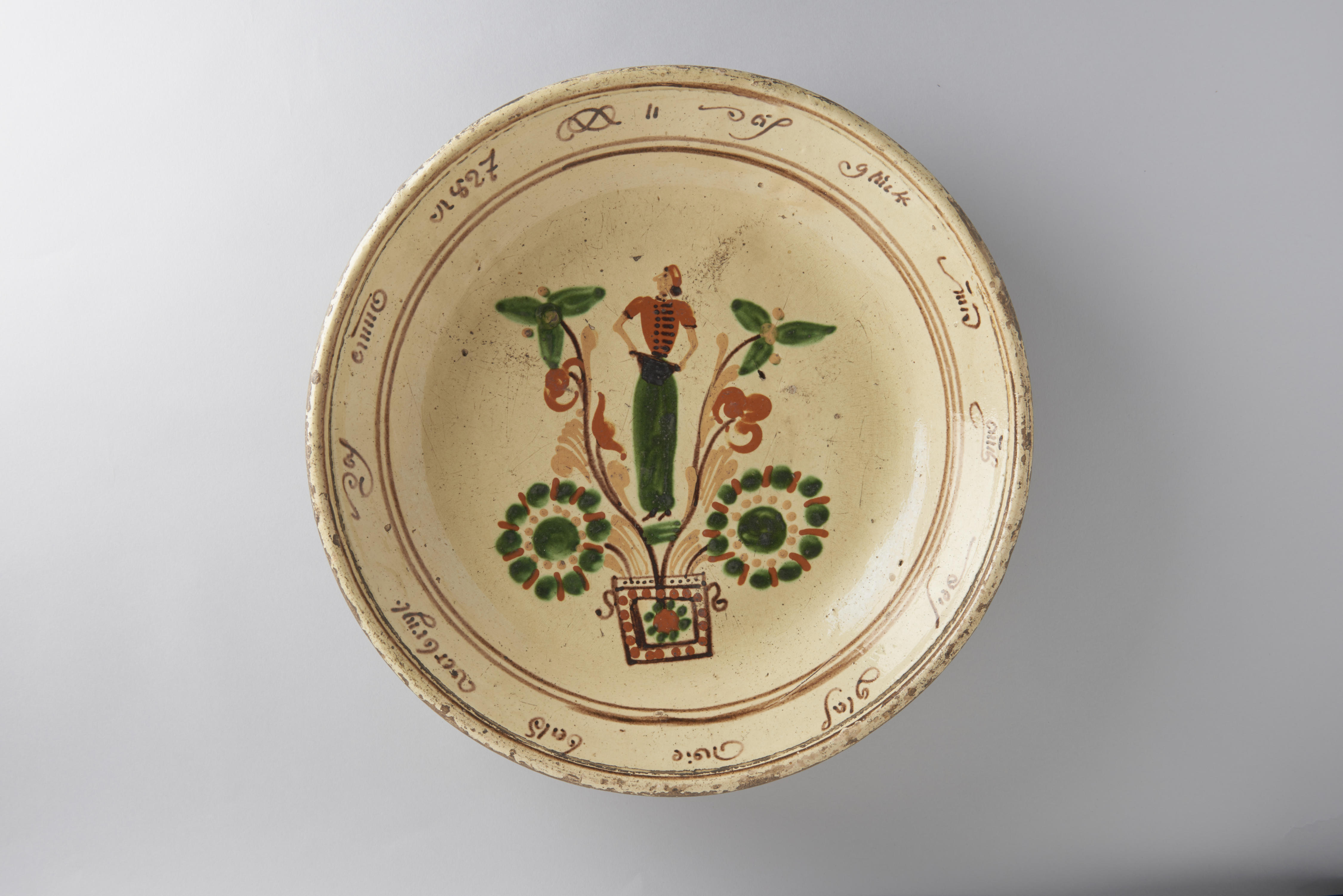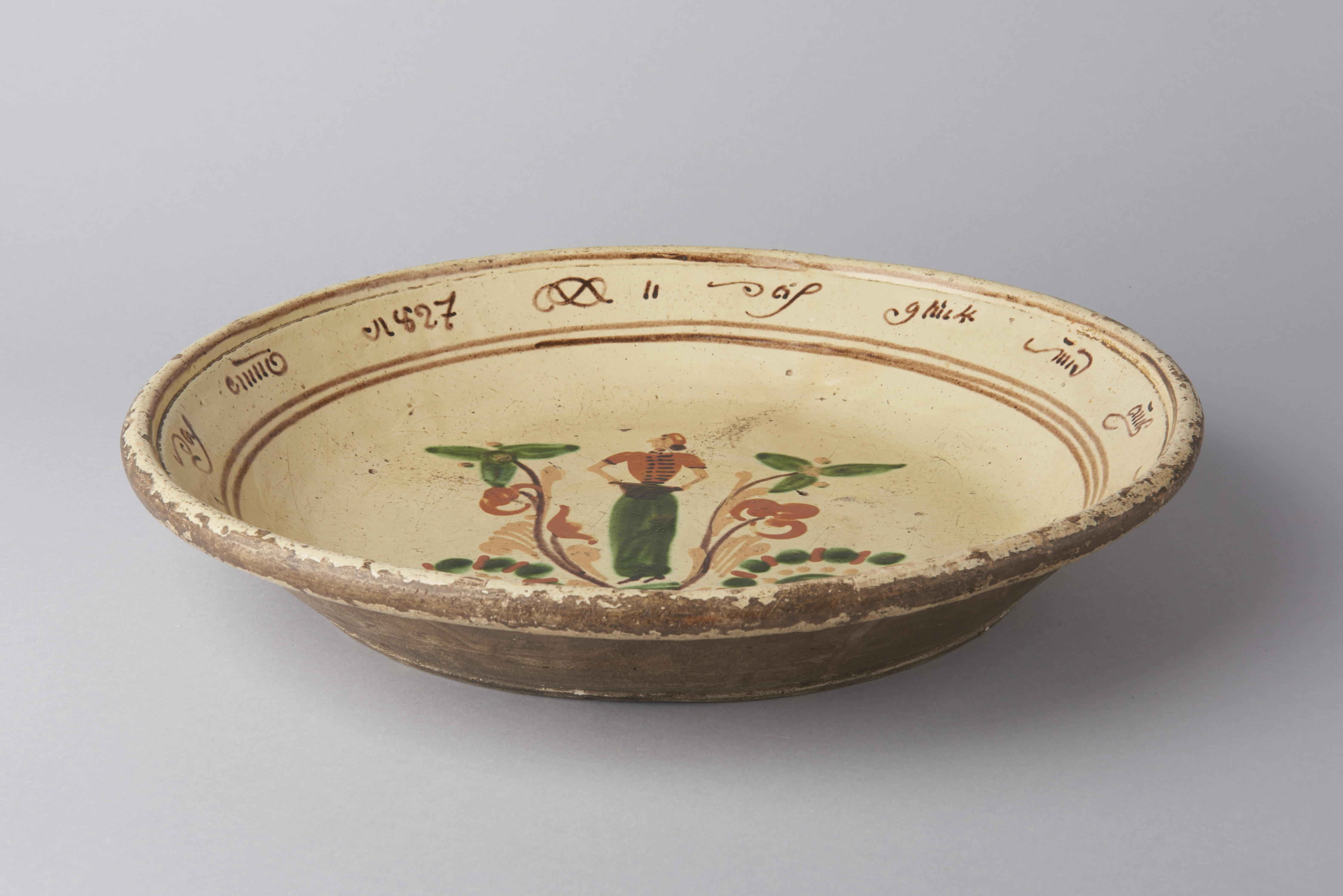 Schotel met een voorstelling van een vrouw tussen bloemen. Het opschrift luidt: 'Das glück und auch das glas wie bald verbrigt das anno 1827'.