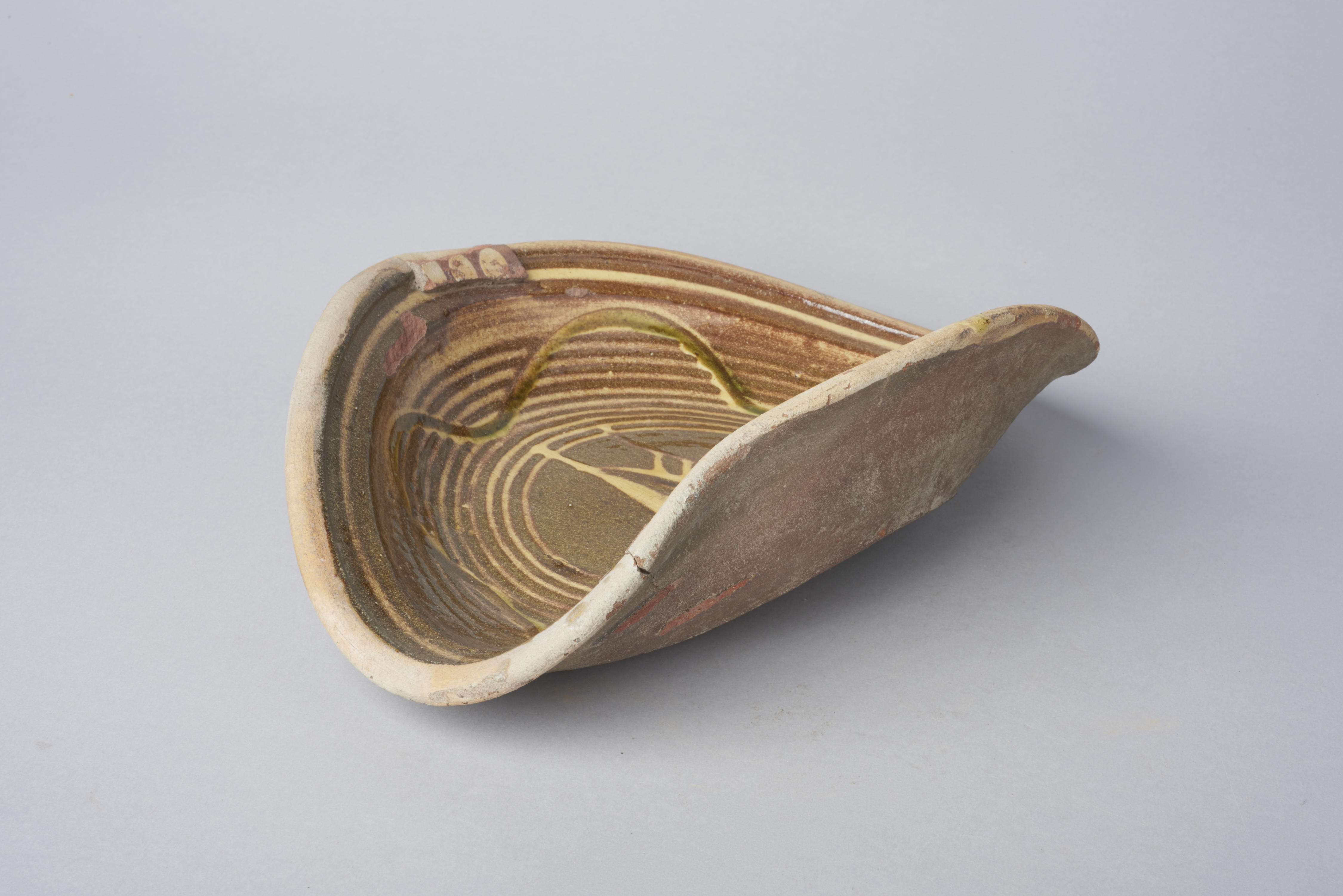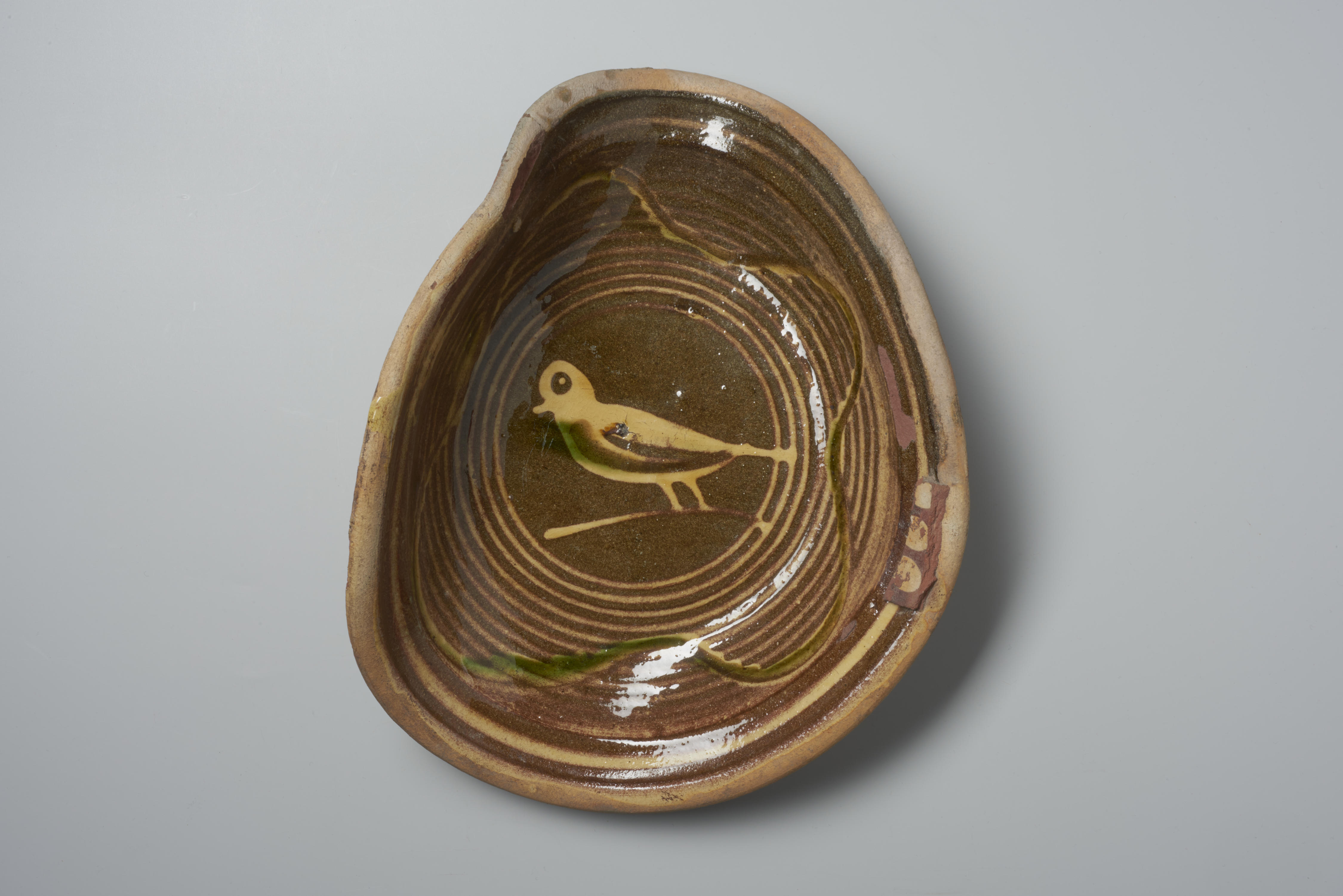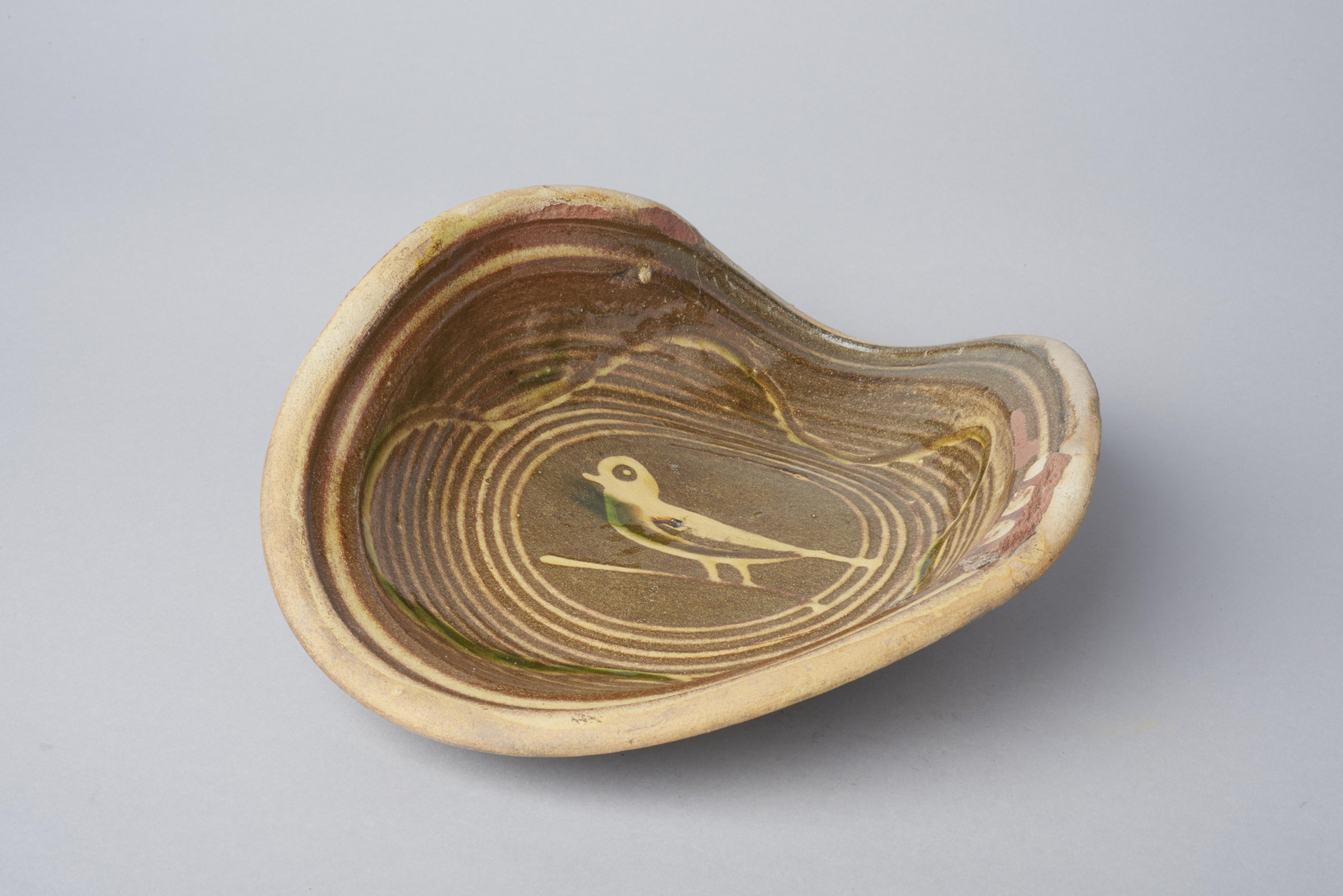 Schotel met een voorstelling van een vogel. De schotel, een misbaksel, is gevonden bij de opgravingen van een pottenbakkersoven in Issum, Duitsland, samen met ander ovenafval.
