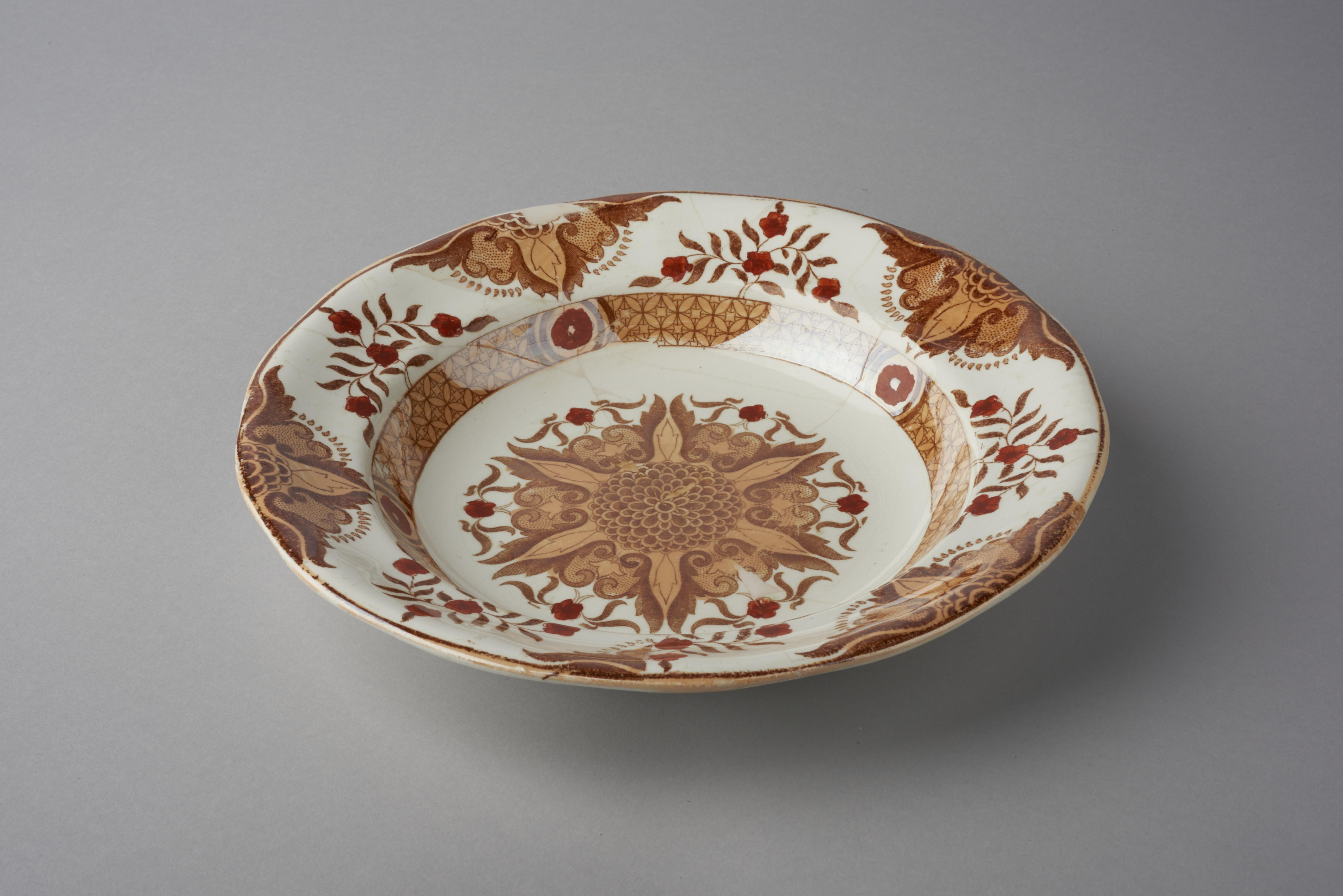 Sierbord, bedrukt in licht- en donkerbruin met gestileerde bloem- en bladornamenten. De kleine bloemmotieven zijn later rood ingekleurd.
