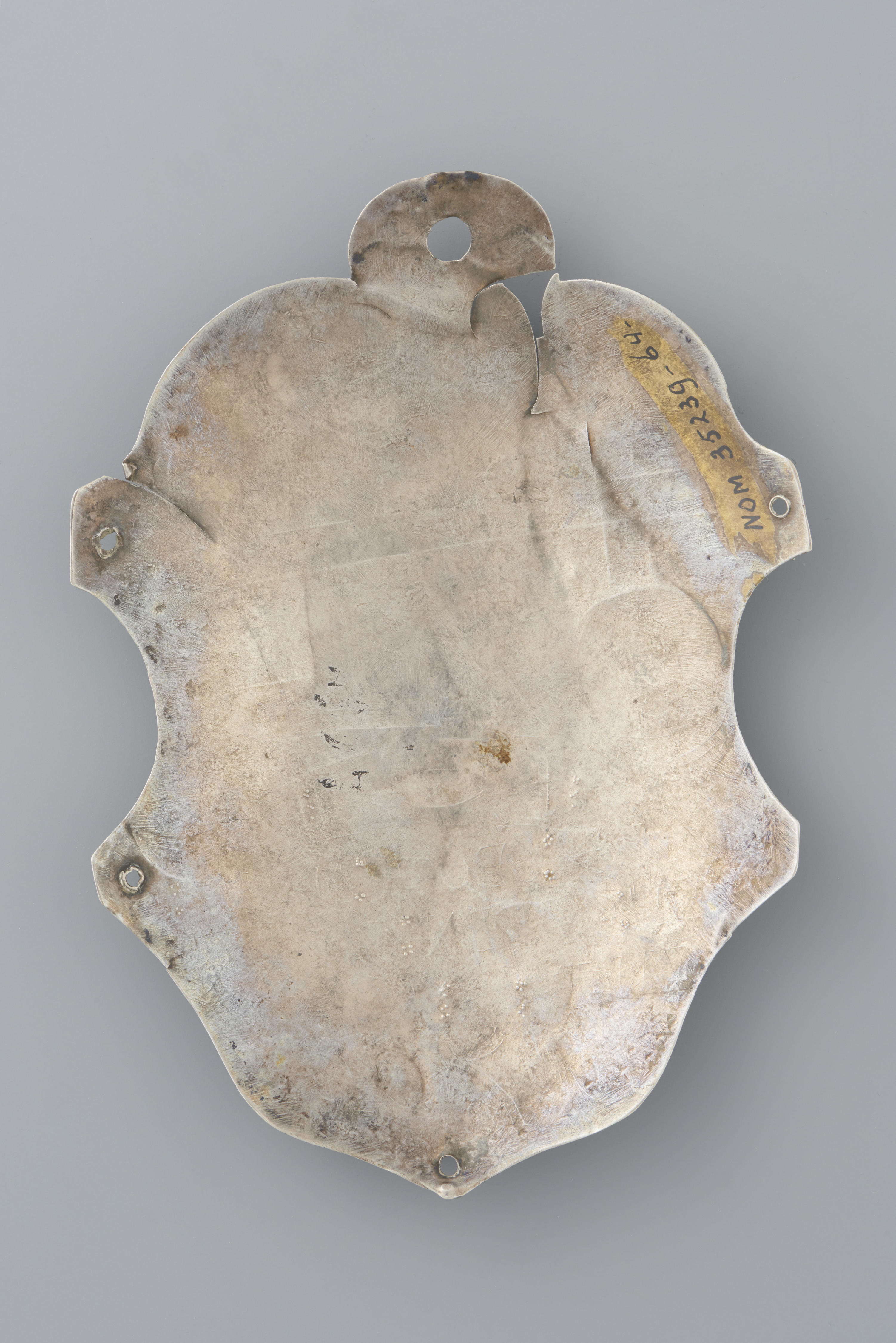 Zilveren schuttersplaat. Op het schild is een radploeg boven een weefschuitje gegraveerd. Hierboven staan de letters: 'PS'. Het onderschrift luidt: 'Peter Spoormans Den Ouden Coninck Int Iaer 1700'.