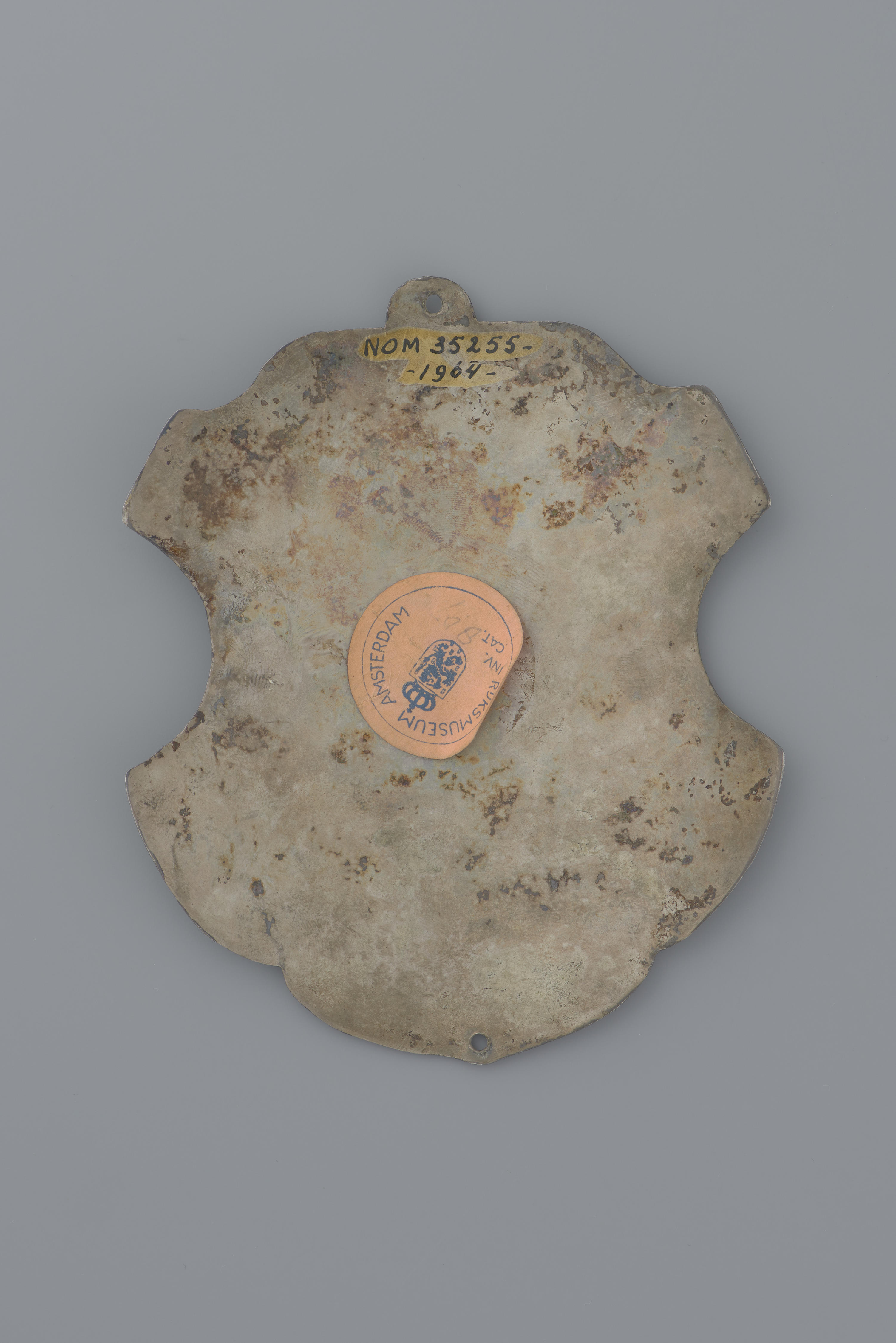 Zilveren schuttersplaat met een afbeelding van een wapenschild met hierboven een tournooihelm met bovenop een leeuwtje. Het onderschrift luidt: 'IOANNES VAN KILSDONCK CONING VAN Sa. CATHARINA. GILDE ANNO 1735'. De plaat is afkomstig uit Kilsdonk, een buurtschap bij 's-Hertogenbosch.