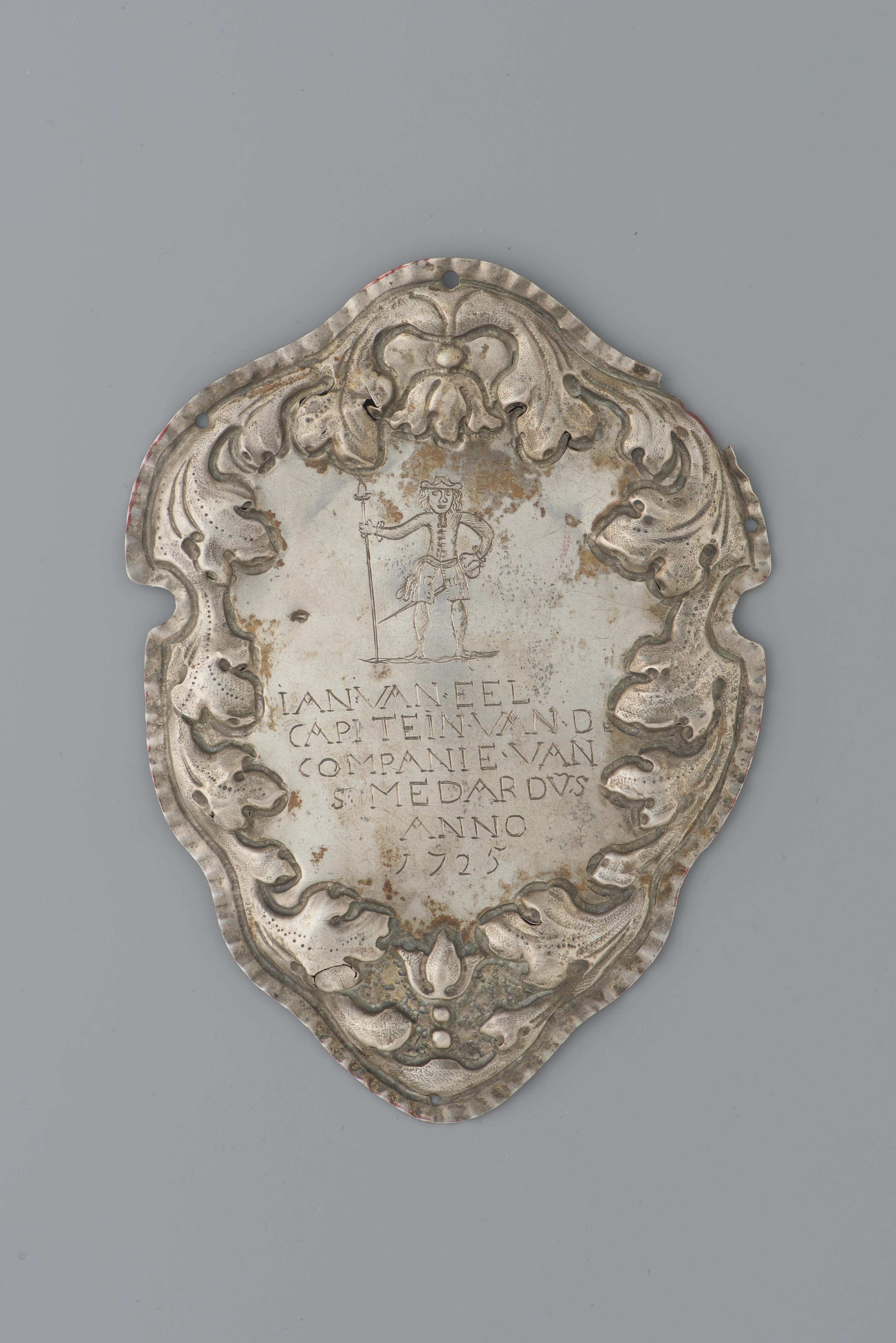 Zilveren schuttersplaat met een fors gedreven randornament. Op de plaat is een voorstelling gegraveerd van een man met een piek in de rechterhand en een zwaard aan de linkerzijde. Onder deze gravering staat de volgende inscriptie: 'IAN VAN EEL CAPITEIN VAN DE COMPANIE VAN S. MEDARDVS ANNO 1725'. De plaat is oorspronkelijk afkomstig van het ...
