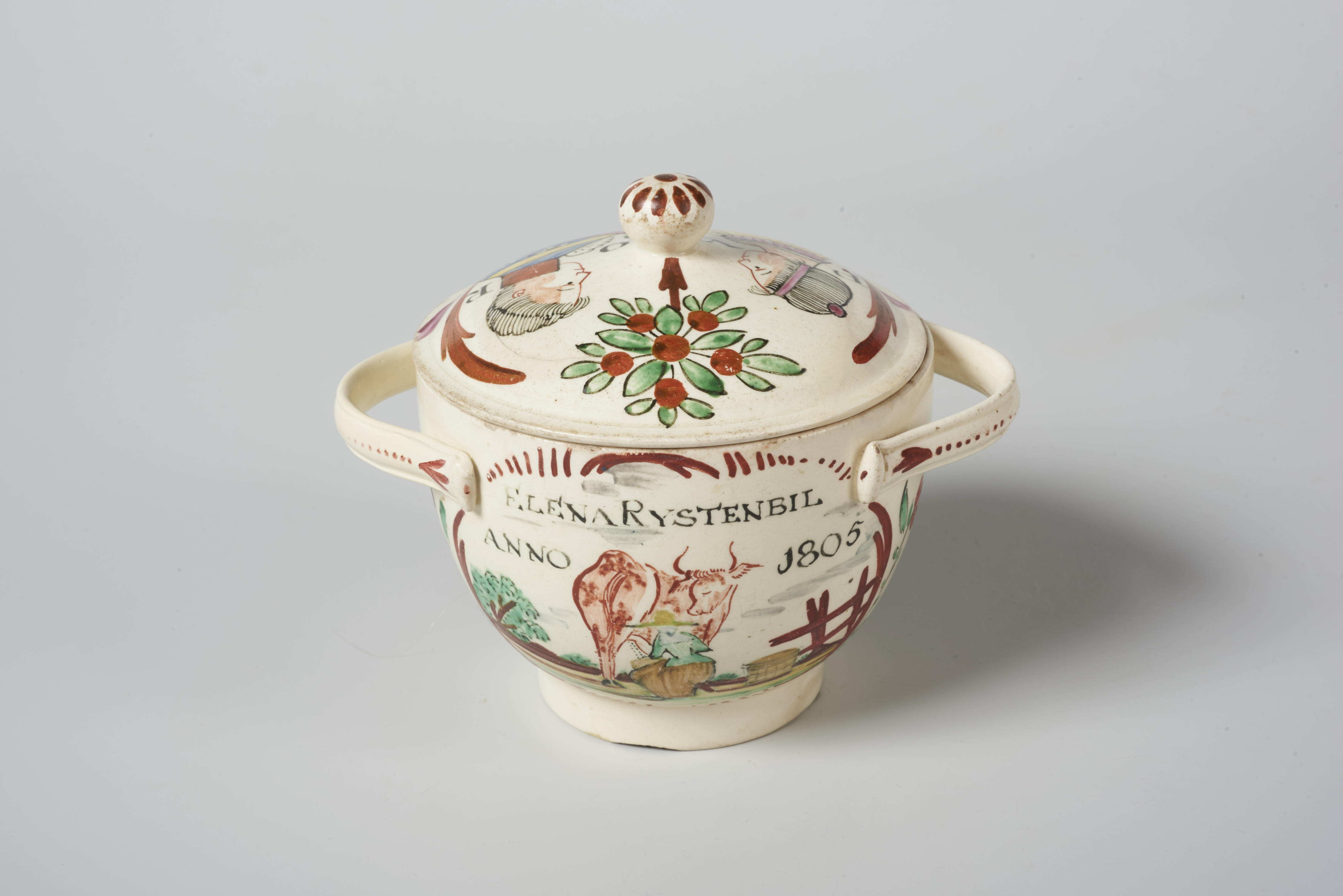 Suikerpot met op het deksel een afbeelding van Willem I en zijn vrouw Wilhelmina van Pruisen (1774-1834). Willem Frederik van Oranje-Nassau (1772-1843) werd in 1815 de eerste Koning der Nederlanden. Naast de portretten staat: 'P V O R' (Prins Van ORanje). Op de pot staat de tekst: 'Elena Rystenbil Anno 1805'.