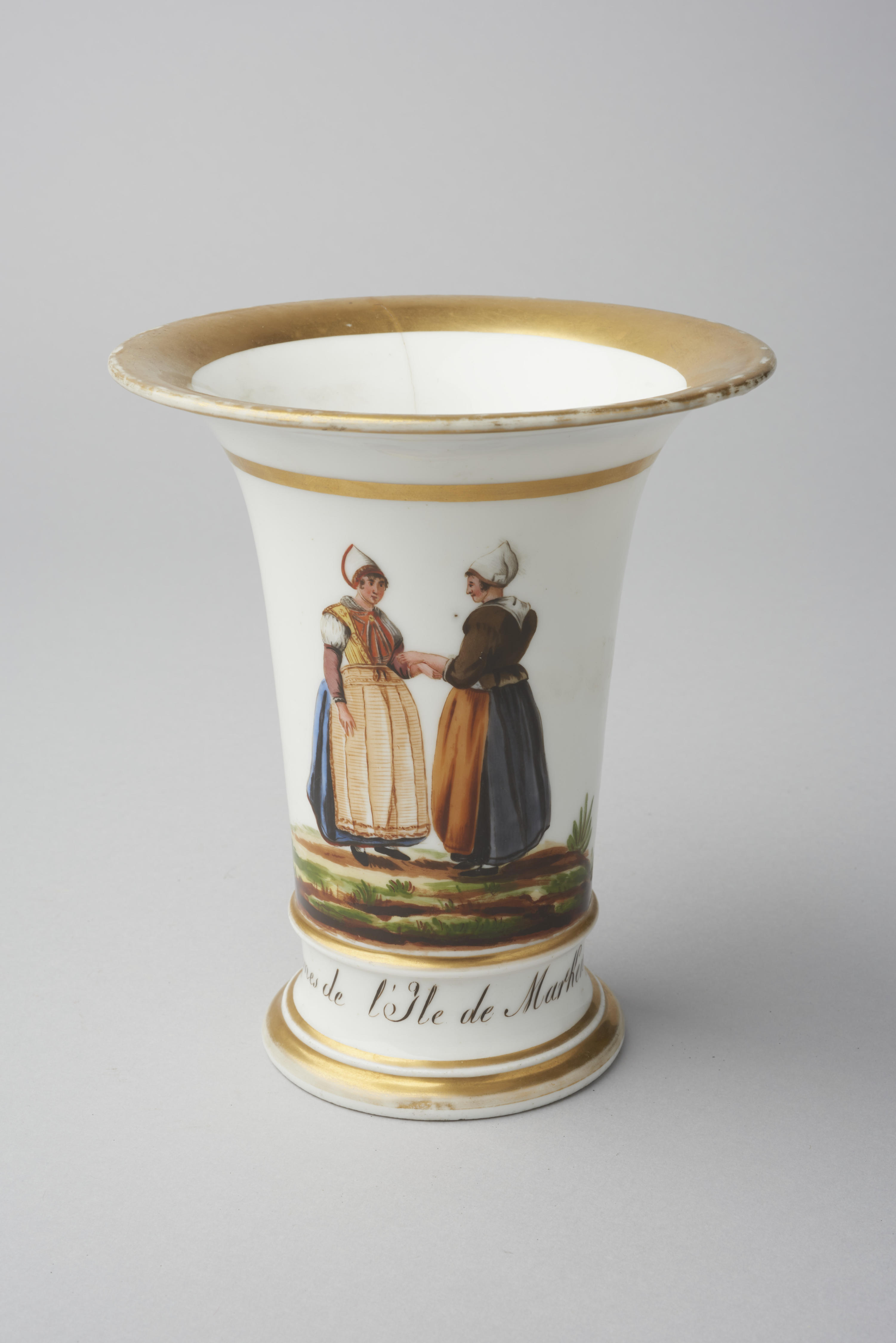 Vaas, gedecoreerd met een afbeelding van streekdracht naar een prent van de Marker bruid. Deze prent is uitgegeven door E. Maaskamp in het werk ‘Afbeeldingen van Kleedingen, Zeden en Gewoonten in de Noordelijke Provinciën der Nederlanden’ in Amsterdam tussen 1803-1807.