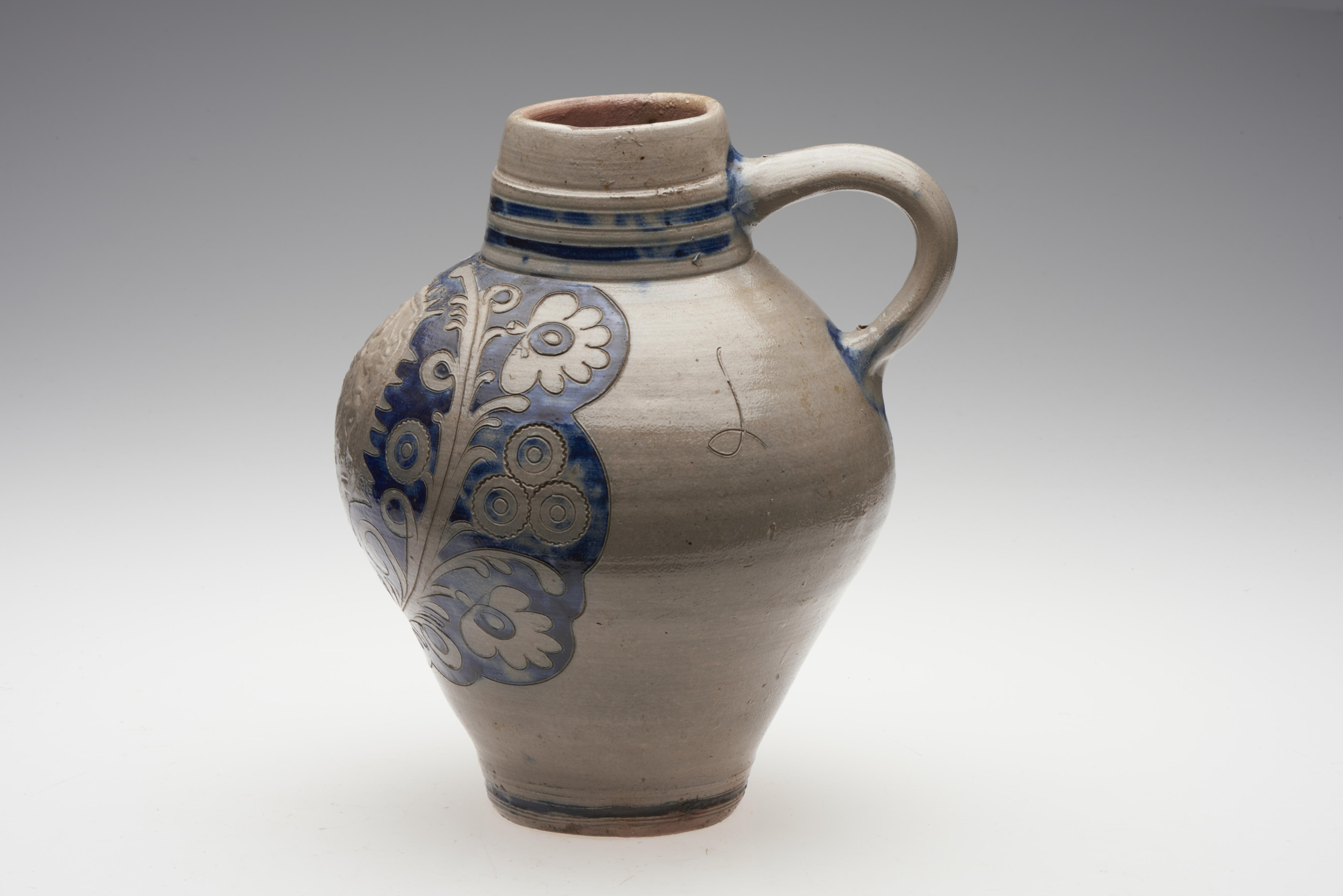Kruik van gres aardewerk uit Westerwald. Op de kruik zijn bloemenranken aangebracht met in het midden het wapen van Engeland. Stilistisch gezien moet deze kruik rond 1800 zijn vervaardigd, omdat er in deze periode veel vergelijkbaar materiaal naar Engeland werd geëxporteerd. Ook deze kruik zal voor de Engelse markt zijn vervaardigd.