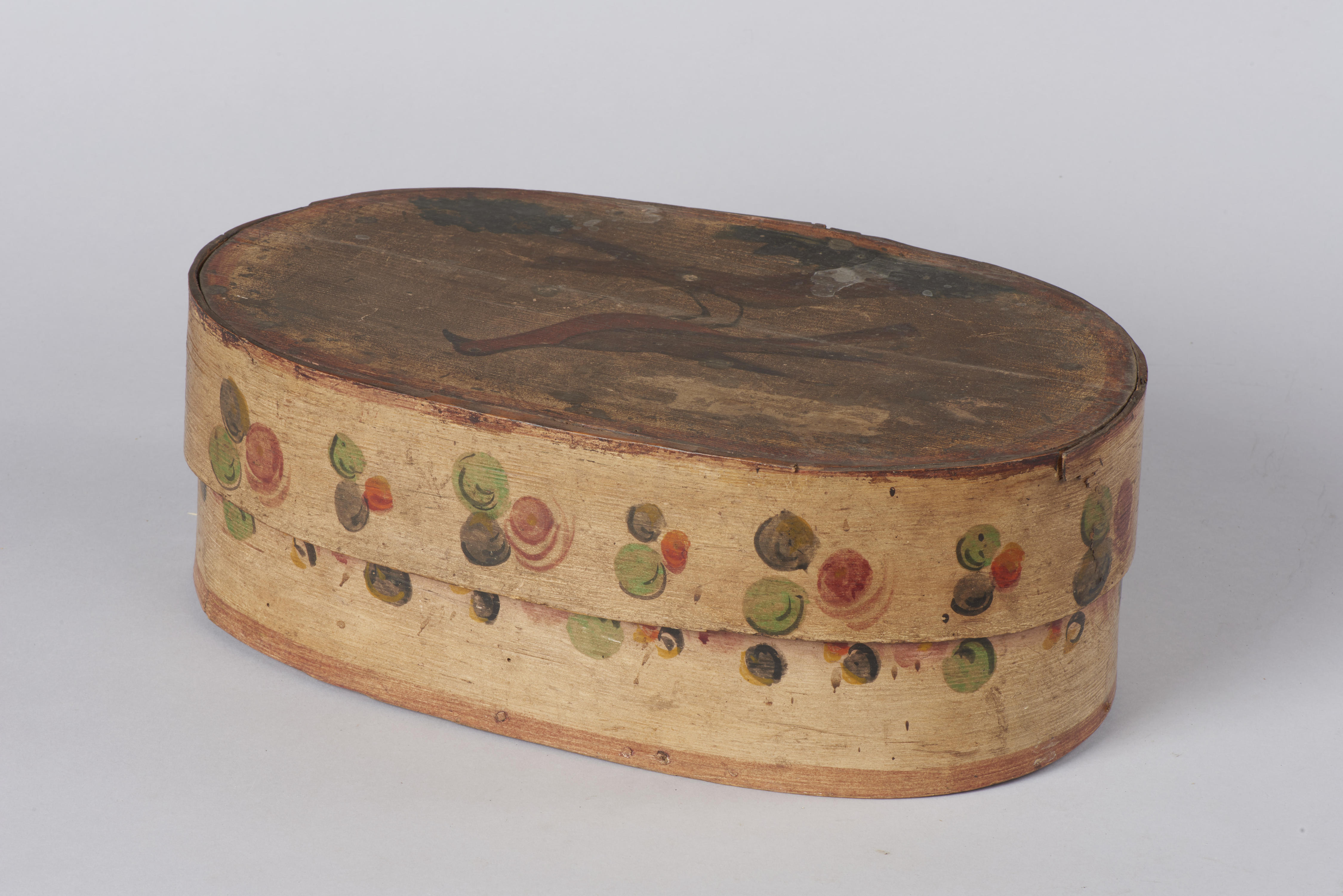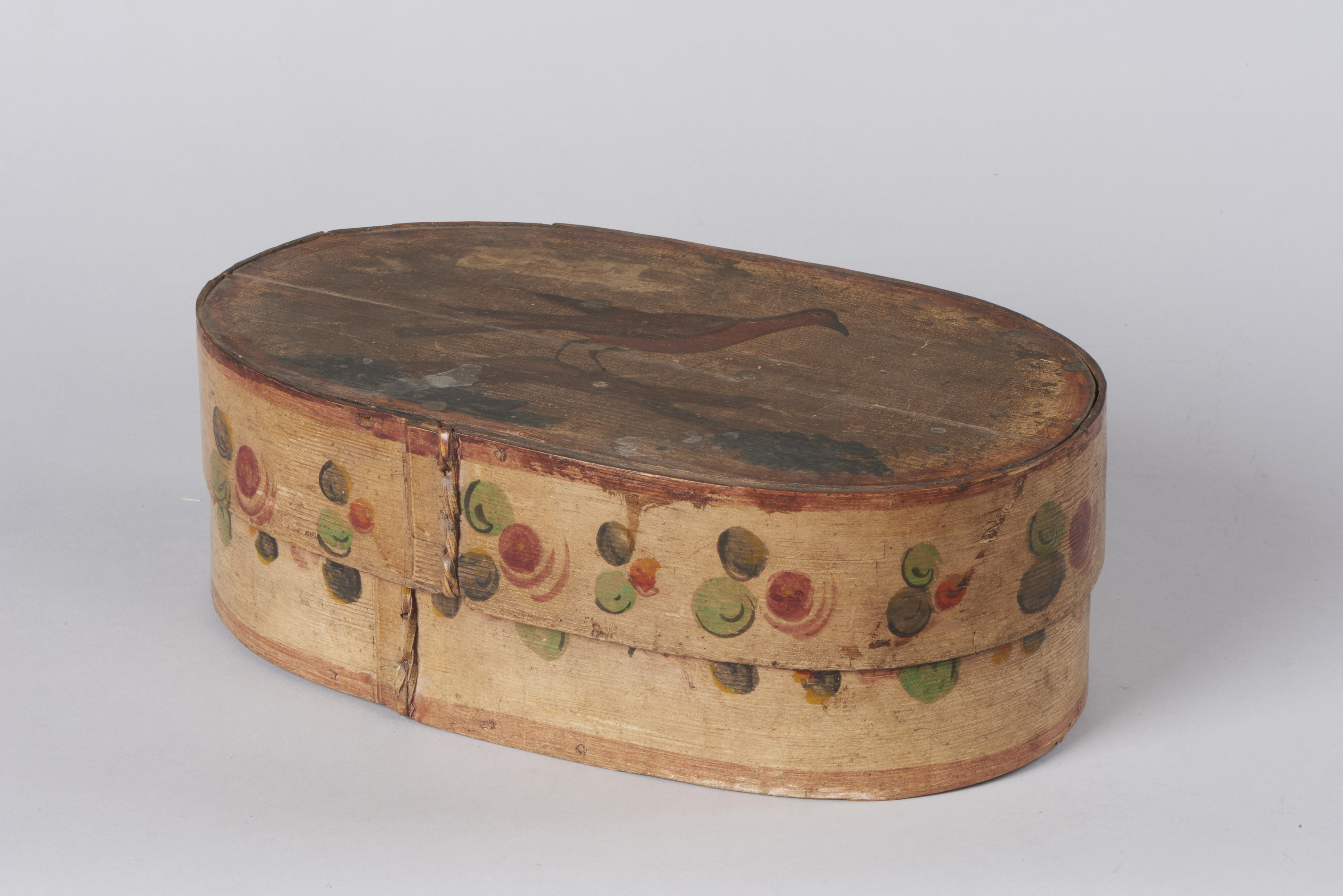 Ovale spanen doos met oversluitende deksel, geheel vervaardigd van perfect kwartiers gekloofd naaldhout, vergaard met houten pennetjes. De overlap van de zijwanden is samengebonden met rotan. De beschildering bestaat uit een wit fond, op de randen afgezet met een frambooskleurige bies. Op de zijden staat een rondlopende bloemenband en op de bovenzijde is een vogel ...