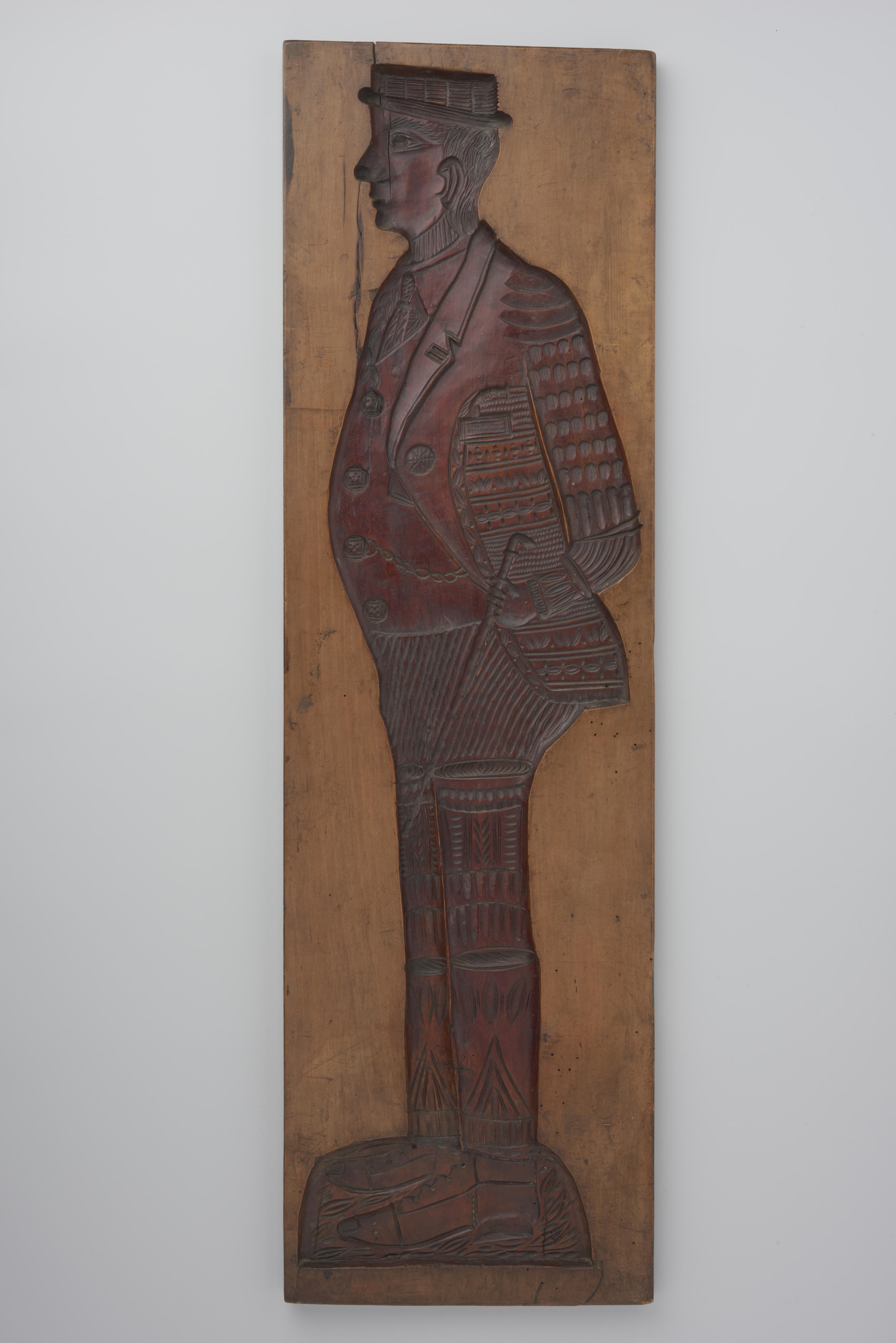 Lindehouten speculaasplank, aan één zijde besneden met een voorstelling van een man met een wandelstok.