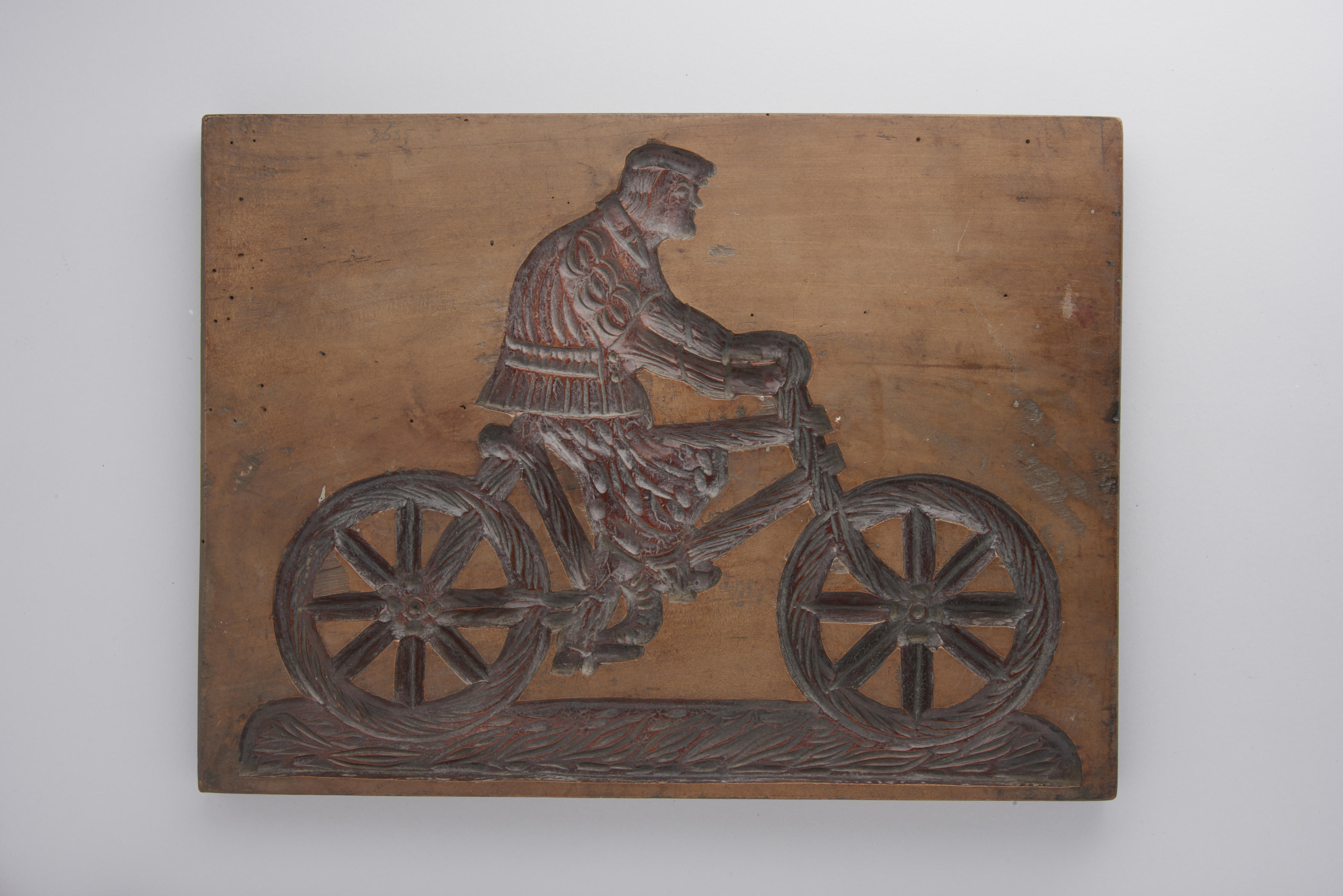 Houten koekplank, aan één zijde besneden met een voorstelling van een man op een fiets.