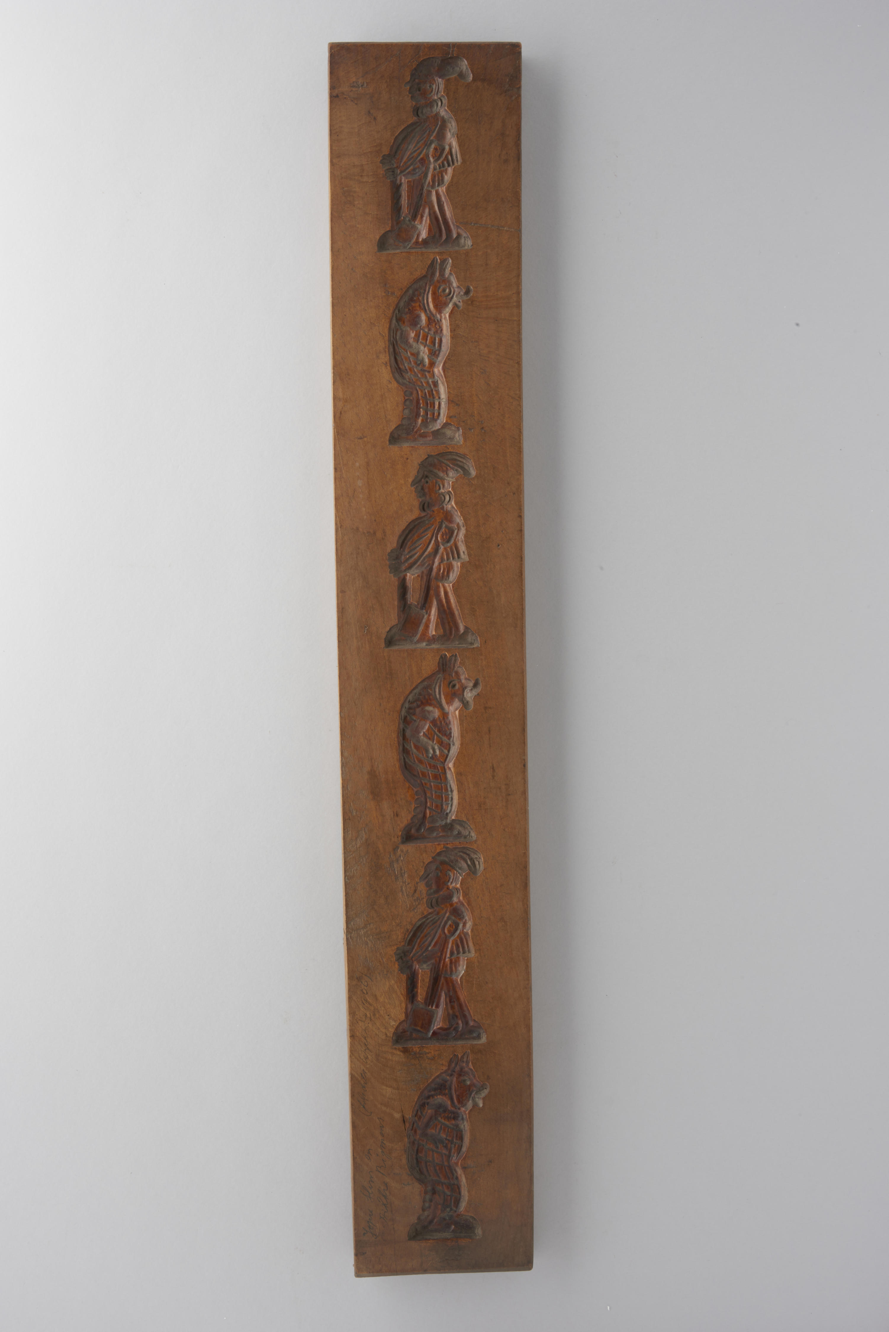 Beukenhouten koekplank, aan één zijde besneden met zes mensfiguren, waaronder Jopie Slim en Dikkie Bigmans.