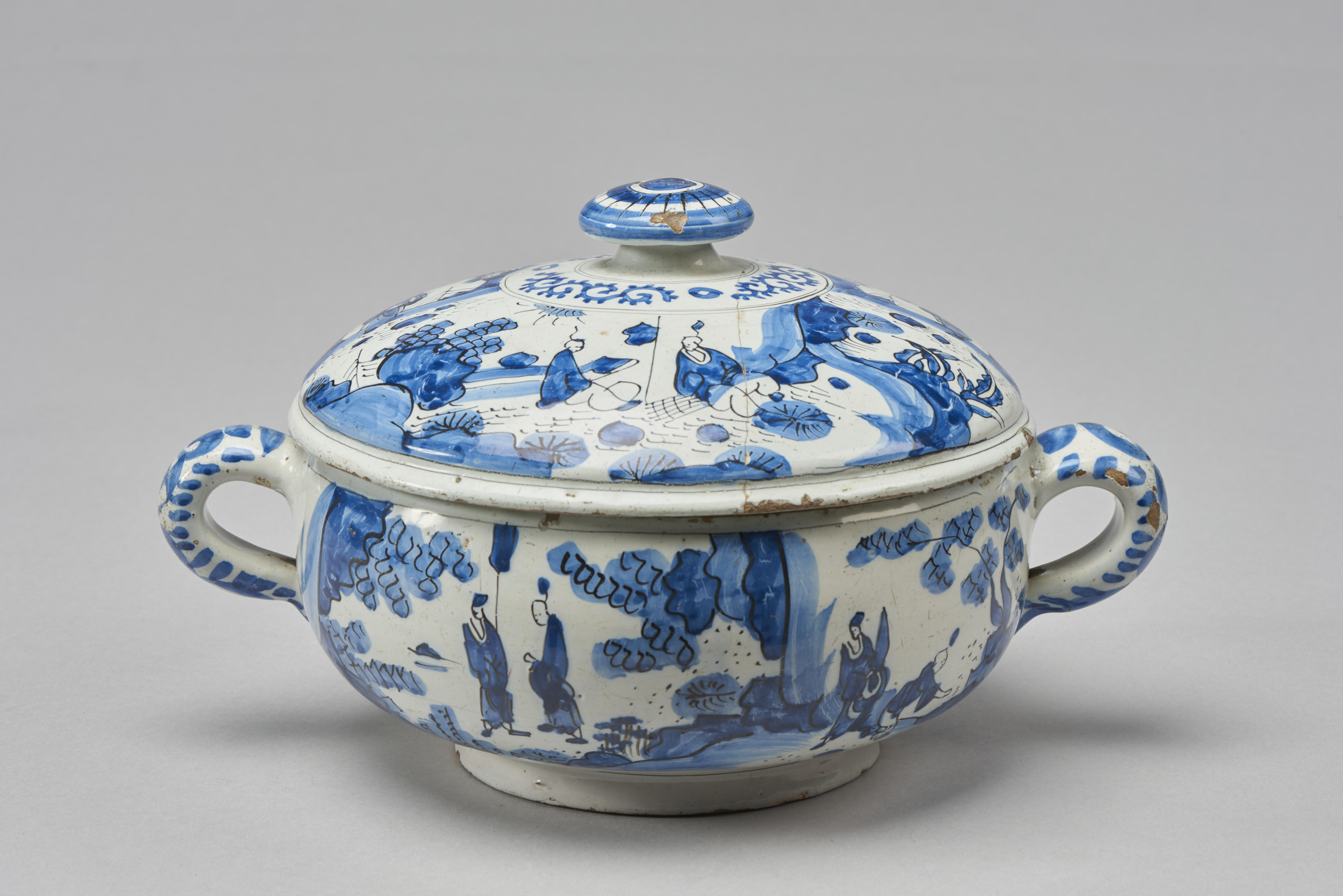 Terrine met deksel, versierd met chinoiserieën. De terrine dient ook als kruidkom, te zien aan het erin vastgebakken vergietbakje voor kruiden, voor het kruiden van melk (kandeel).