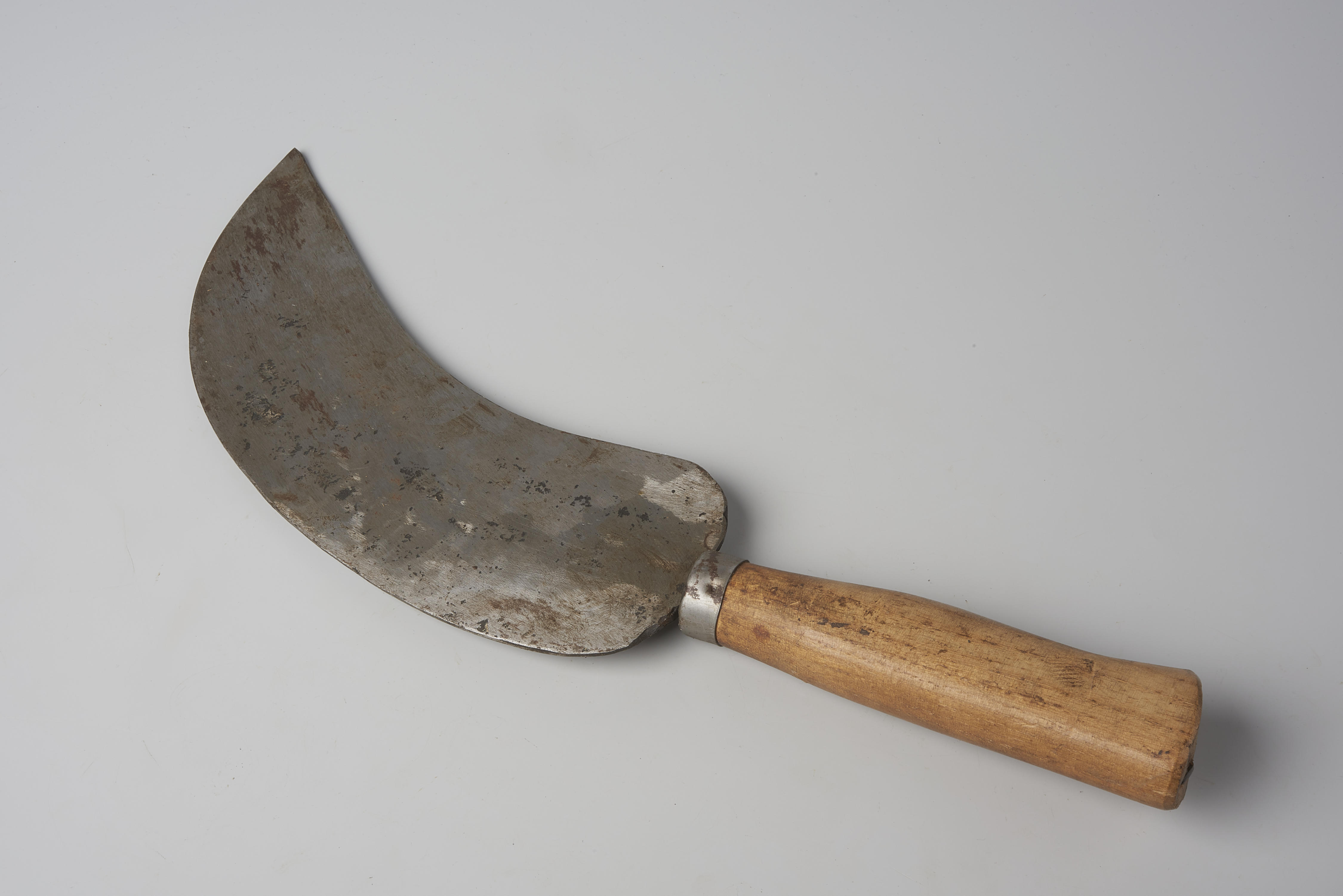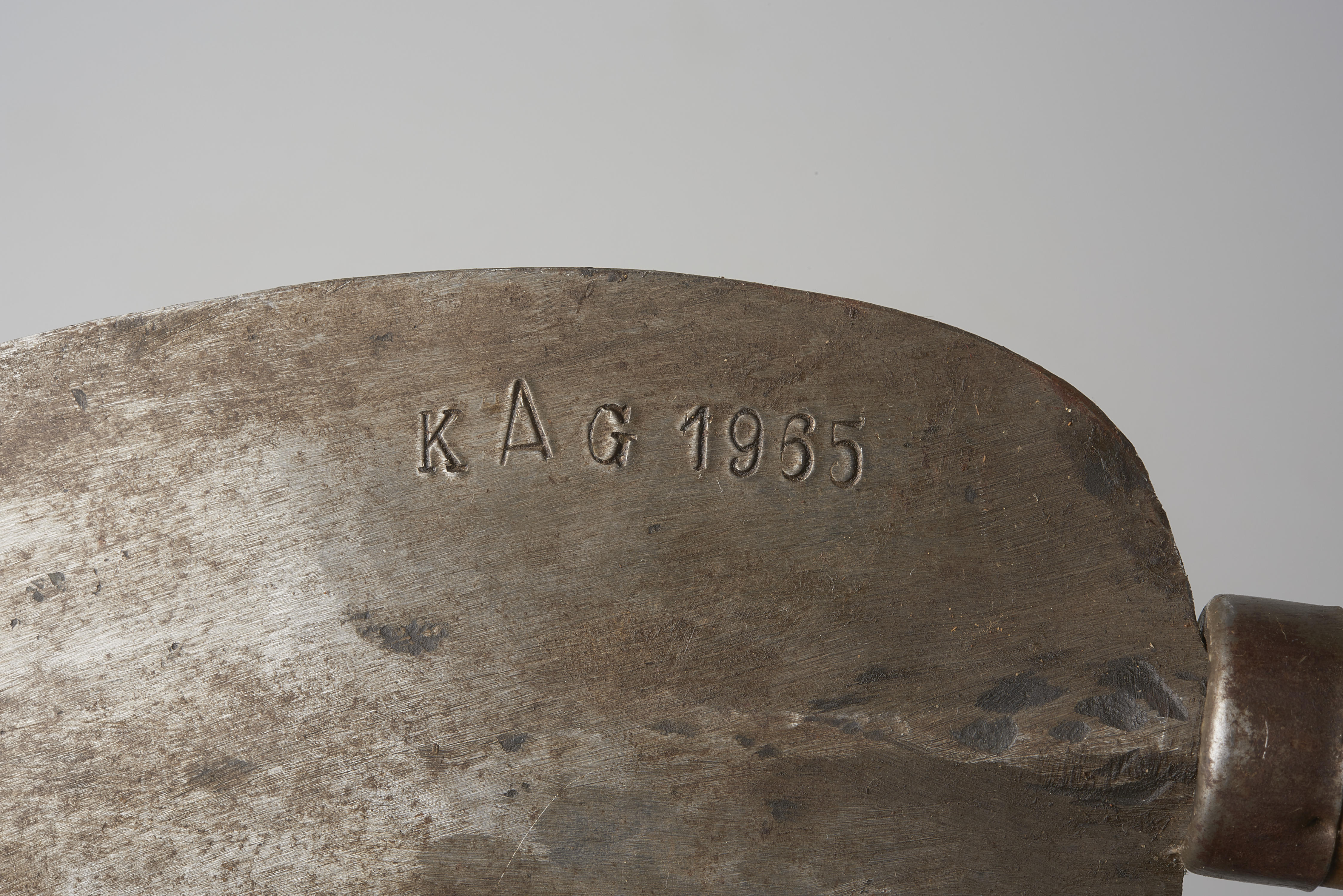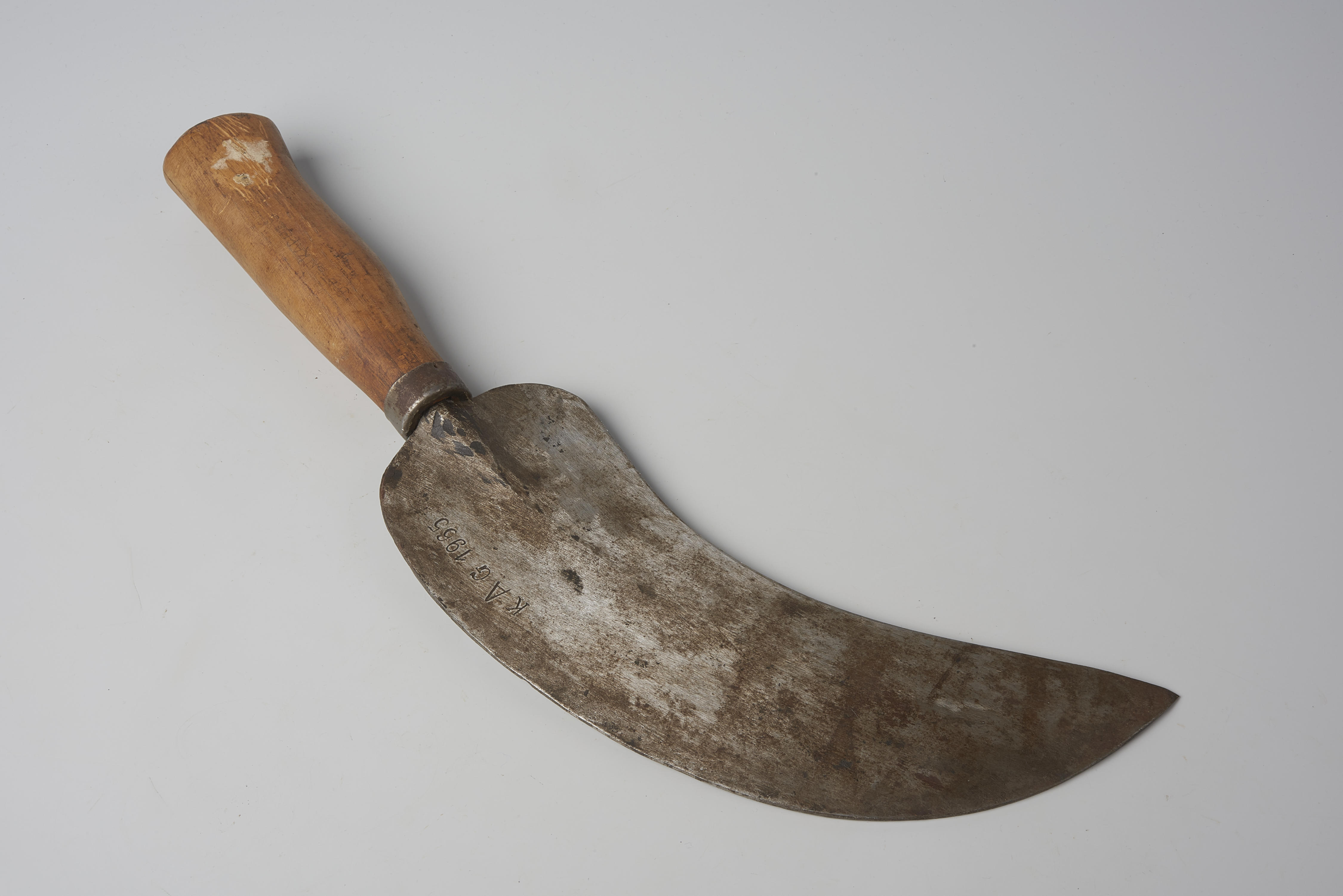 Kapmes voor het afhakken van de koppen van suikerbieten. Het mes heeft een ingeslagen merk: 'K[rijn] A[rie] G[roeneweg] 1965'.