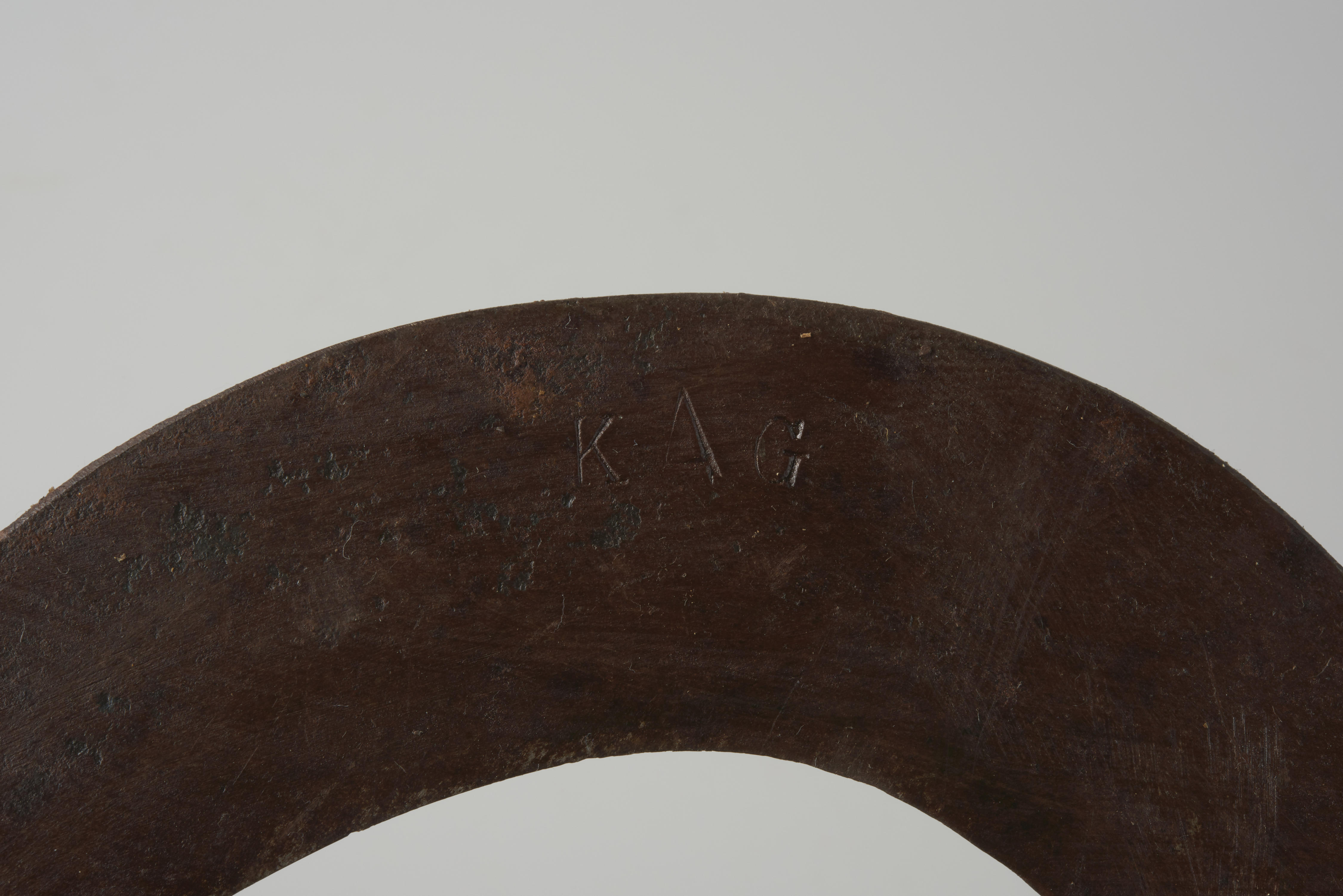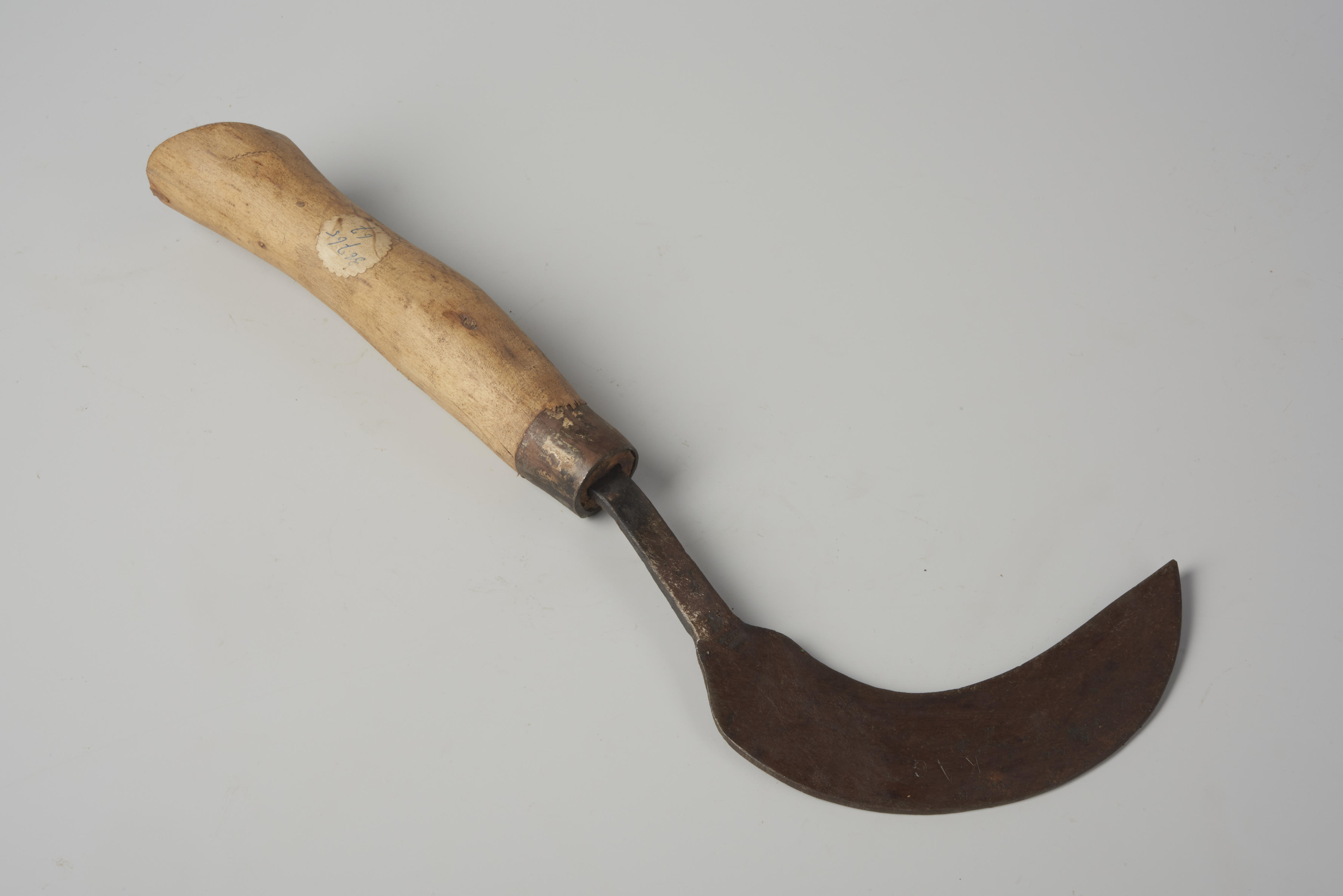 Bandhaak, rijswerkersgereedschap voor het snijden van dunne tenen voor het binden van allerlei bossen en planten. Het mes heeft een ingeslagen merk: 'K[rijn] A[rie] G[roeneweg].