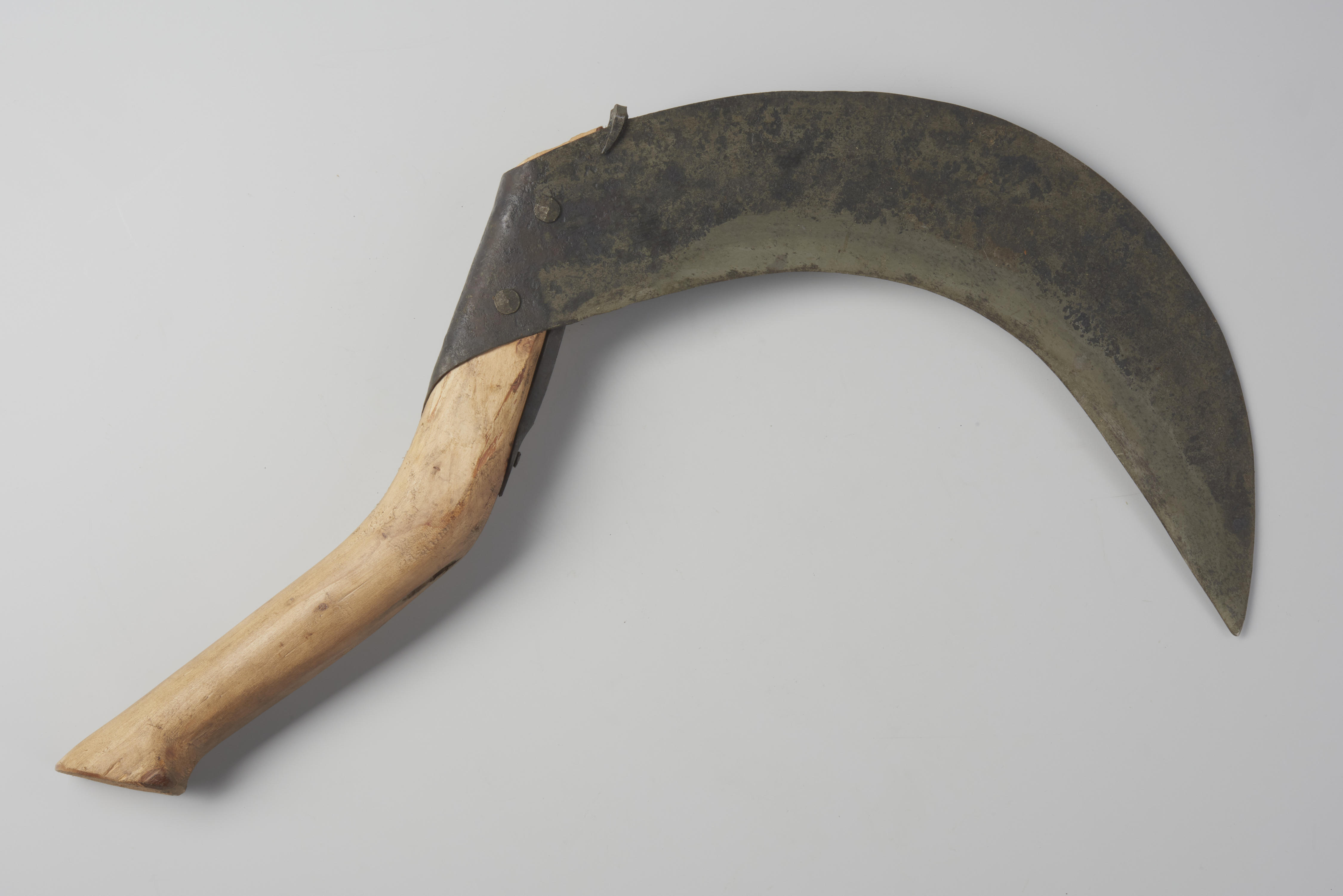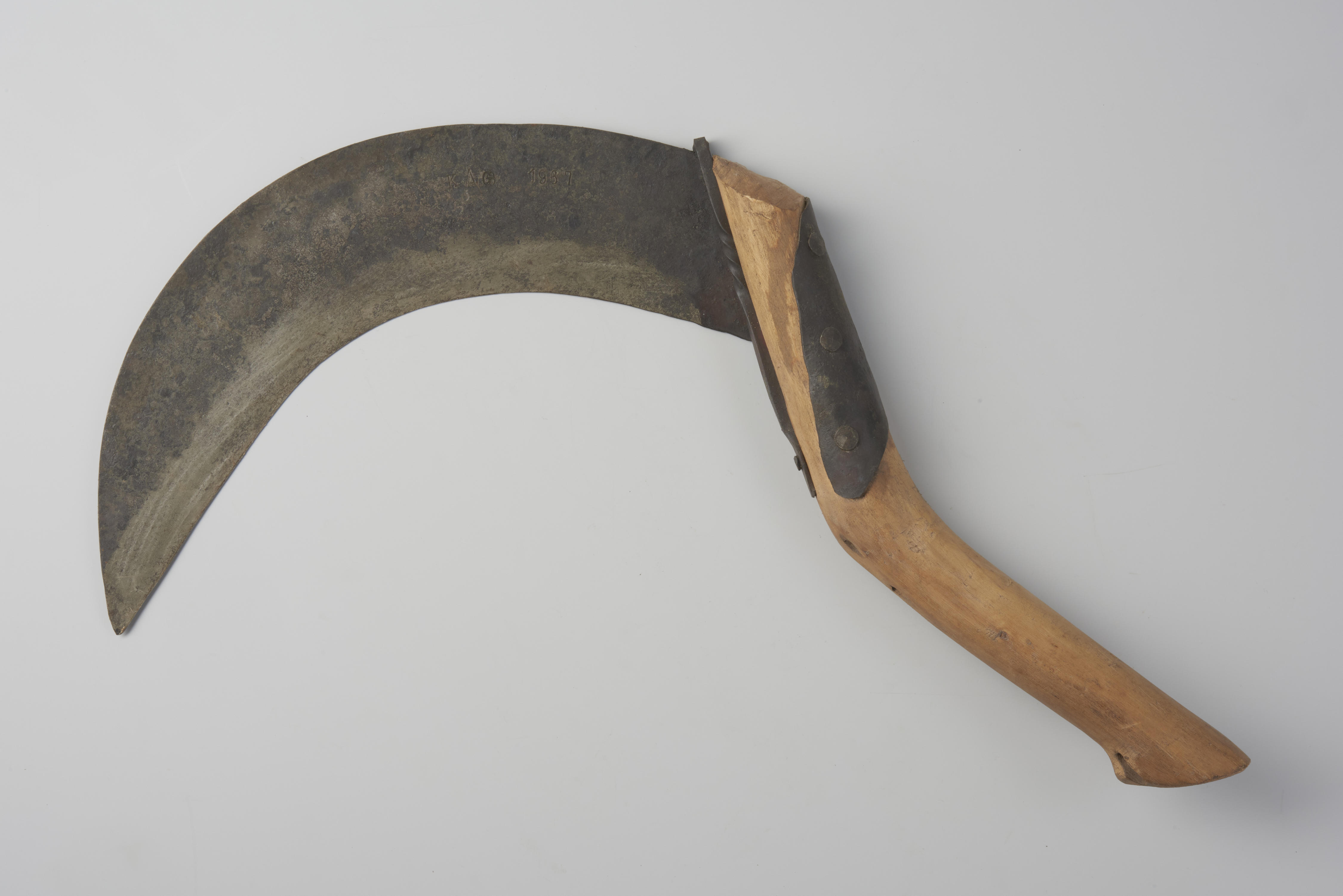 Riethaak, gebruikt voor het snijden van riet. Het mes heeft een ingeslagen merk: 'K[rijn] A[rie] G[roeneweg] 1967'.