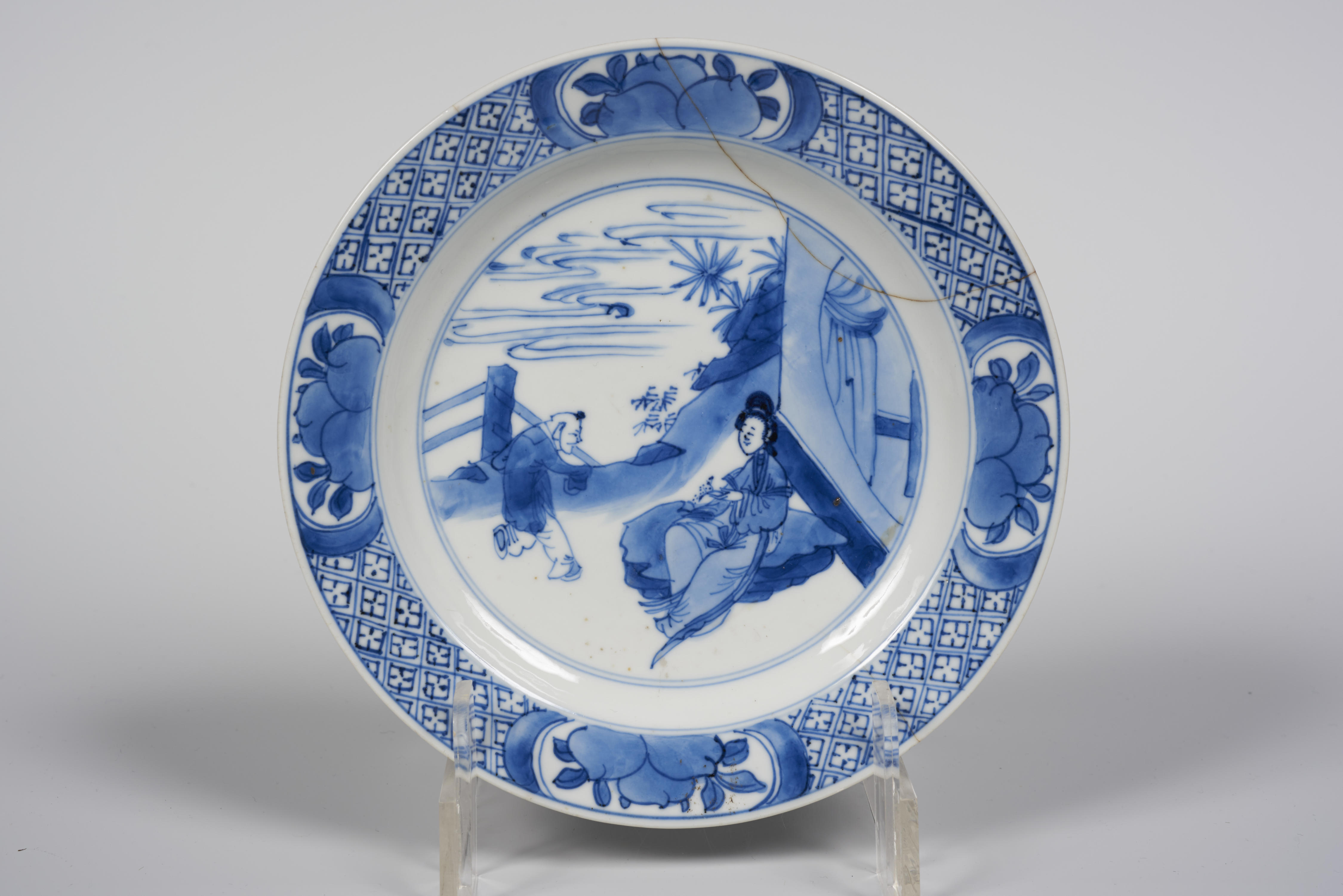 Bord met een voorstelling van een zittende vrouw en een lopende man in een landschap. De rand van het bord is versierd met geometrische en bloemmotieven.