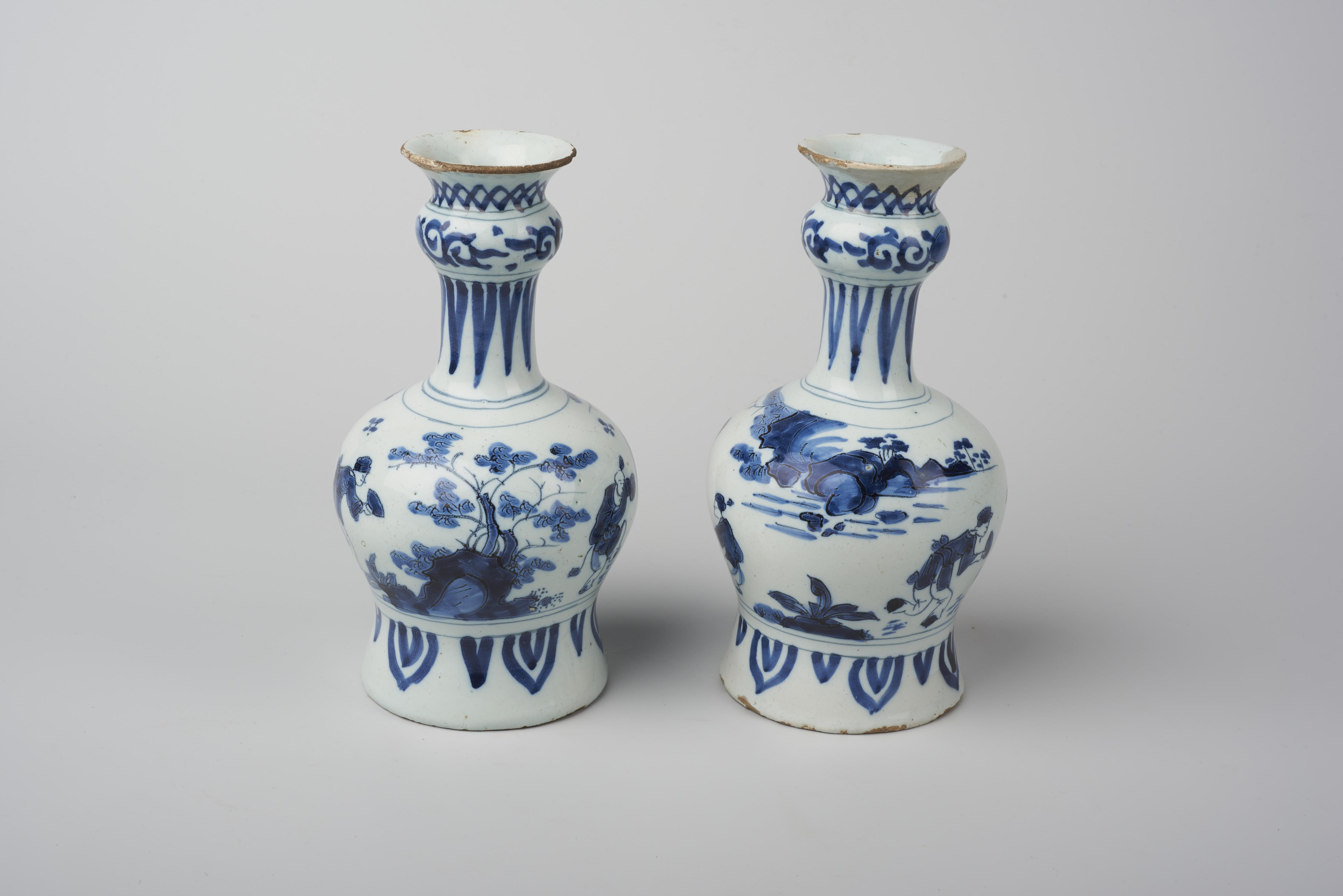 Twee knobbelvazen, beide versierd met een voorstelling van drie mannen met een buffel in een landschap en geometrische randornamenten. De vorm en de versiering van de twee knobbelflesjes zijn ontleend aan Chinees porselein uit de overgangsperiode (1620-1682).