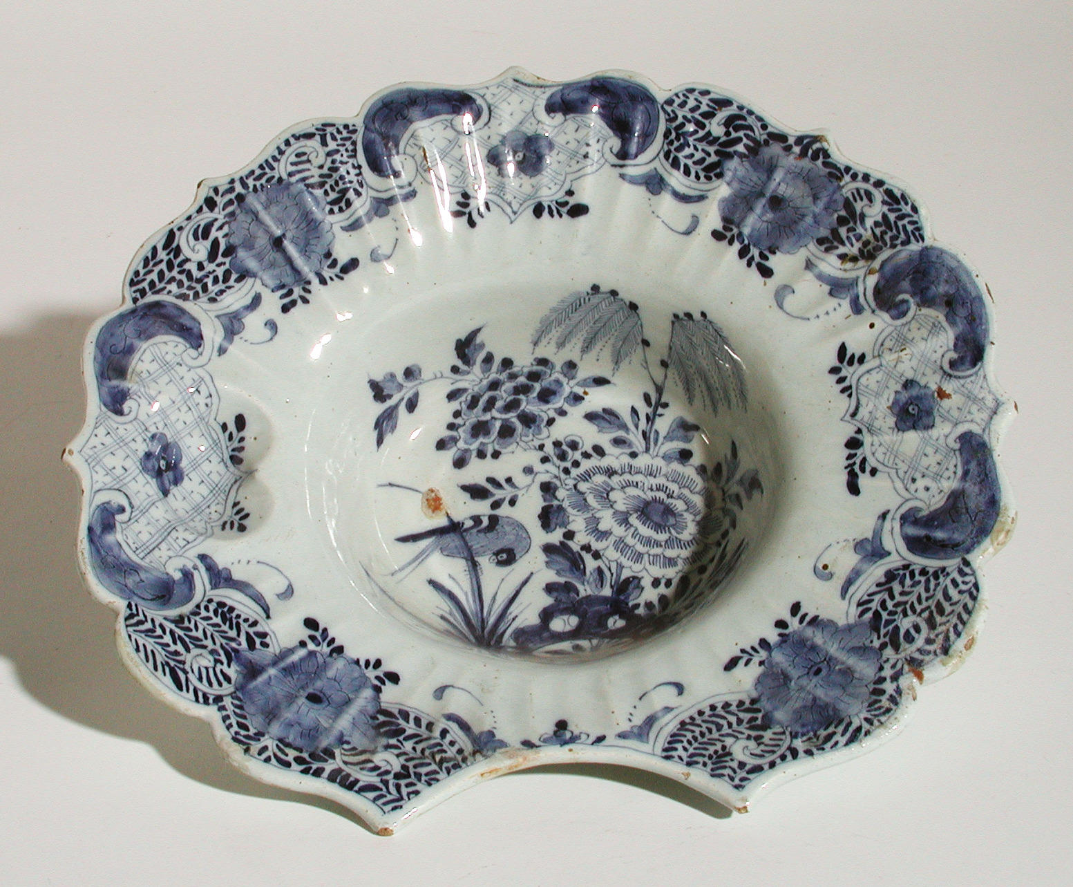 Scheerbekken met een randversiering van wolkenmotieven en bloem- en bladornamenten. Op het middenvlak staat een voorstelling van bloeiende planten en een vogel.