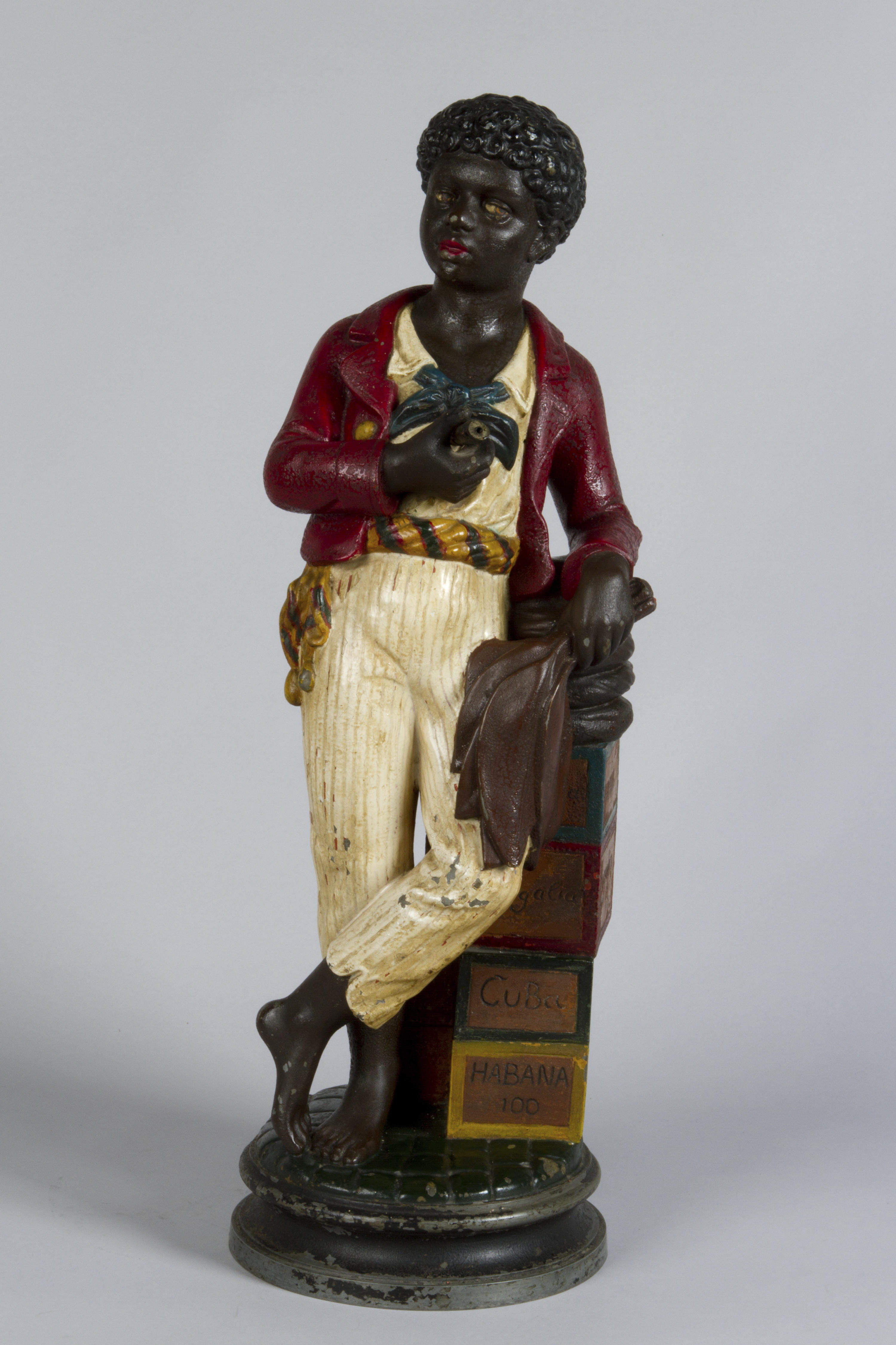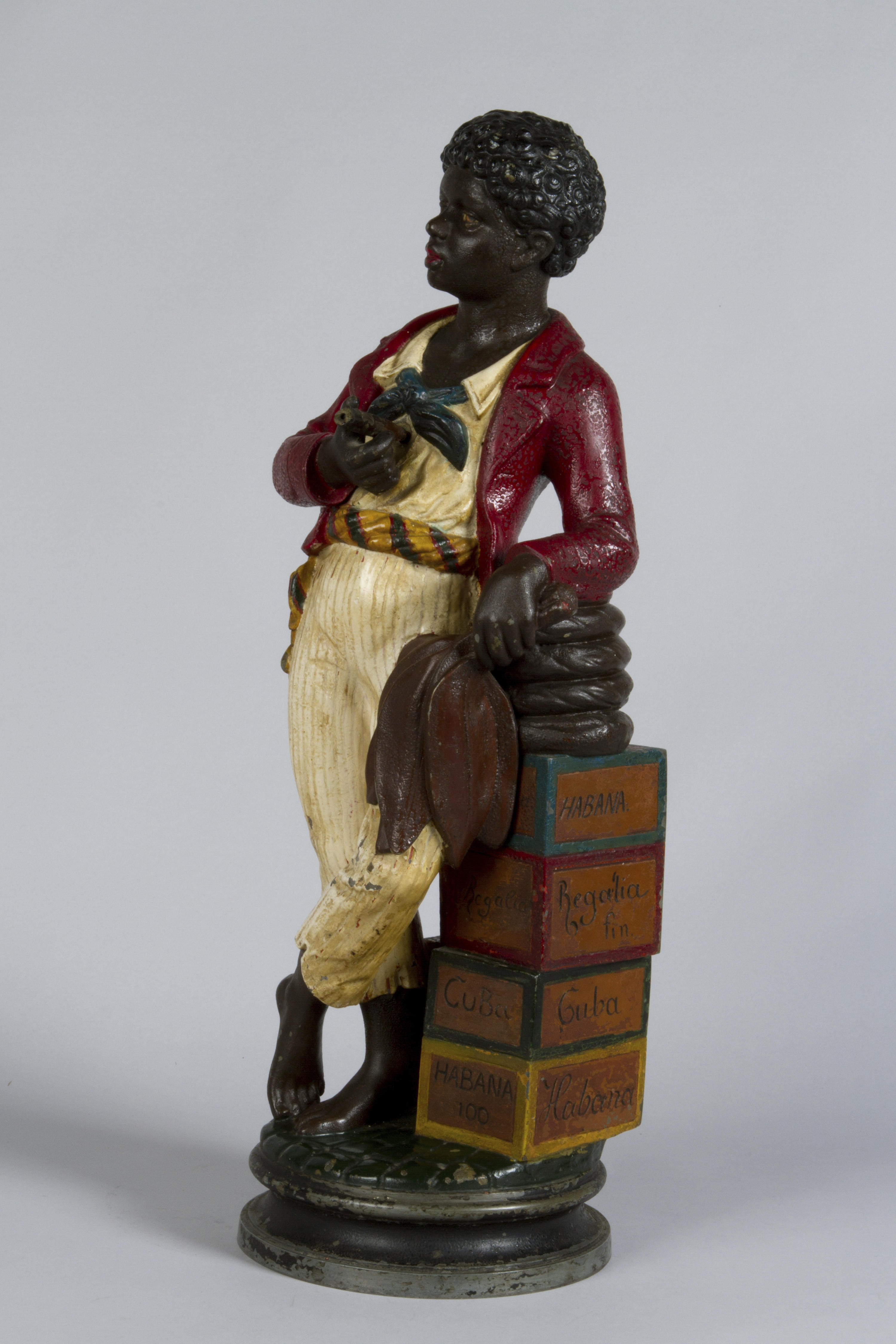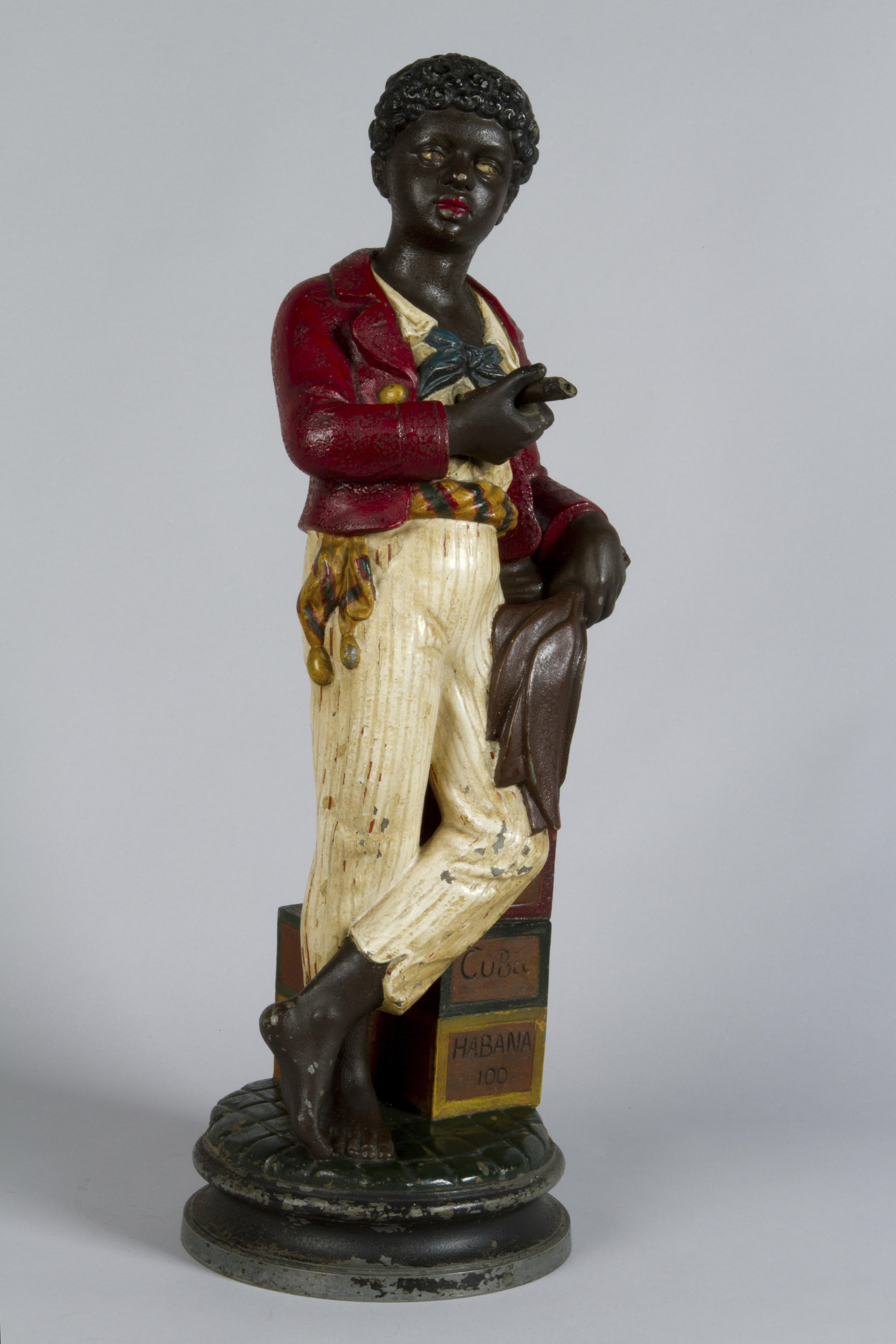 Toonbankbeeld uit een tabakswinkel, voorstellende een man met een sigaar in de hand. Hij leunt op vier tabakskisten met van boven naar beneden de namen ‘Habana’, ‘Regalia fin’, ‘Cuba’ en ‘Habana’. De sigaar die de man in zijn rechterhand houdt, is aangesloten op een gasleiding die door zijn borst en lichaam loopt en in het ...