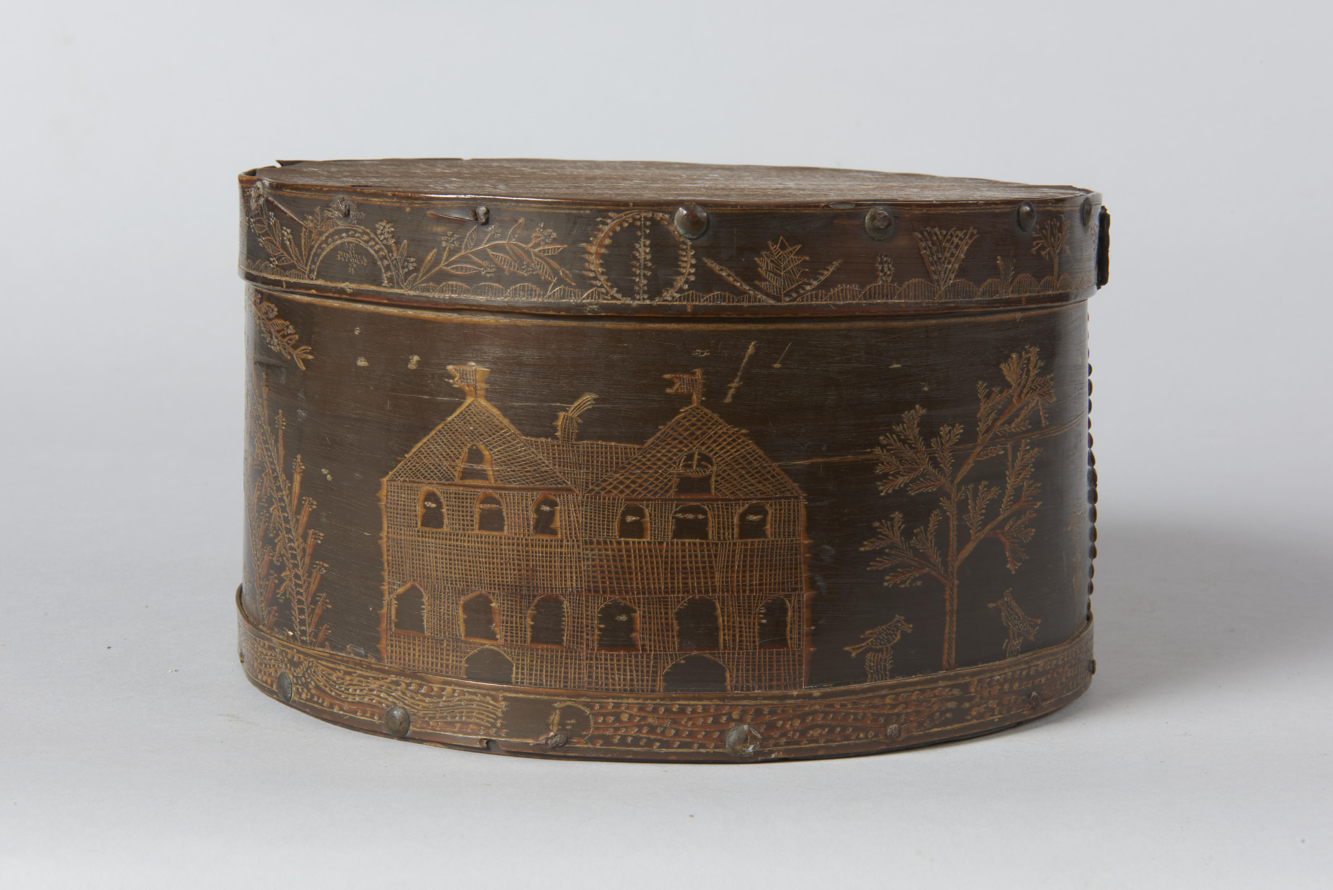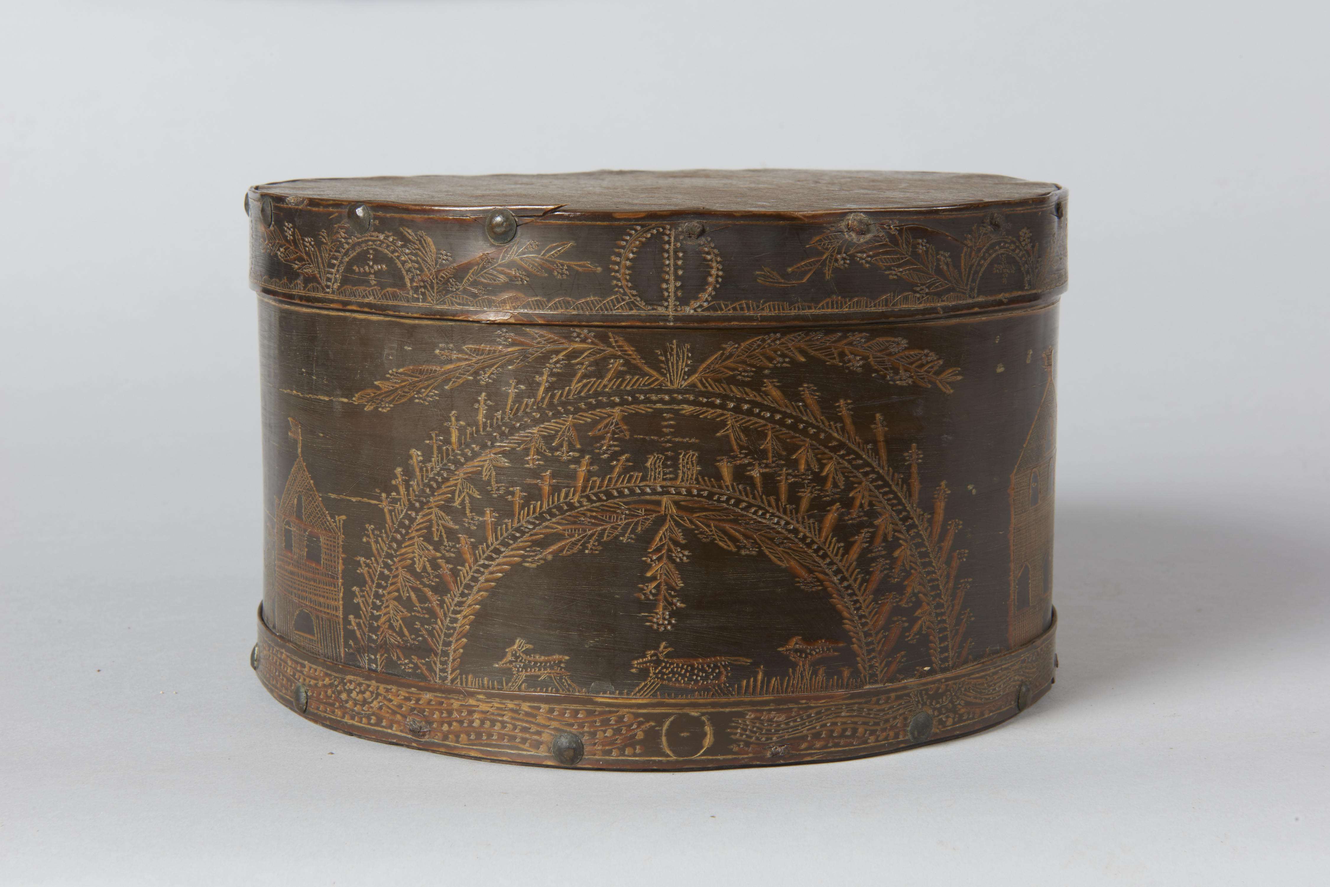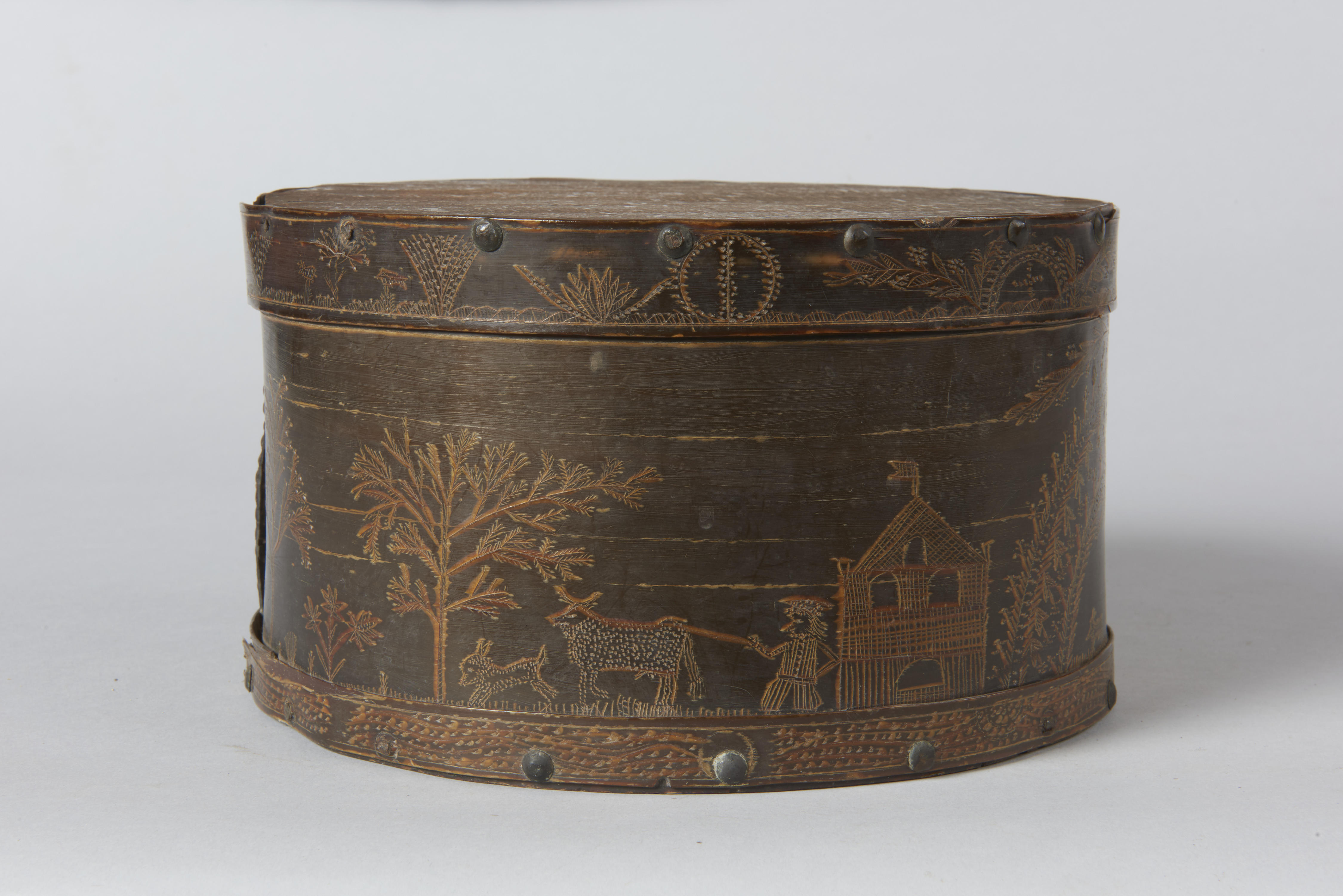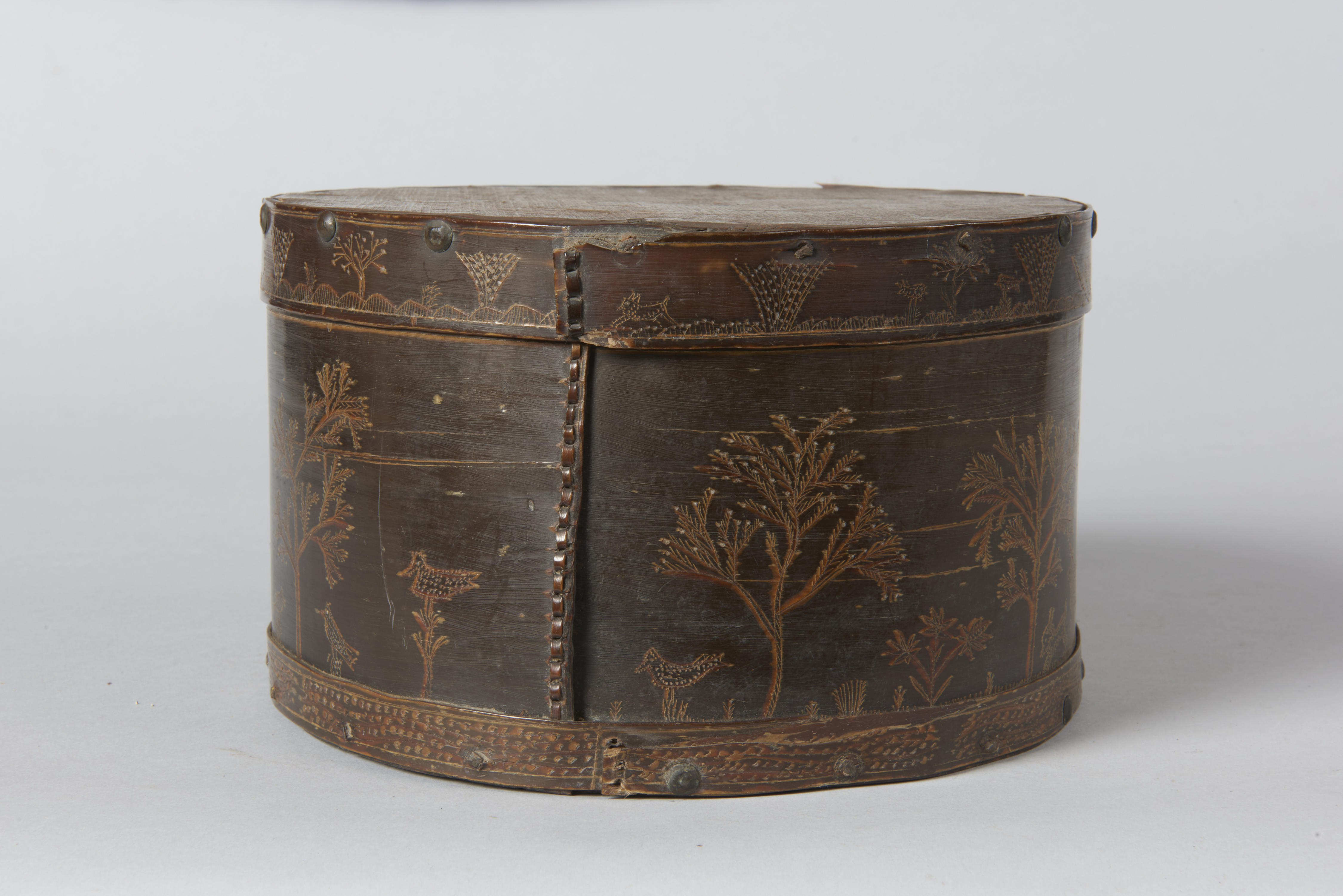 Ronde spanen doos met oversluitende deksel. De zijwand is van walvisbalein. De bodem en de bovenzijde zijn van beukenhout. De ingesneden decoratie bestaat uit runderen met een herder, een groot en een klein huis, bomen, vogels en een grote boog met bladmotieven.