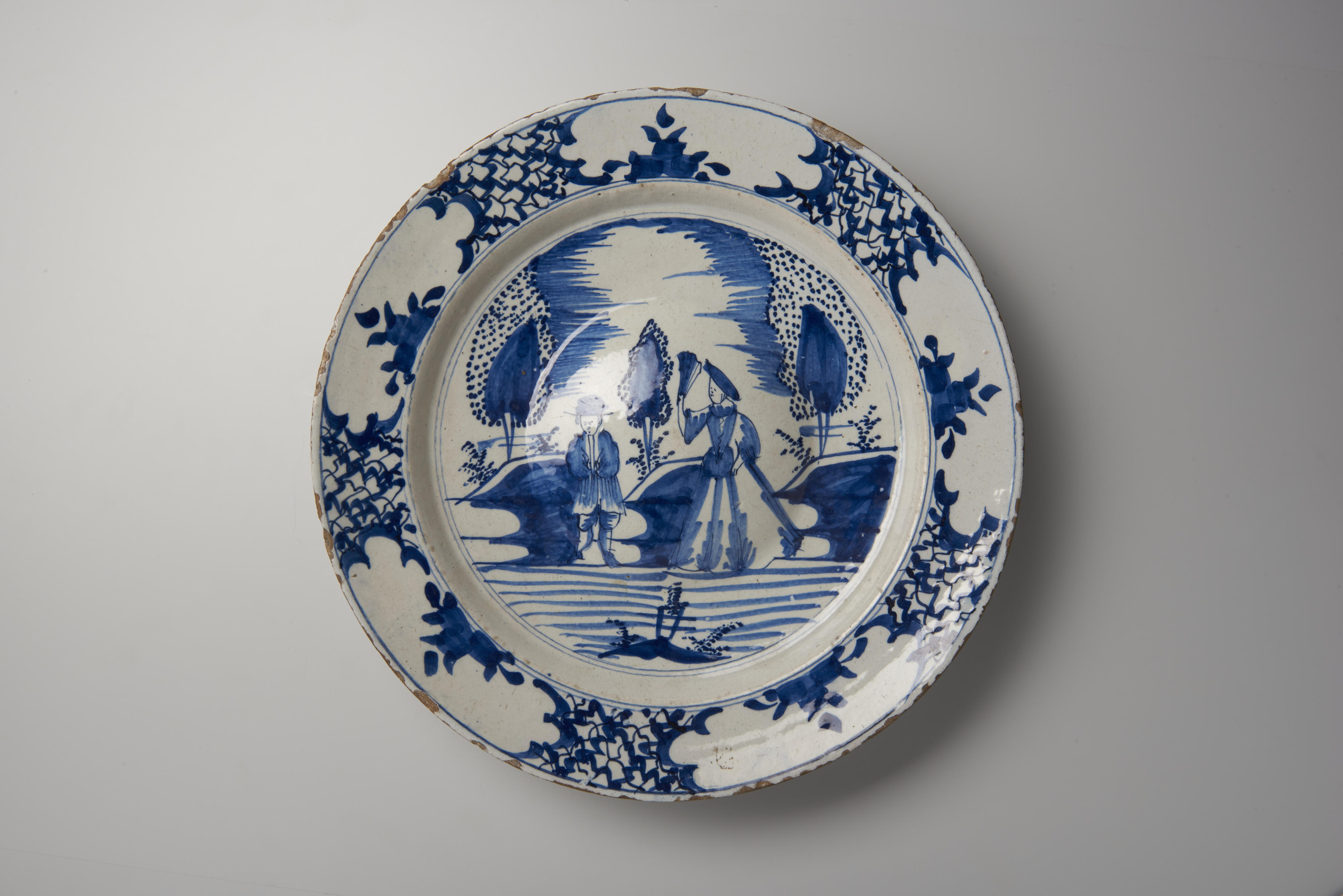 Schotel, zogenaamde sla- of pannenkoekschotel, met geometrische ornamenten aan de rand en in het midden een afbeelding van een dame met waaier en een jongen in de tuin.