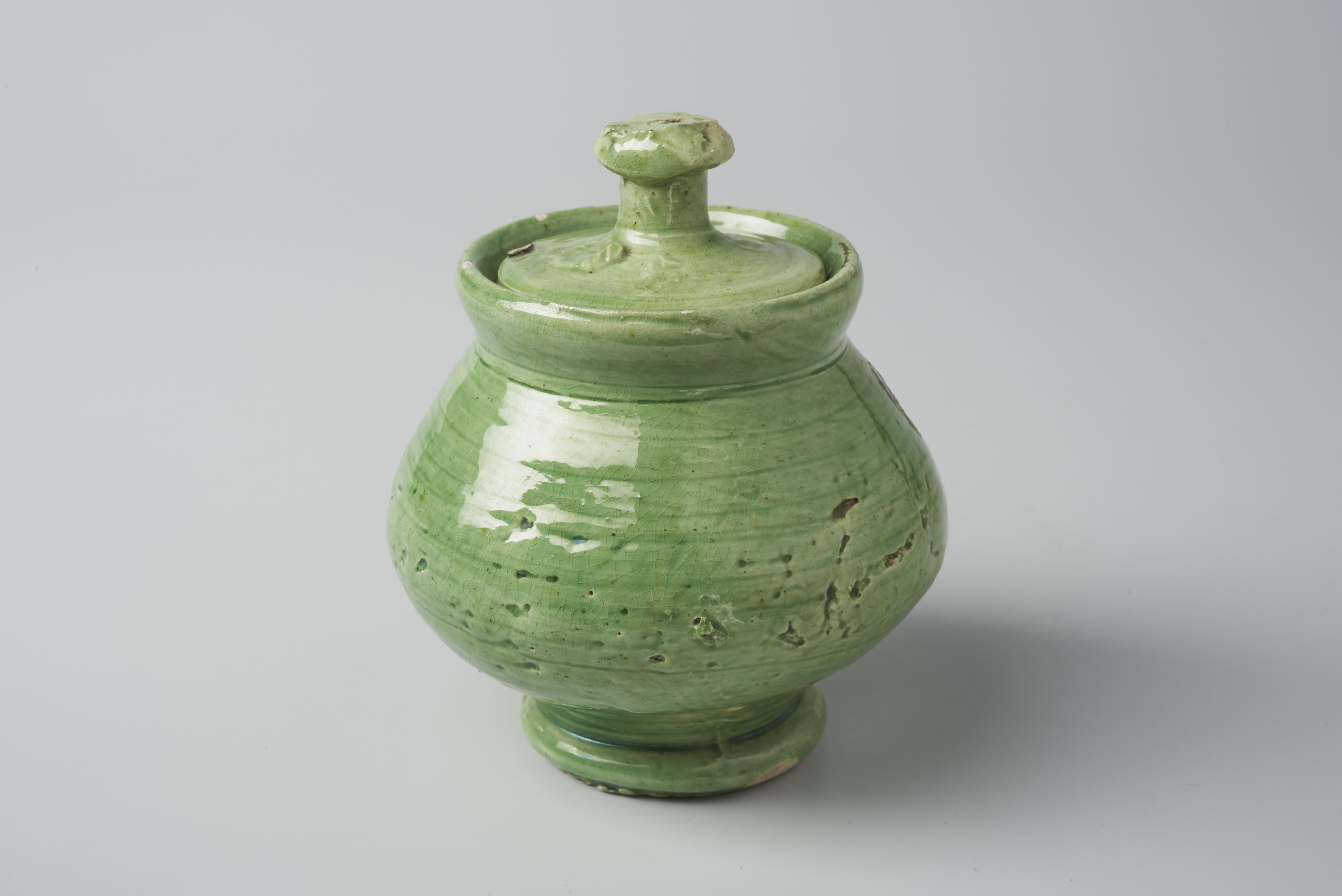 Groen geglazuurde speelgoedsuikerpot van Goedewaagen. Deze suikerpot is onderdeel van een kinderservies dat wordt aangeboden in de Goedewaagen Star catalogus uit 1910. De vormgeving gaat terug op algemene archaïsche vormen en eeuwenoude modellen van Nederlands gebruiksaardewerk. Het servies is Gouds-groen geglazuurd.