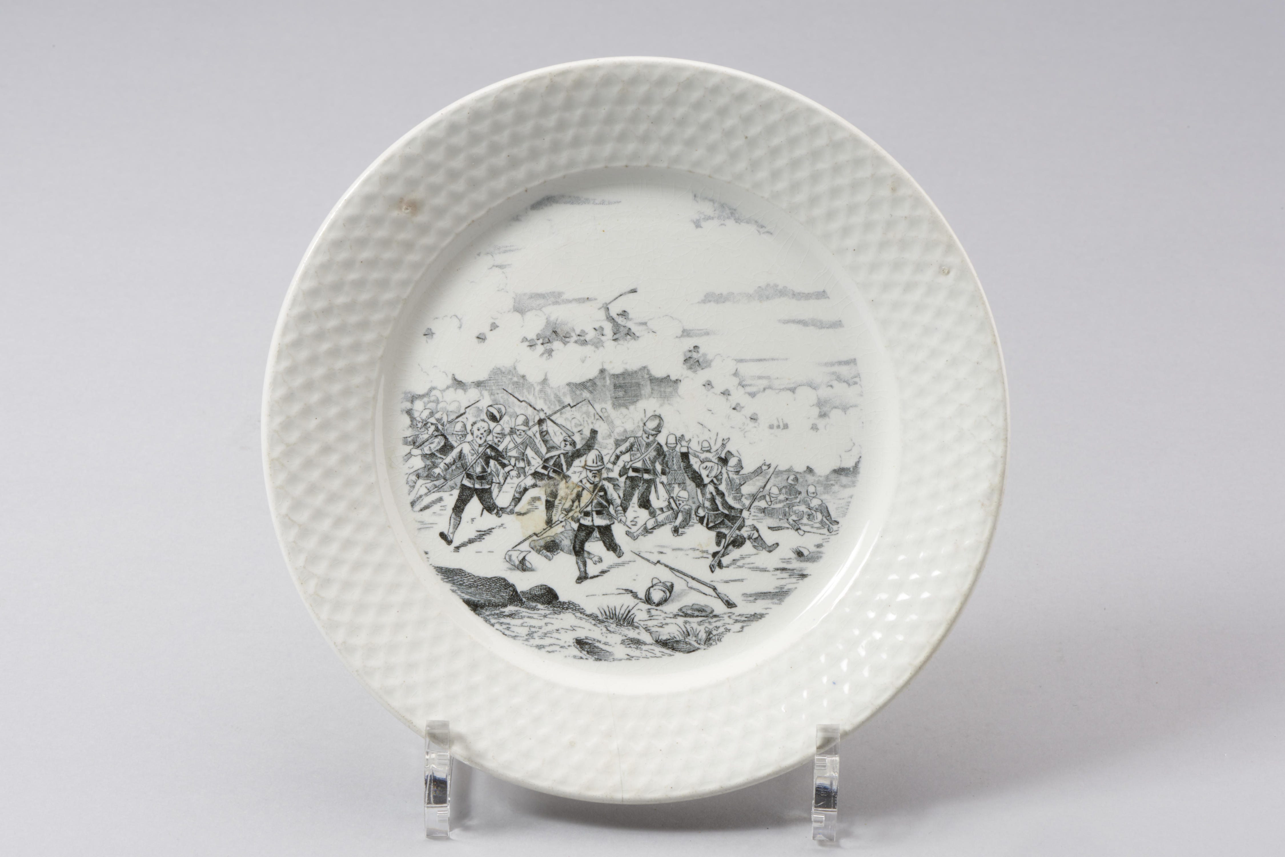 Bord van Engels aardewerk met een tafeel uit de Boerenoorlog (1899-1902) in Zuid-Afrika.