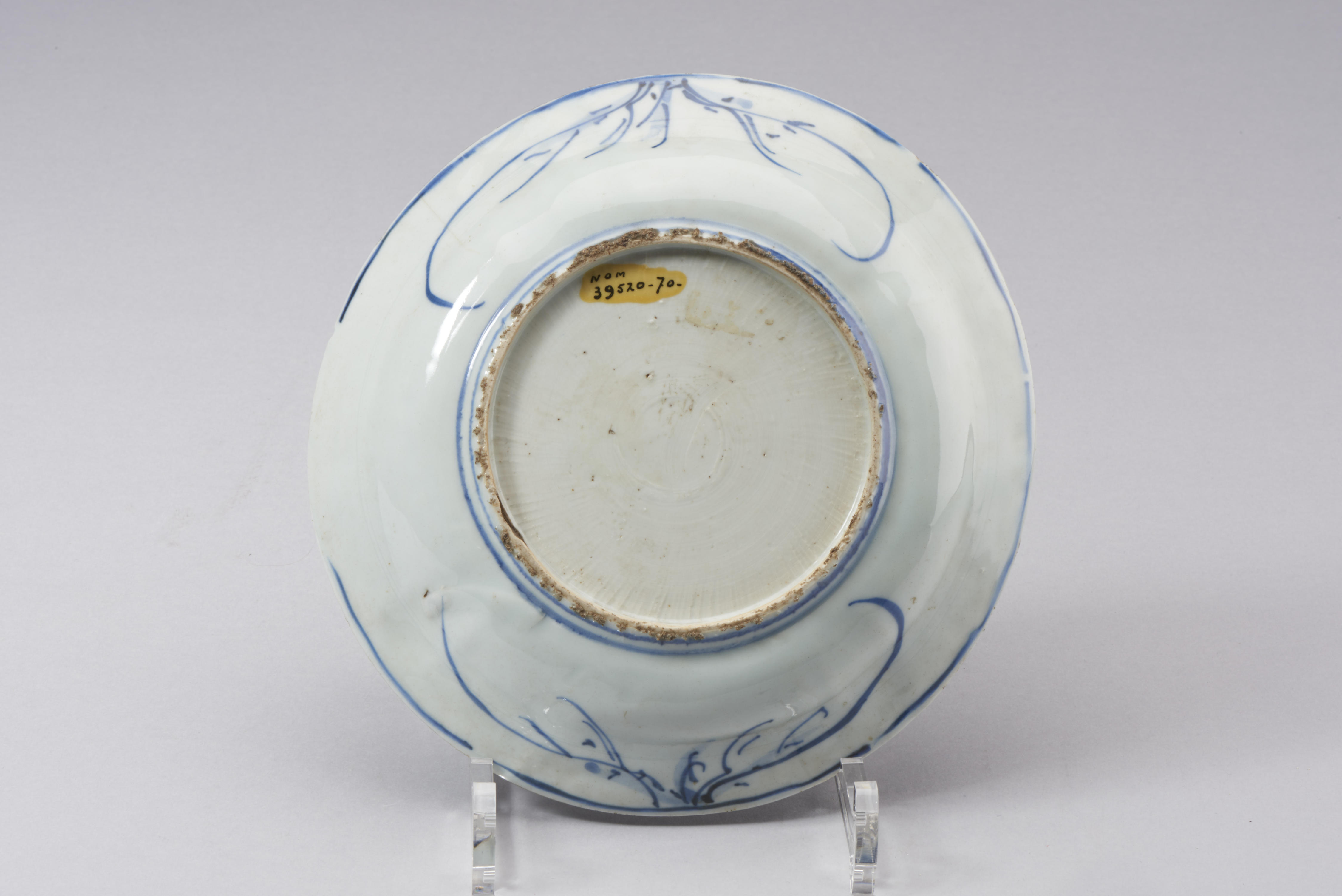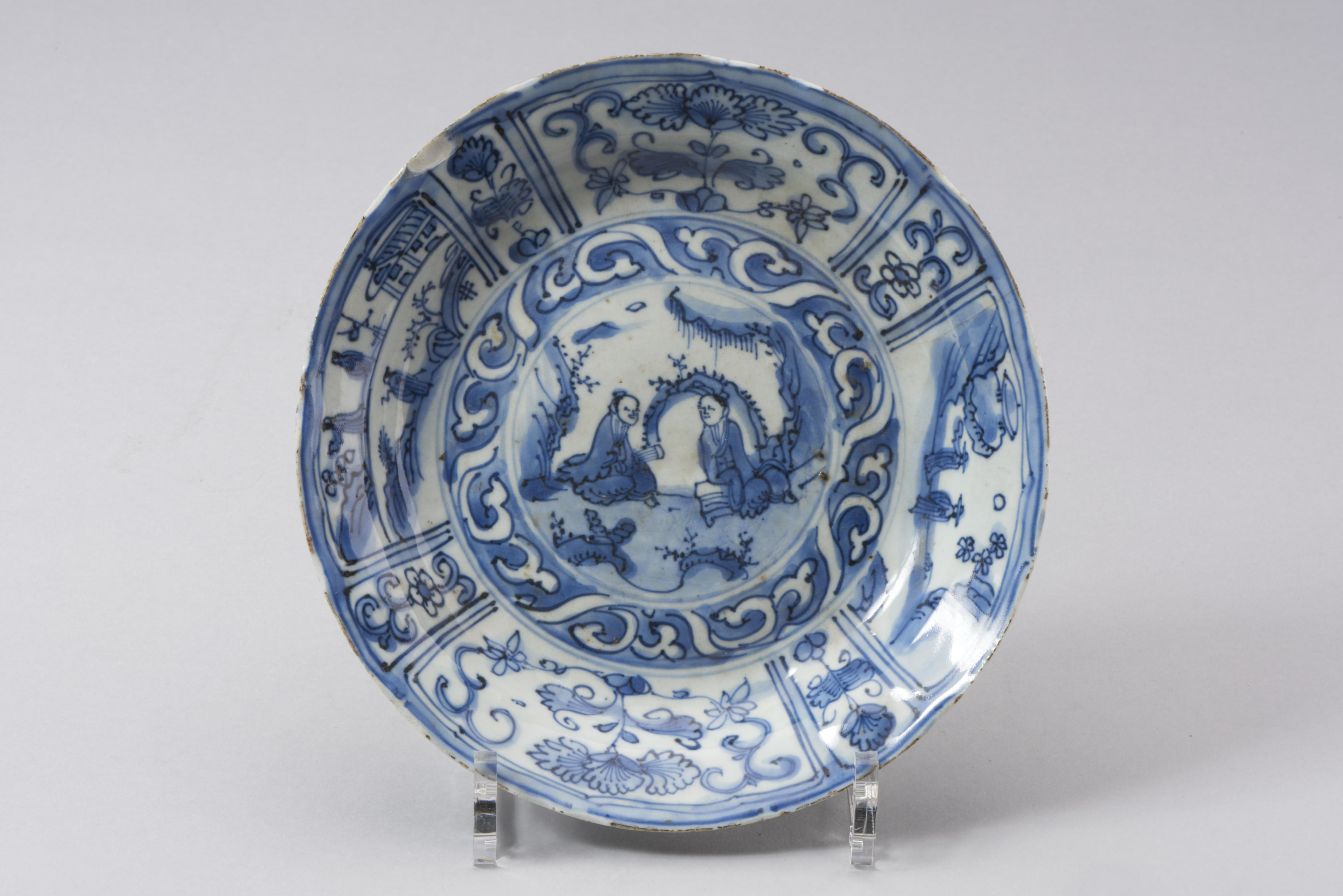 Bord met een voorstelling van twee zittende mensfiguren in een landschap. De rand van het bord is versierd met afbeeldingen van mensfiguren in landschappen en bloemen.