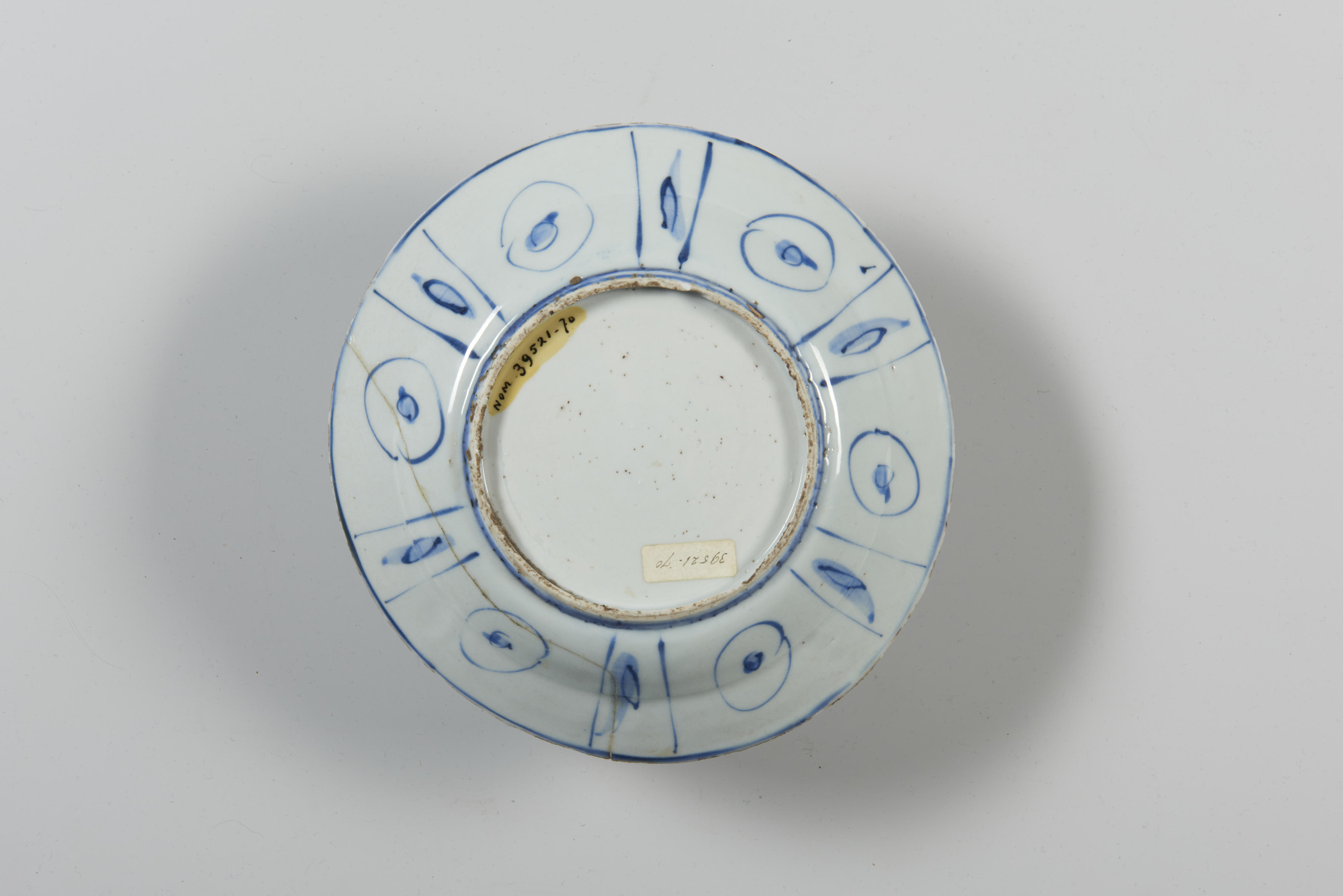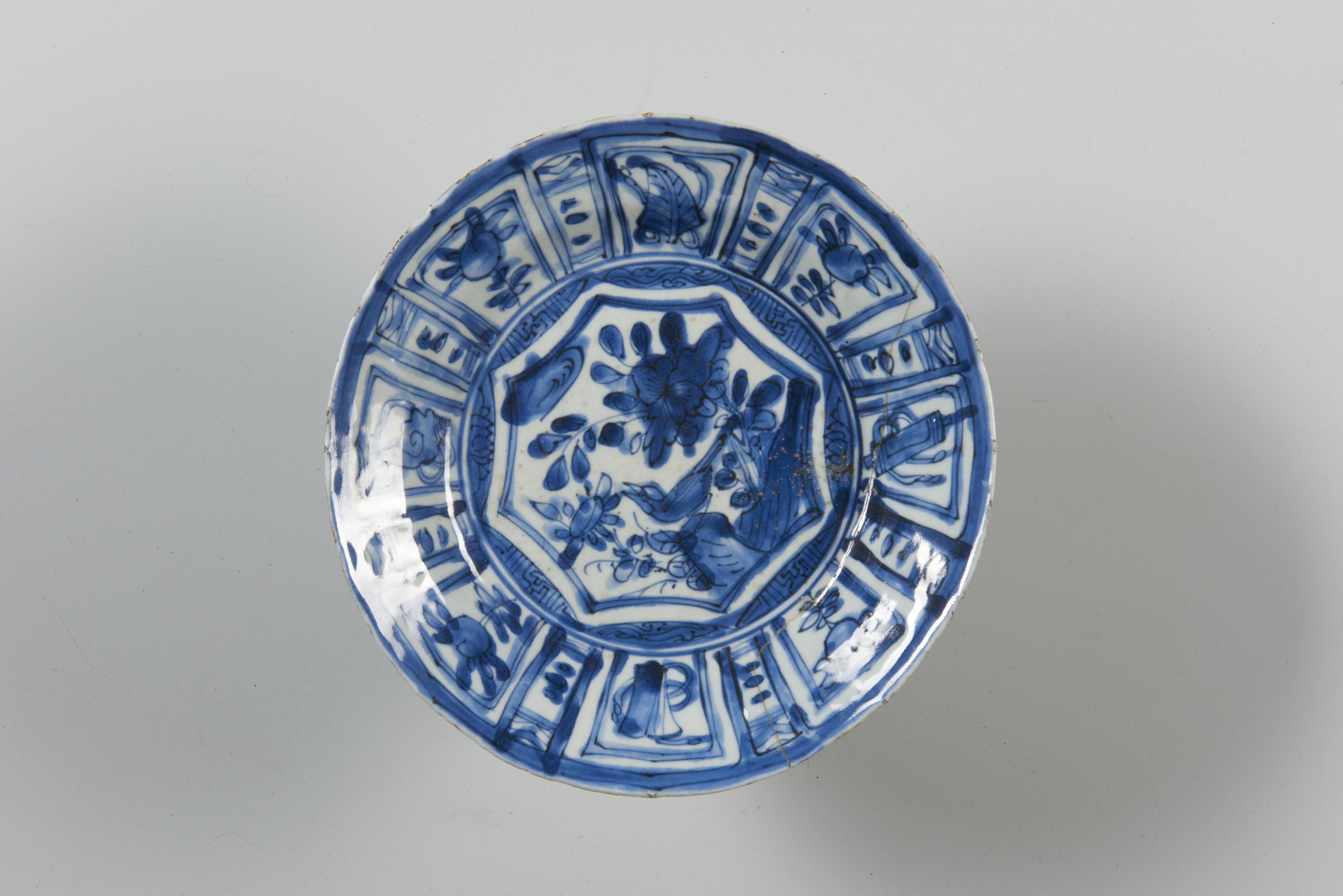 Bord met een voorstelling van bloemen en een vogel. De rand van het bord is versierd met verschillende afbeeldingen.