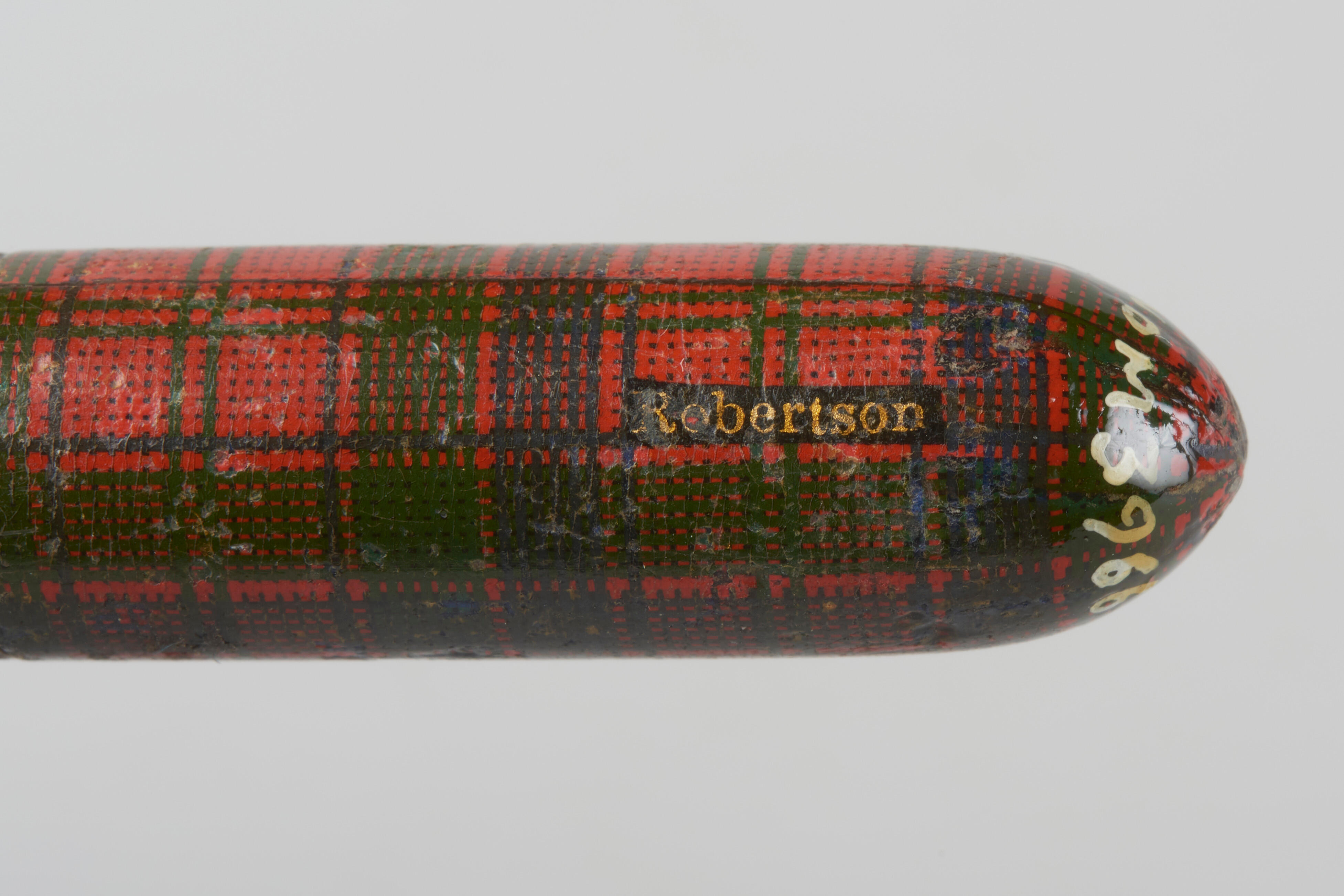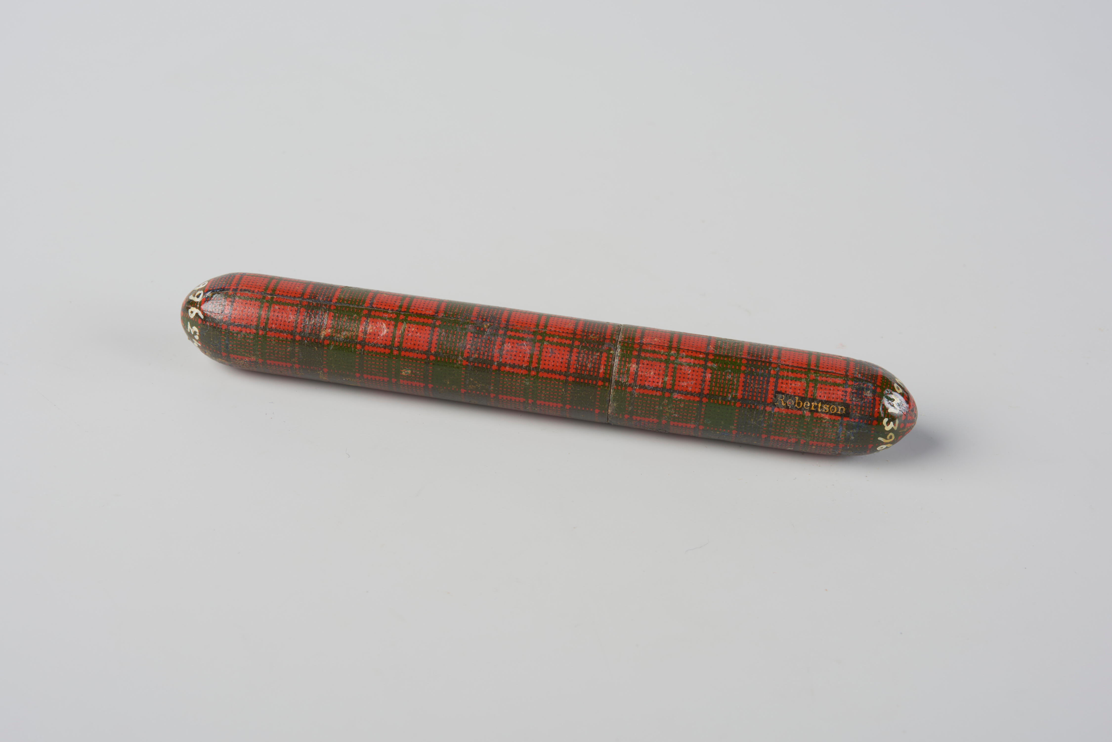 Naaldenkoker van zogenoemd tartanware. Dit zijn kleine houten gebruiksvoorwerpen die zijn beplakt met papier met tartandessin en vervolgens gelakt. Deze naaldenkoker is beplakt met Robertson tartan.