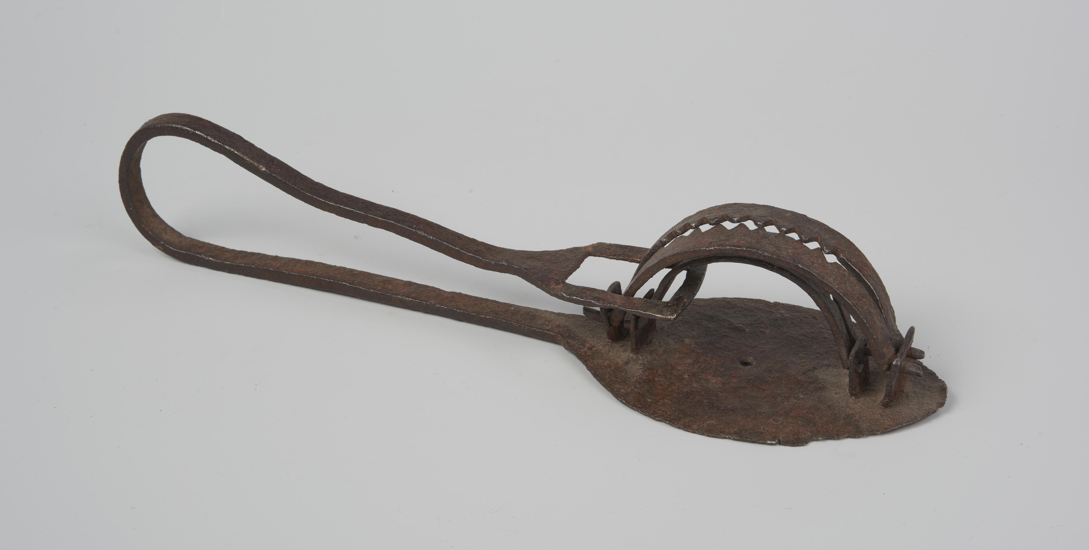 IJzeren klem voor het vangen van wezels en hermelijnen, afkomstig uit Den Haag.