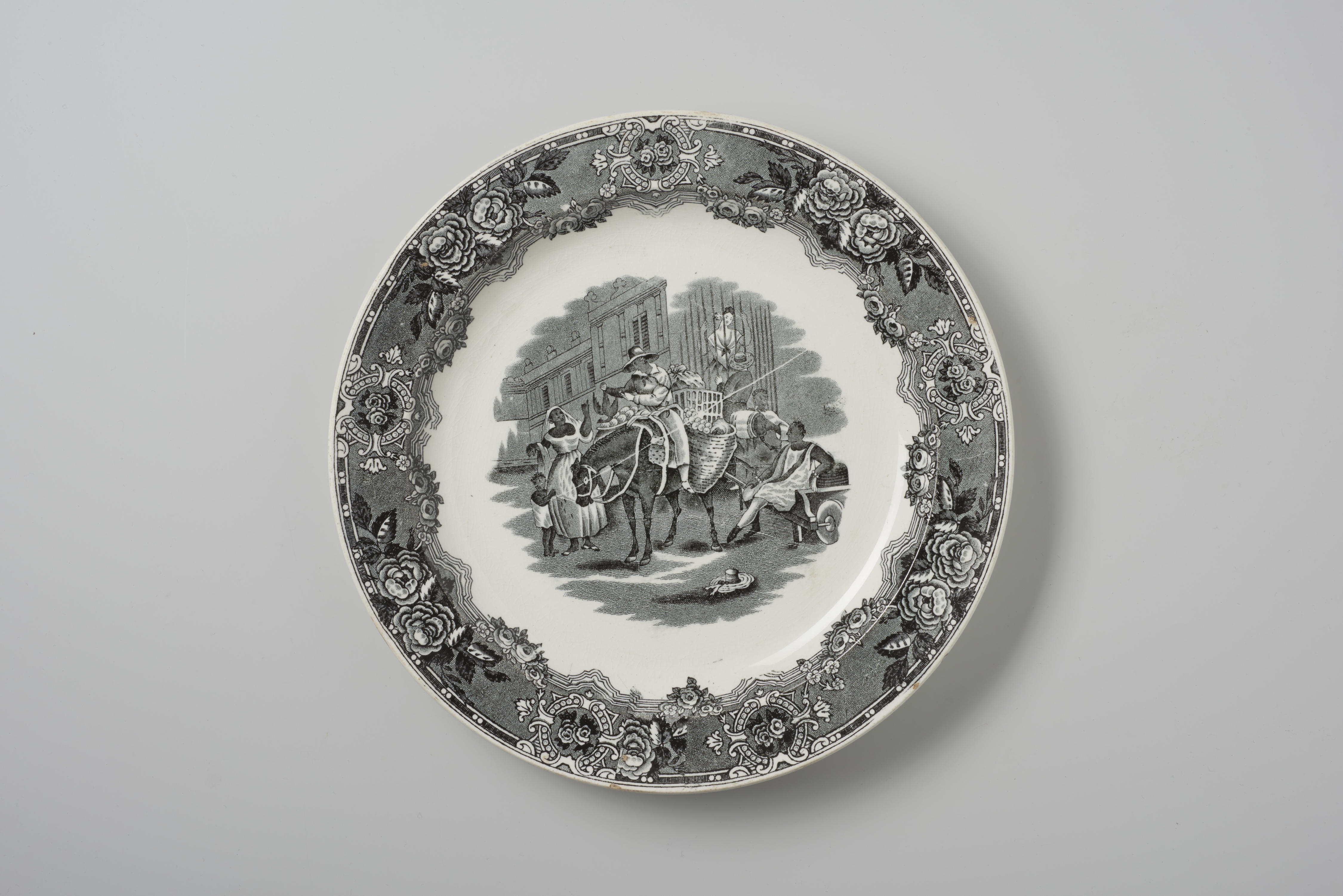 Bord met een voorstelling van een man te paard die een vogel aan een vrouw geeft. Achter de vrouw staat een kind. Op de straat zijn meerdere mensfiguren te zien.