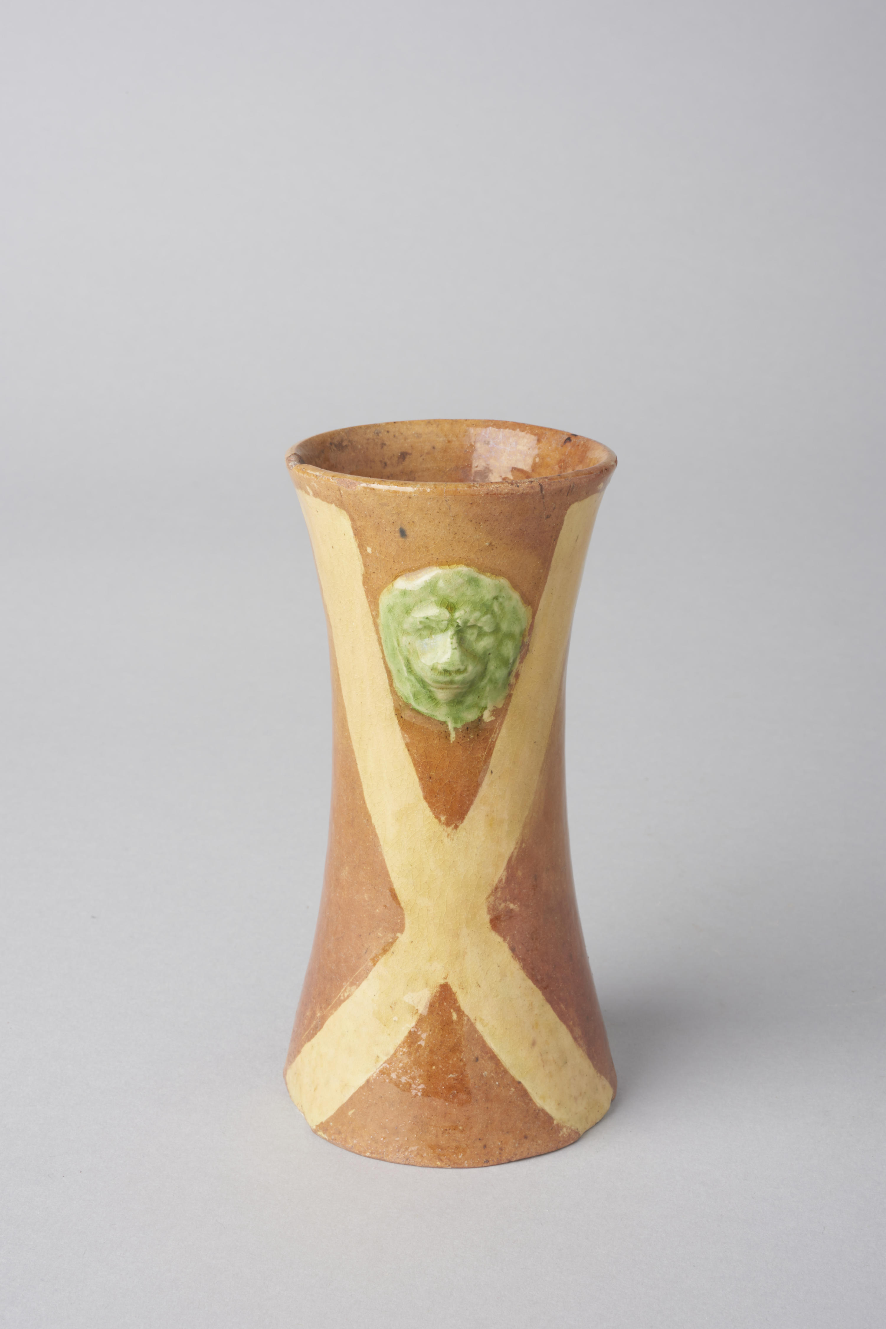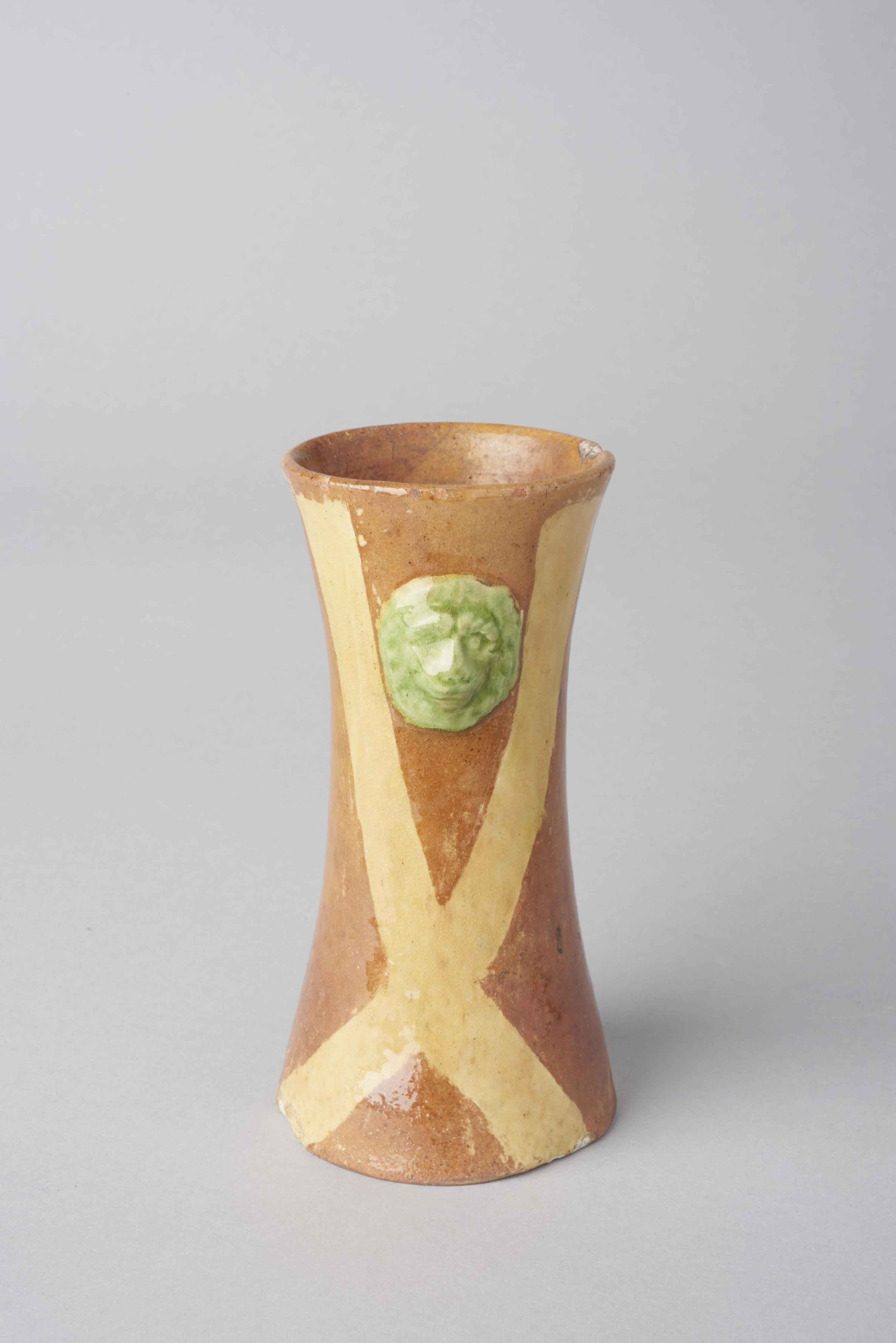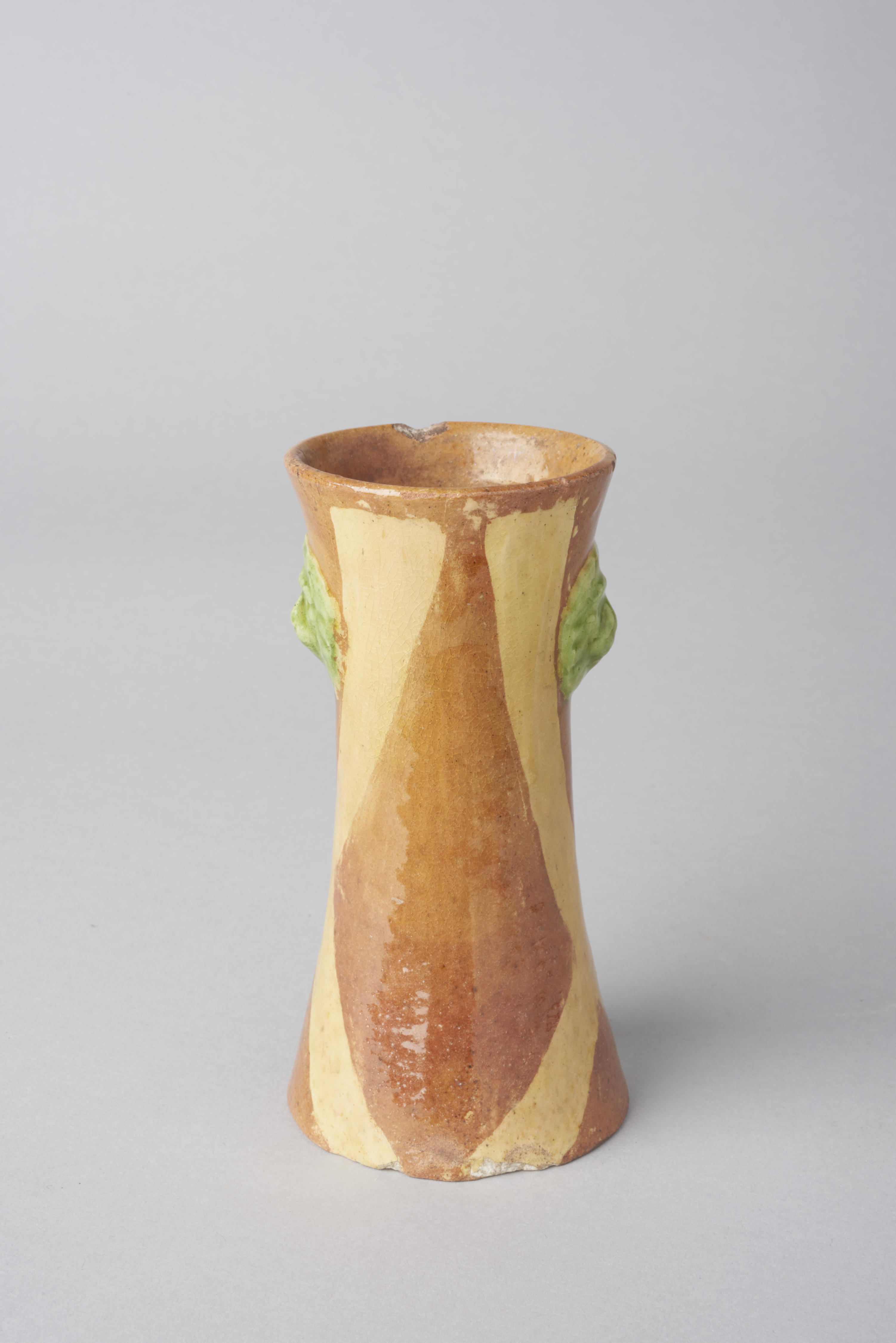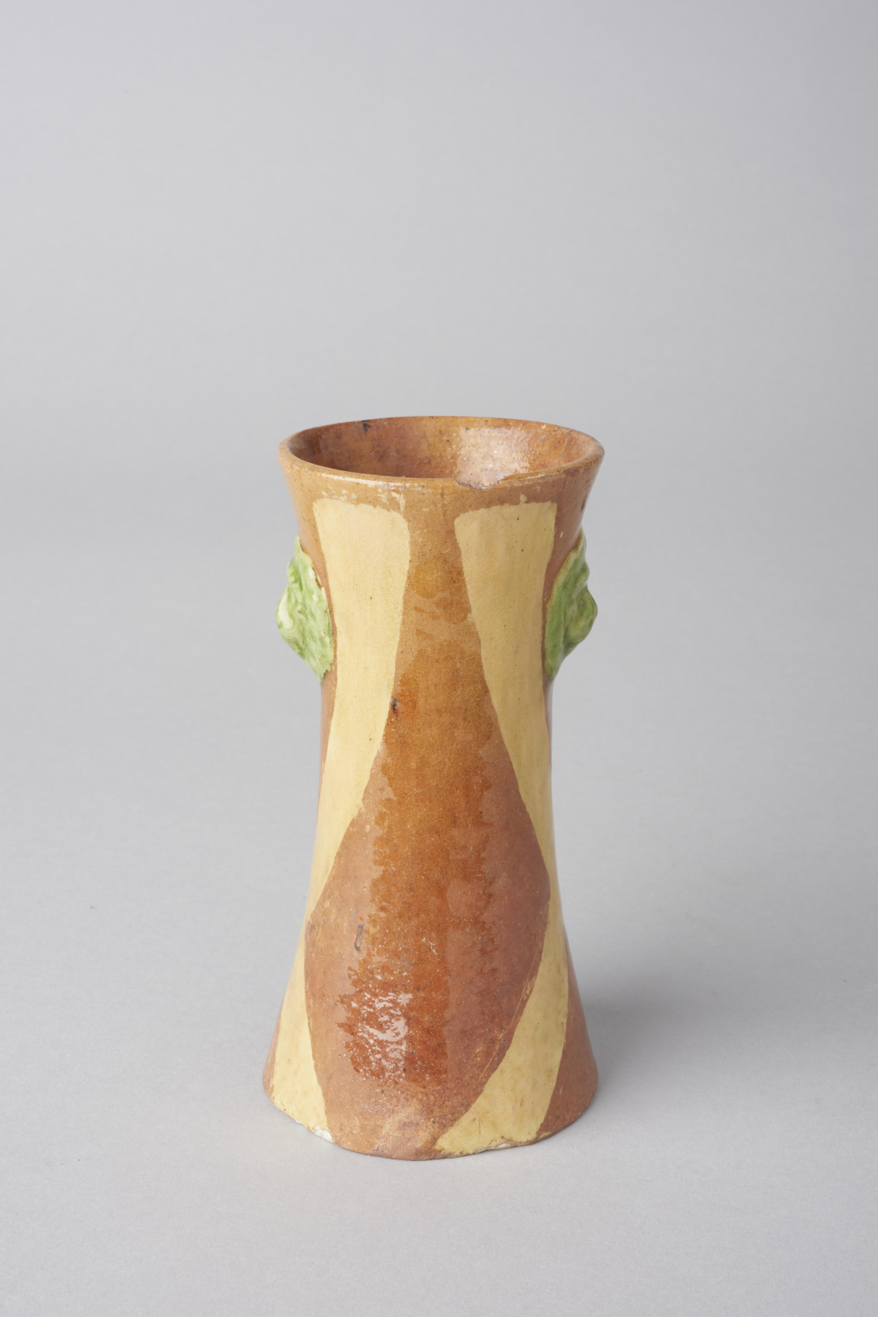Vaasje, versierd met lijnen en twee leeuwenkopjes.
