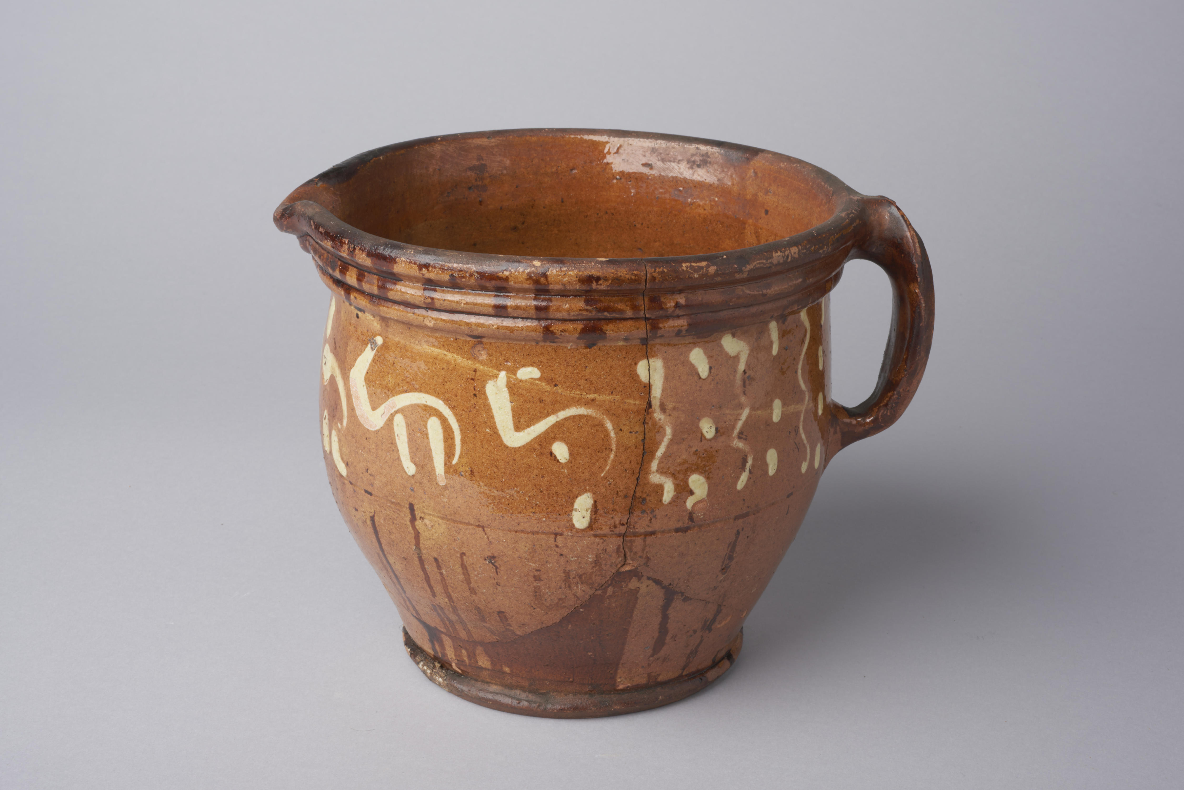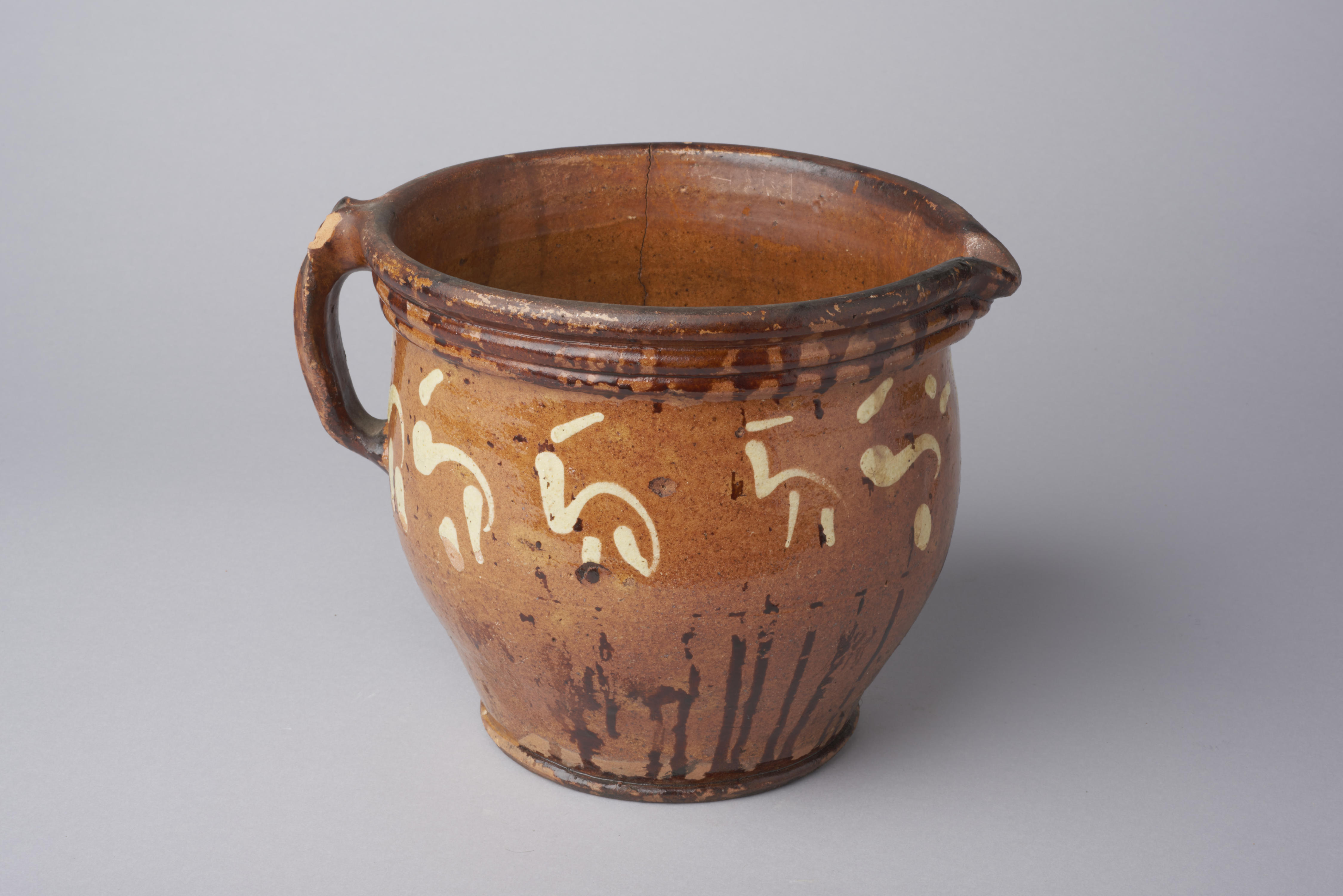 Kan, versierd met een gestileerd opschrift of jaartal.