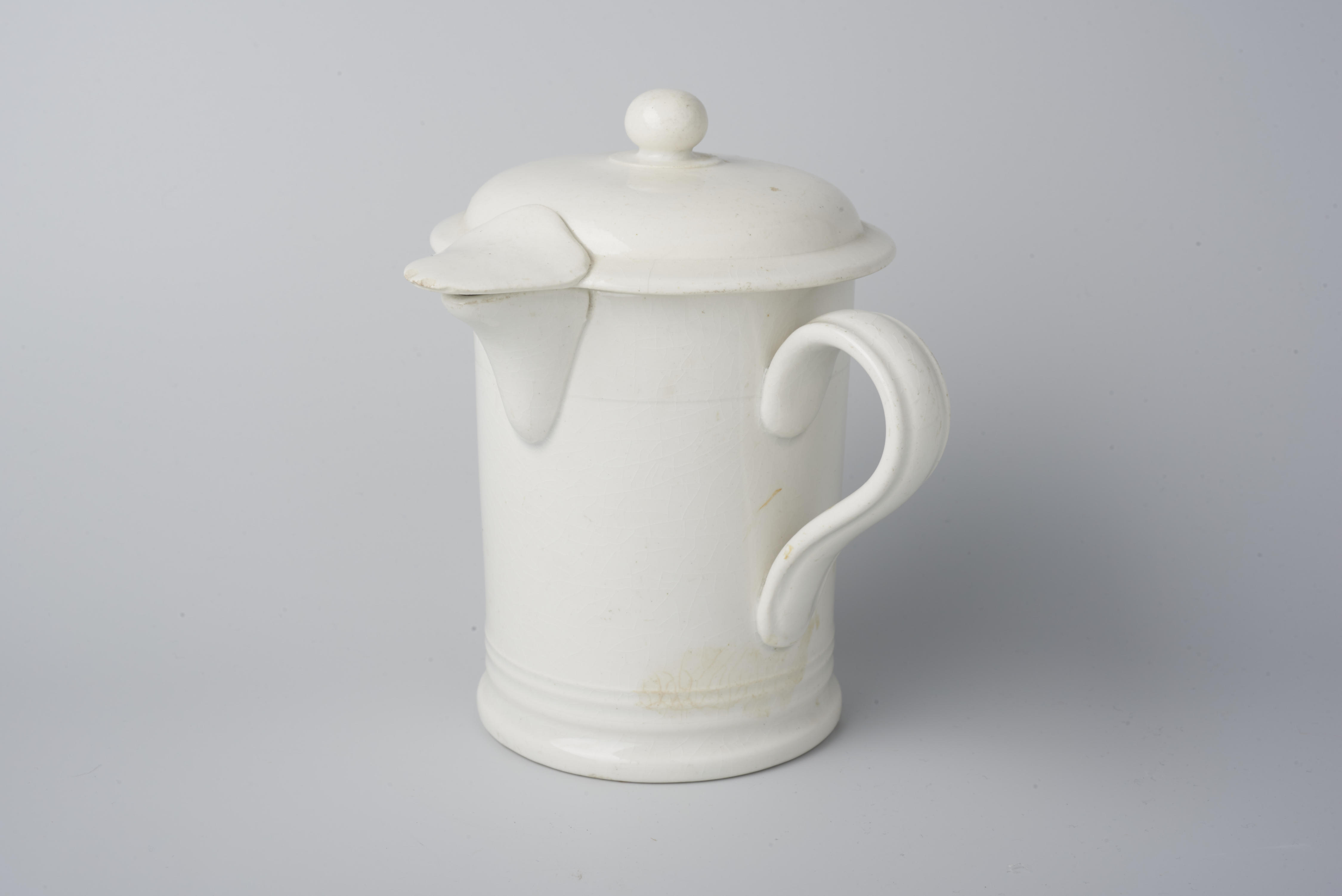 Stroopkan met deksel, vervaardigd van witbakkend aardewerk. Deze stroopkan werd door Société Ceramique Maastricht rond 1900 geproduceerd. Hij werd doorgaans in de winkel gevuld.