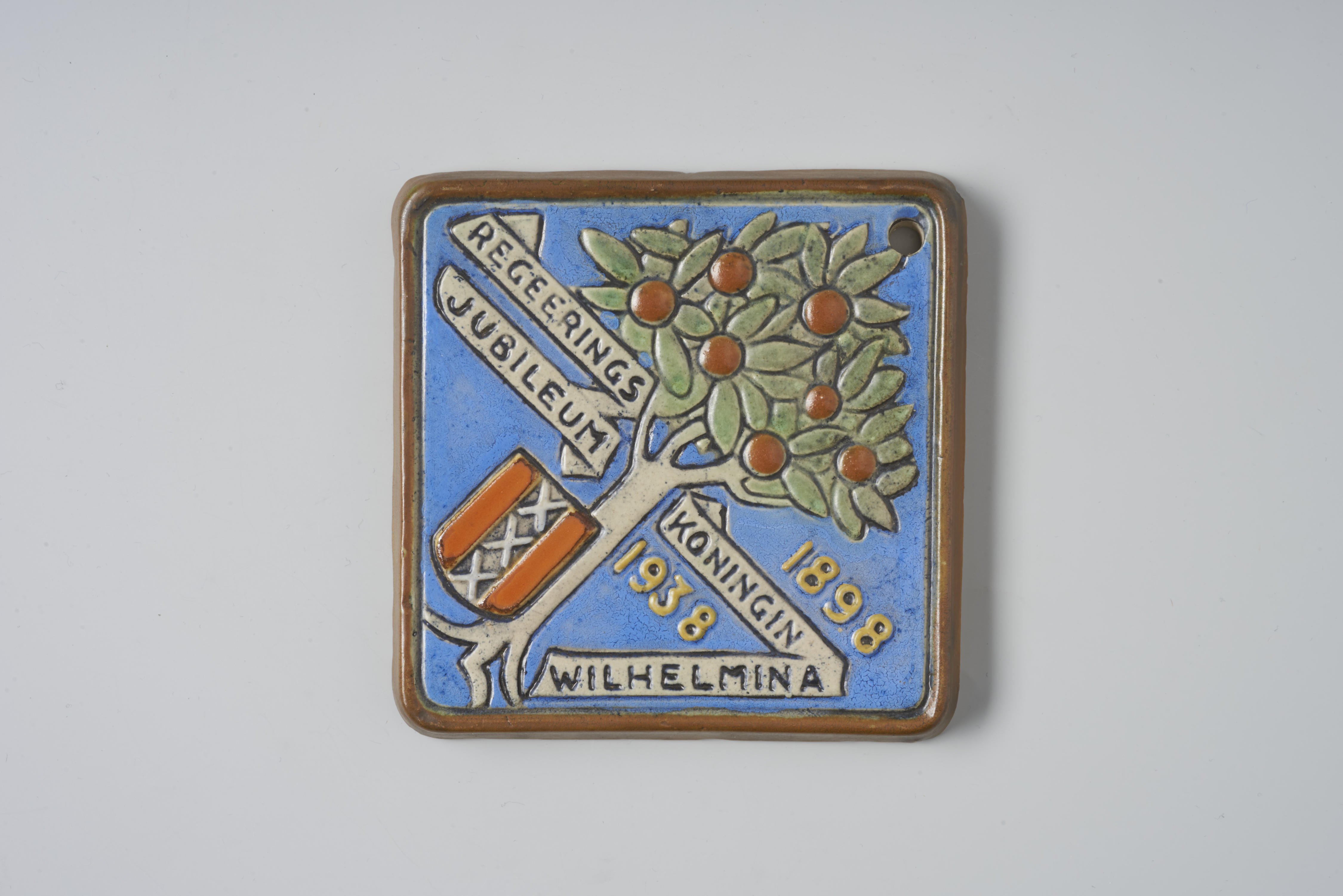 Gedenktegel, gemaakt ter gelegenheid van het veertigjarig regeringsjubileum van koningin Wilhelmina in 1938.