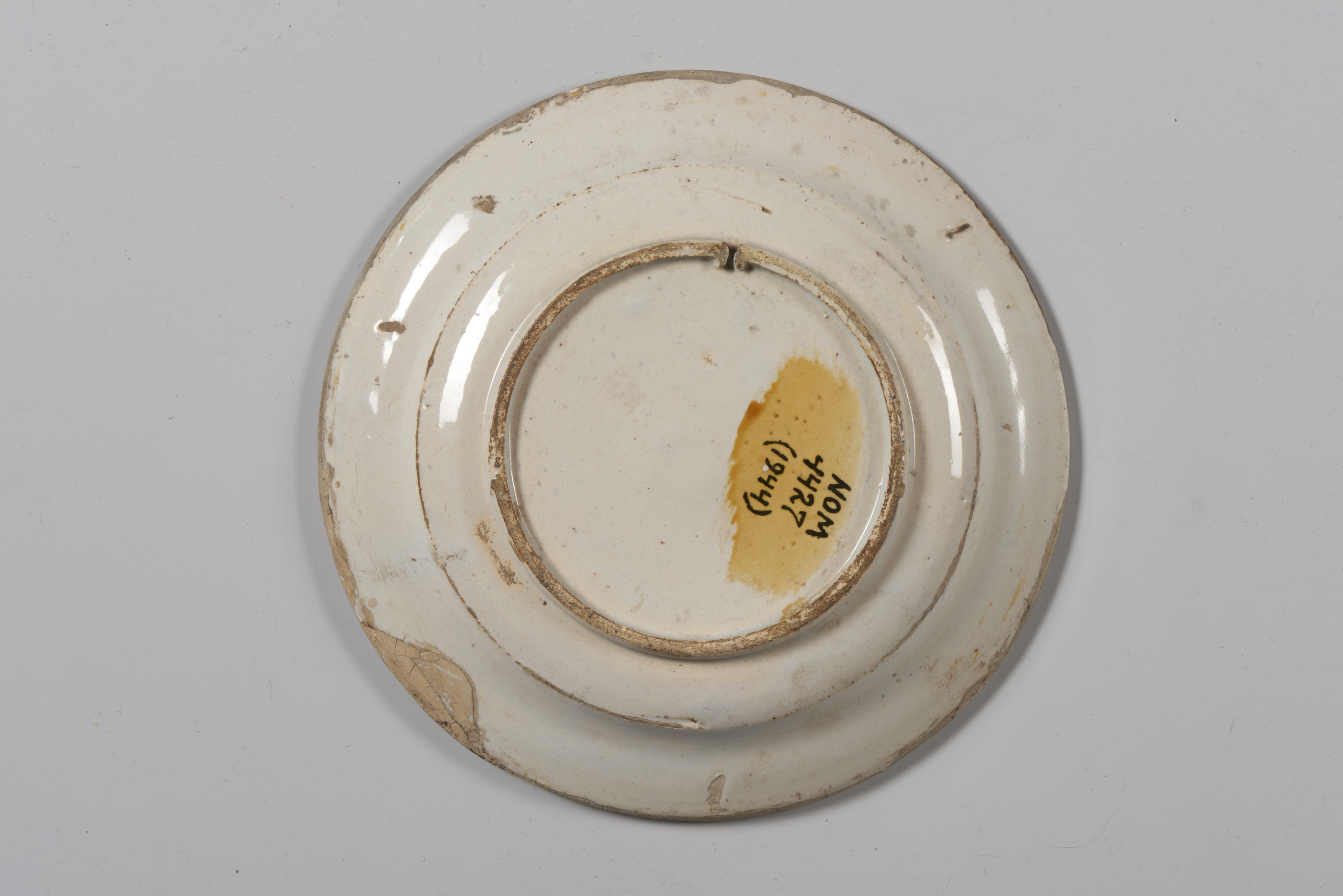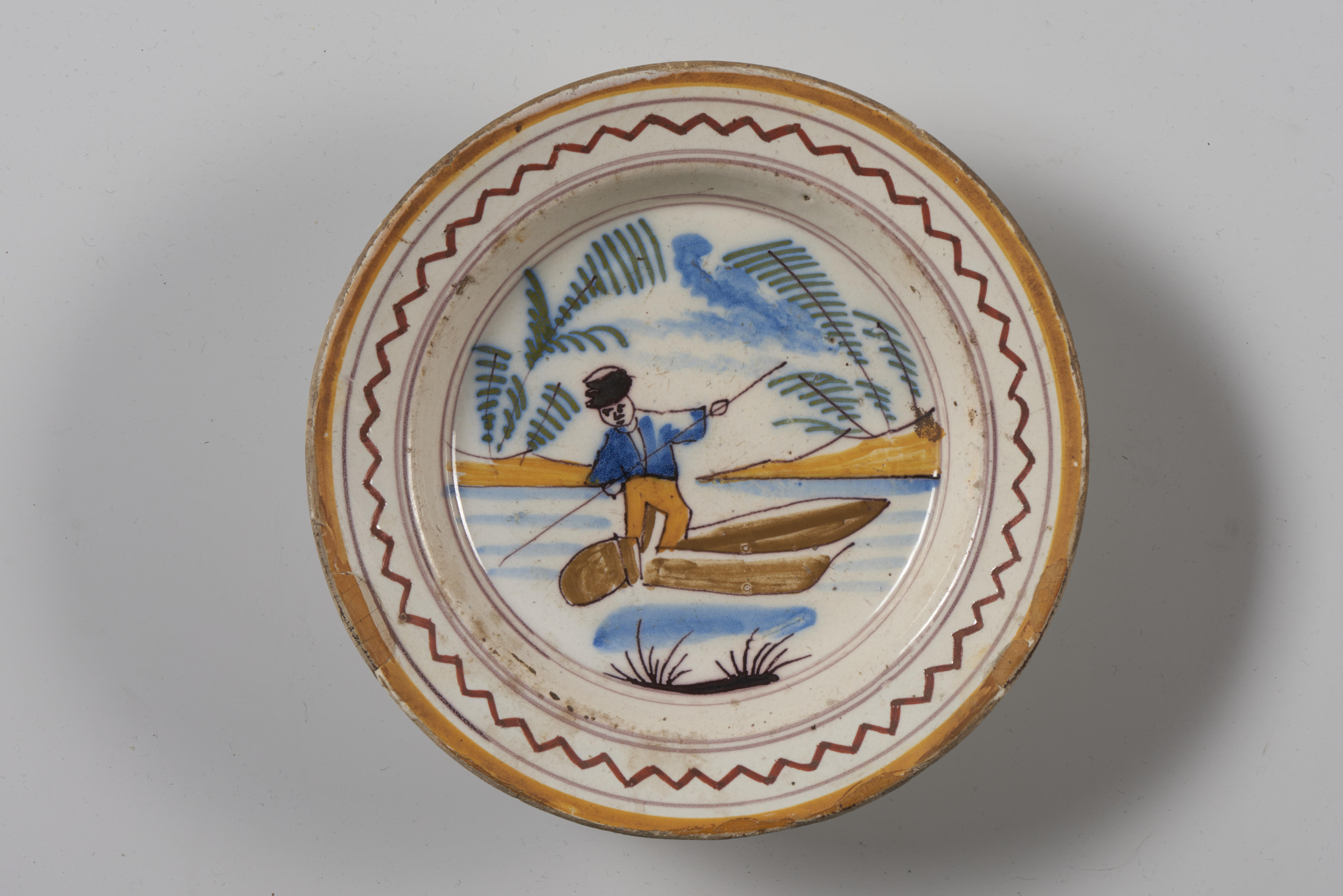 Bord, op de rand versierd met een zigzagornament en op het middenvlak een afbeelding van een man in een boot met op de achtergrond begroeide heuvels. De kleding van de man maakt een vroeg negentiende-eeuwse indruk.