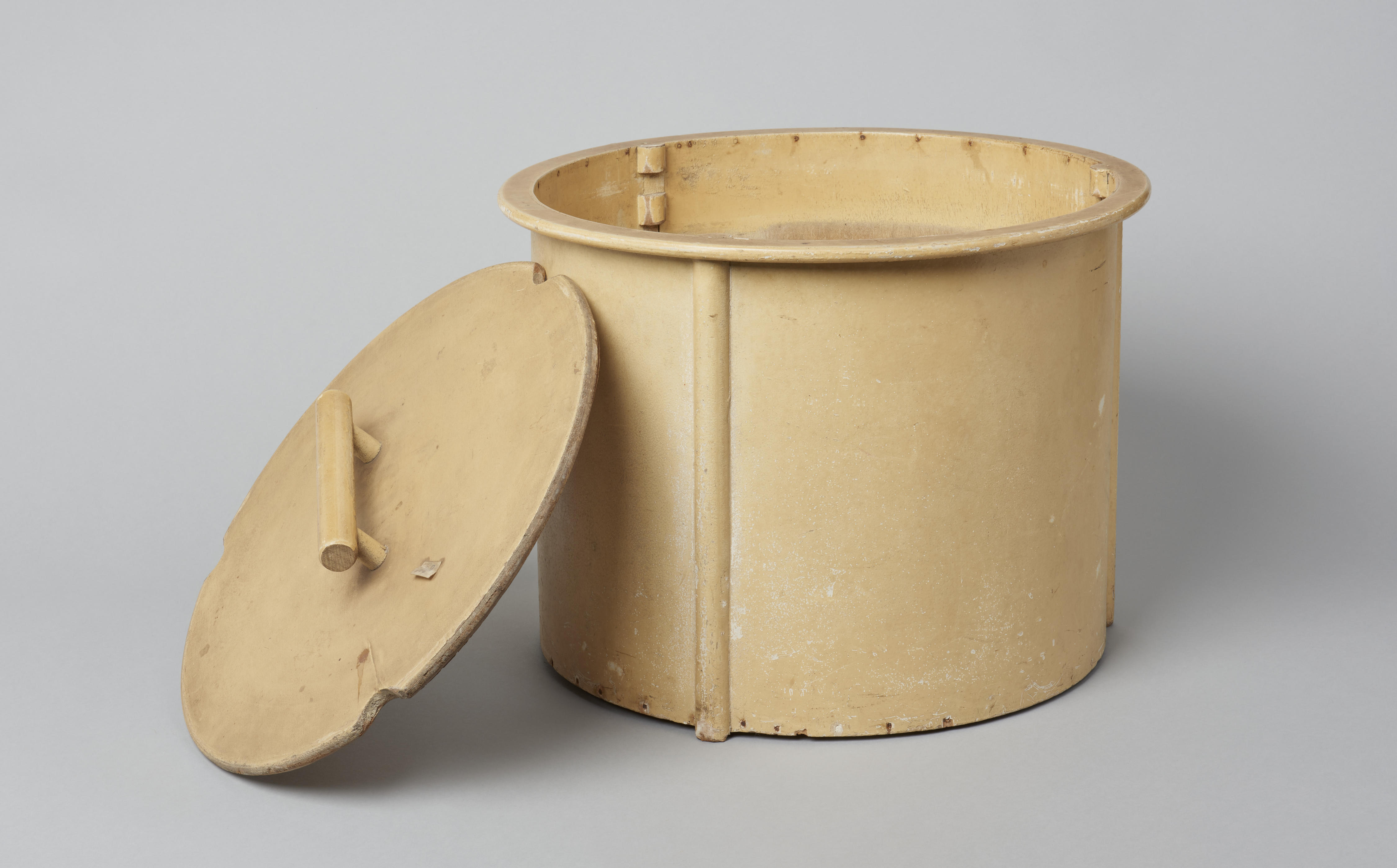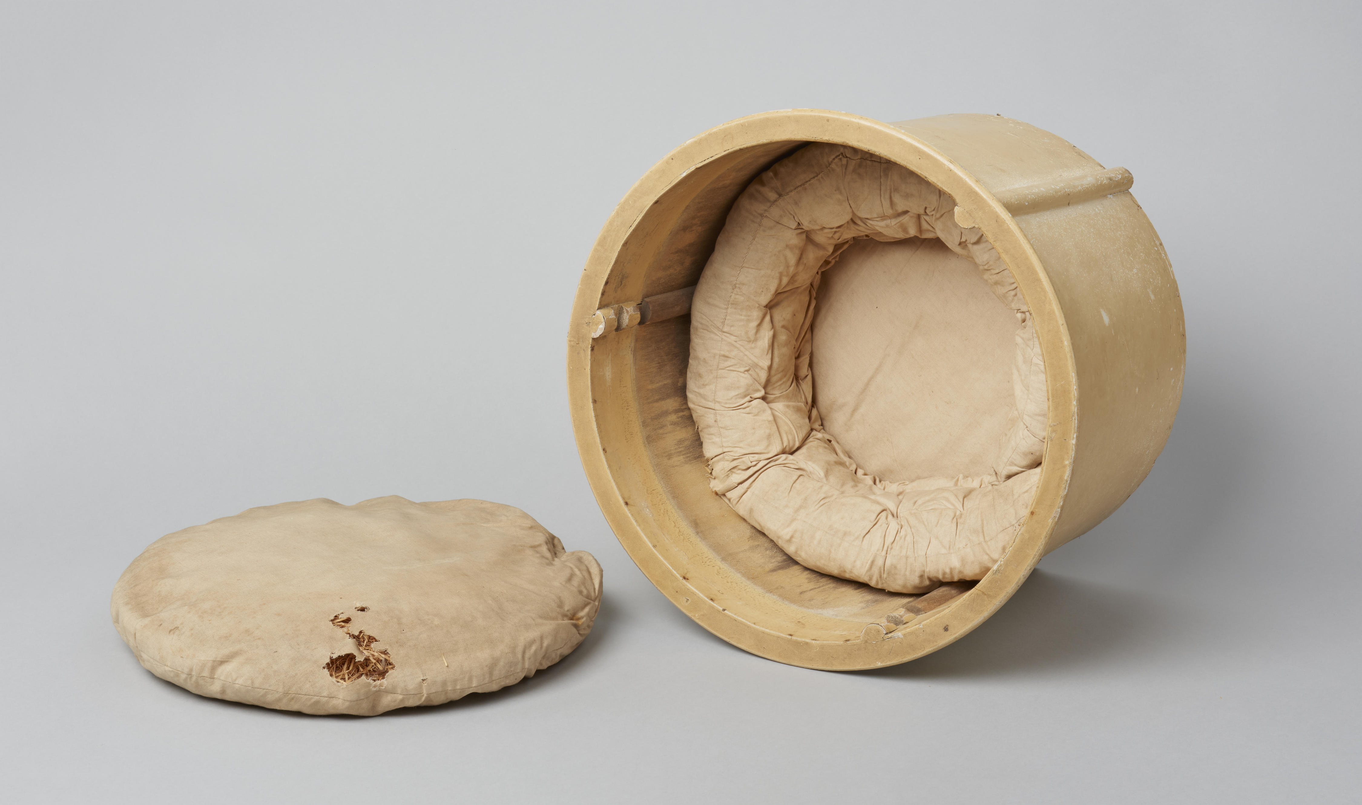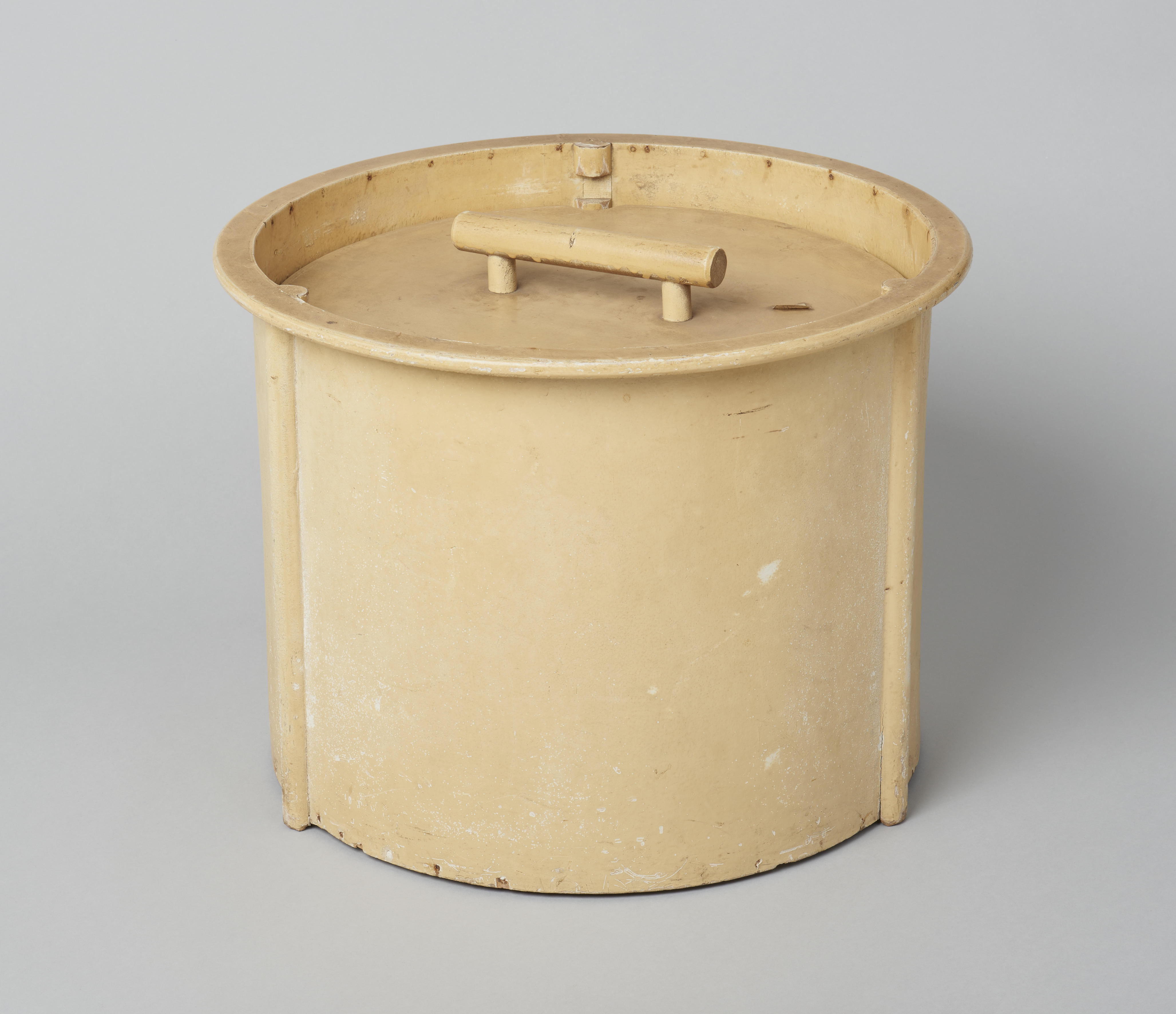 Crèmekleurige hooikist van Bruynzeel met deksel. De hooikist is vervaardigd van triplex. Hij is gebruikt om voedsel in te garen zonder dat er voortdurend brandstof nodig was. De binnenkant van de hooikist werd voor gebruik opgestopt met hooi. Onderin werd een onderzetter geplaatst waar de pan op kon worden gezet. De pan werd vervolgens in ...