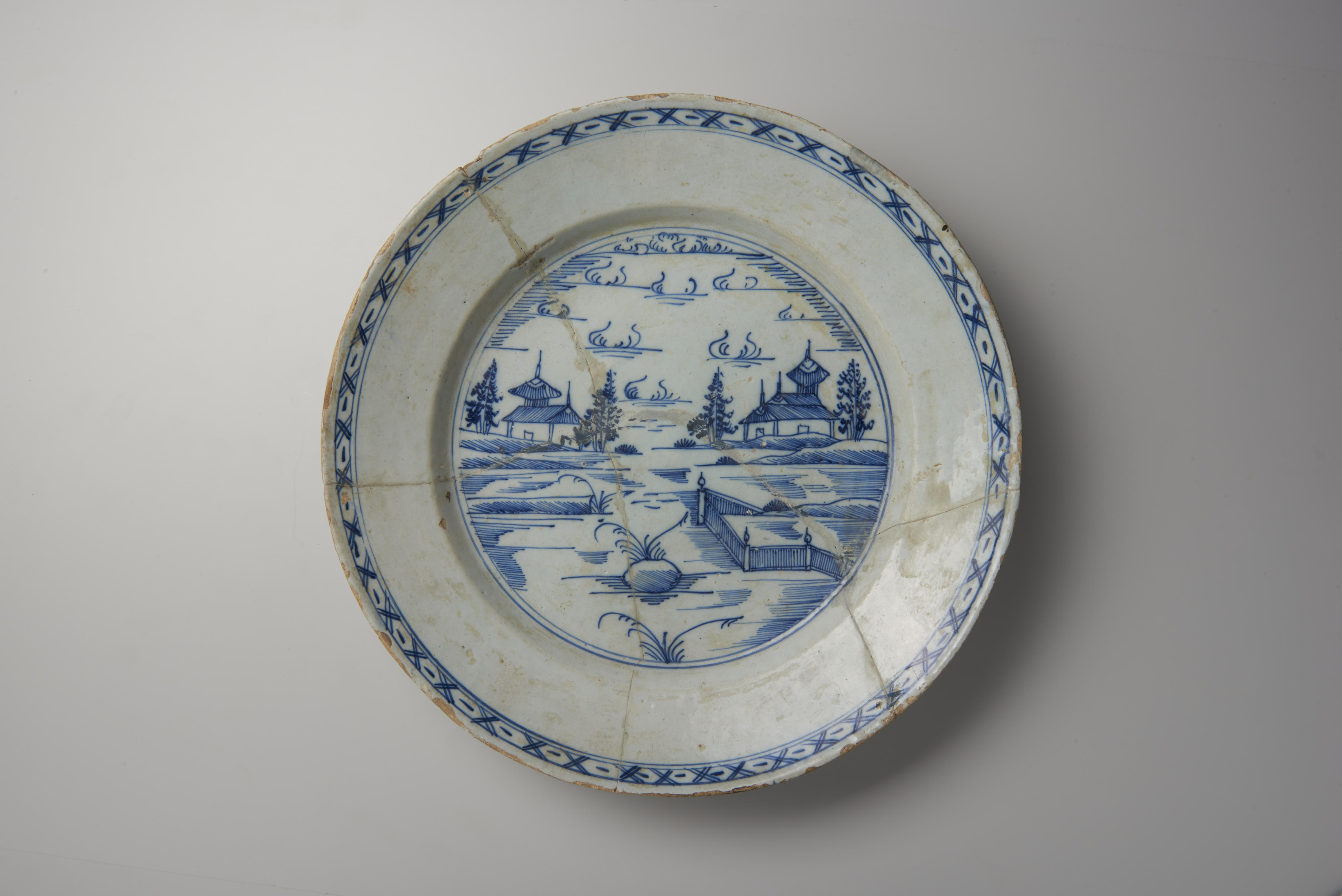 Schotel met een randversiering van geometrische ornamenten en op het middenvlak een voorstelling van een landschap met twee gebouwen.