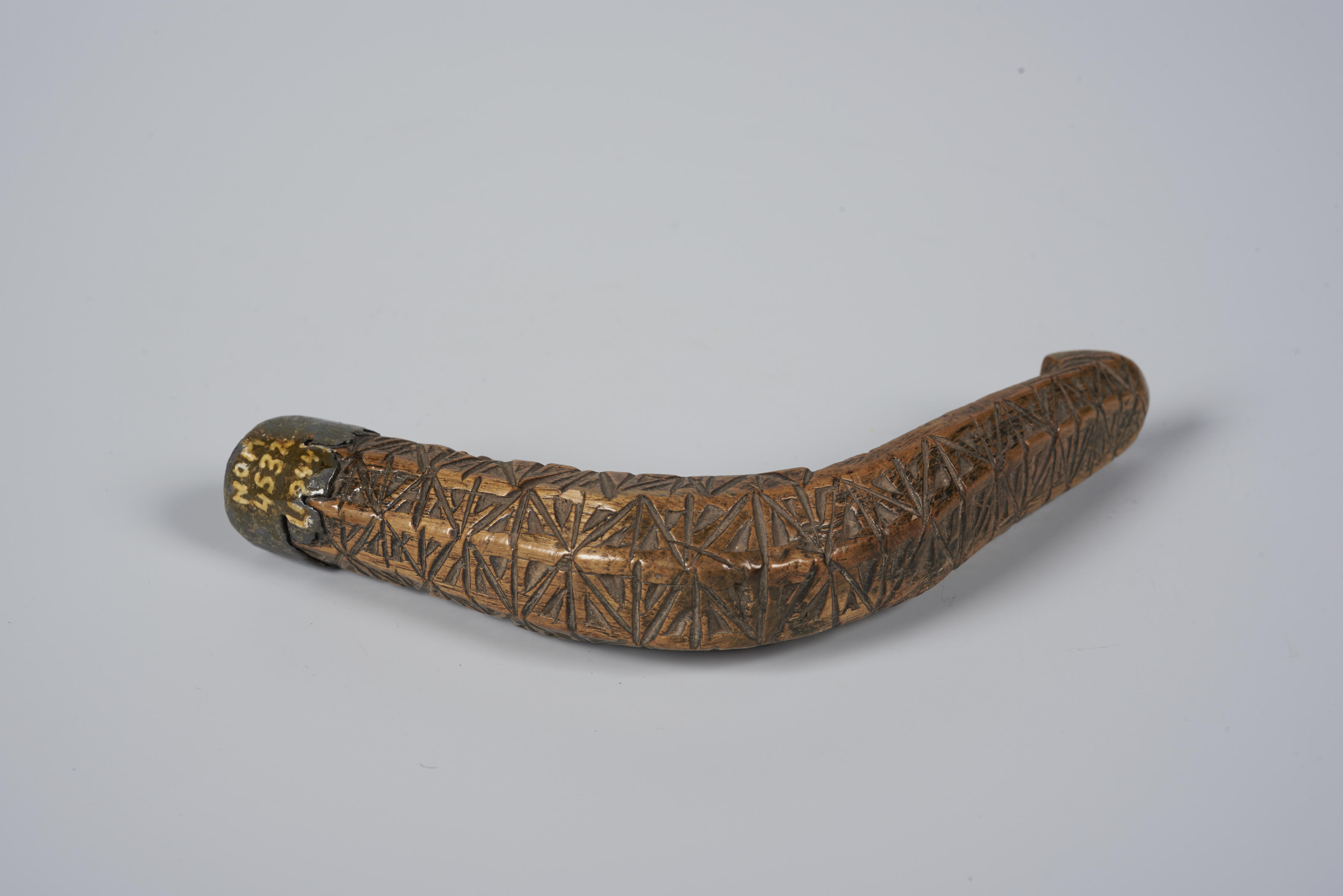 Houten breischede voor een man, afkomstig uit Staphorst. Een breischede wordt gebruikt bij het breien van bijvoorbeeld kousen met (vier) korte breipennen. Tijdens het gebruik steekt de breier het kromme deel achter de broeksboord, zodat het ronde deel met de opening horizontaal naar voren steekt. De werkpen wordt tijdens het breien in de opening gestoken. ...