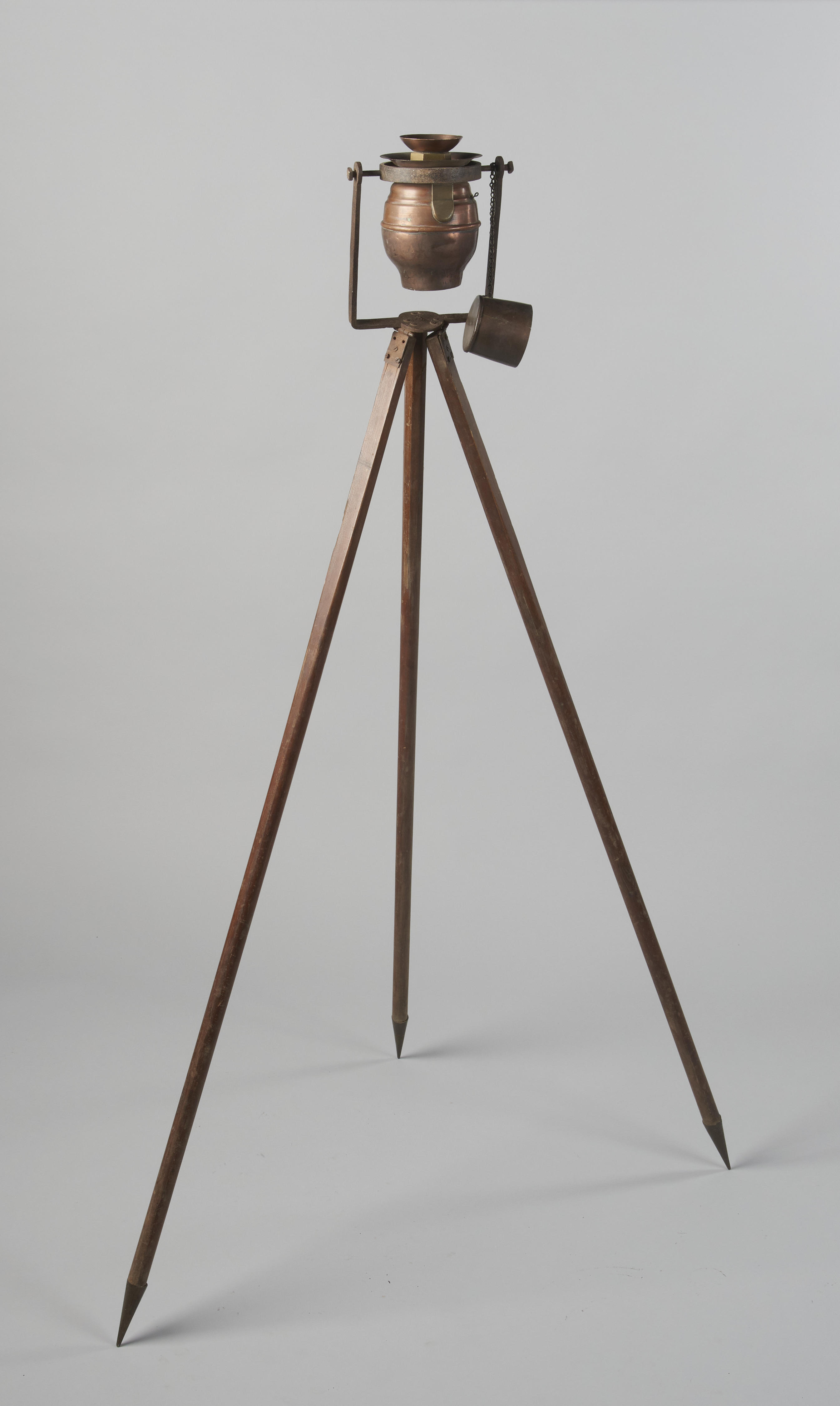 Koperen dijklamp of olielamp op een houten driepoot. De lamp werd vroeger gebruikt in Maurik bij brand en dijkdoorbraken.