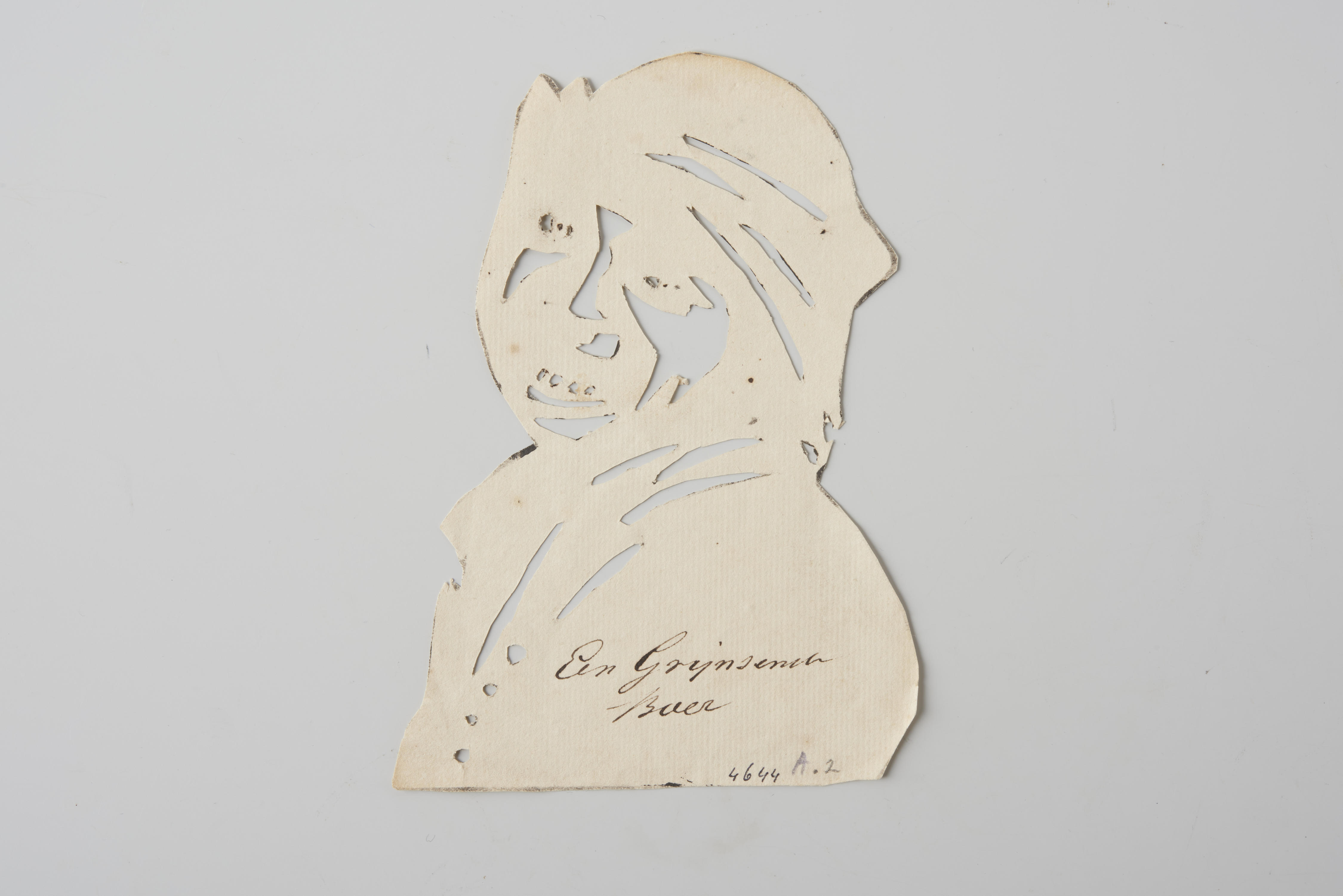 Coptografische voorstelling van een man. Het opschrift luidt: 'Een Grijnsende Boer'.