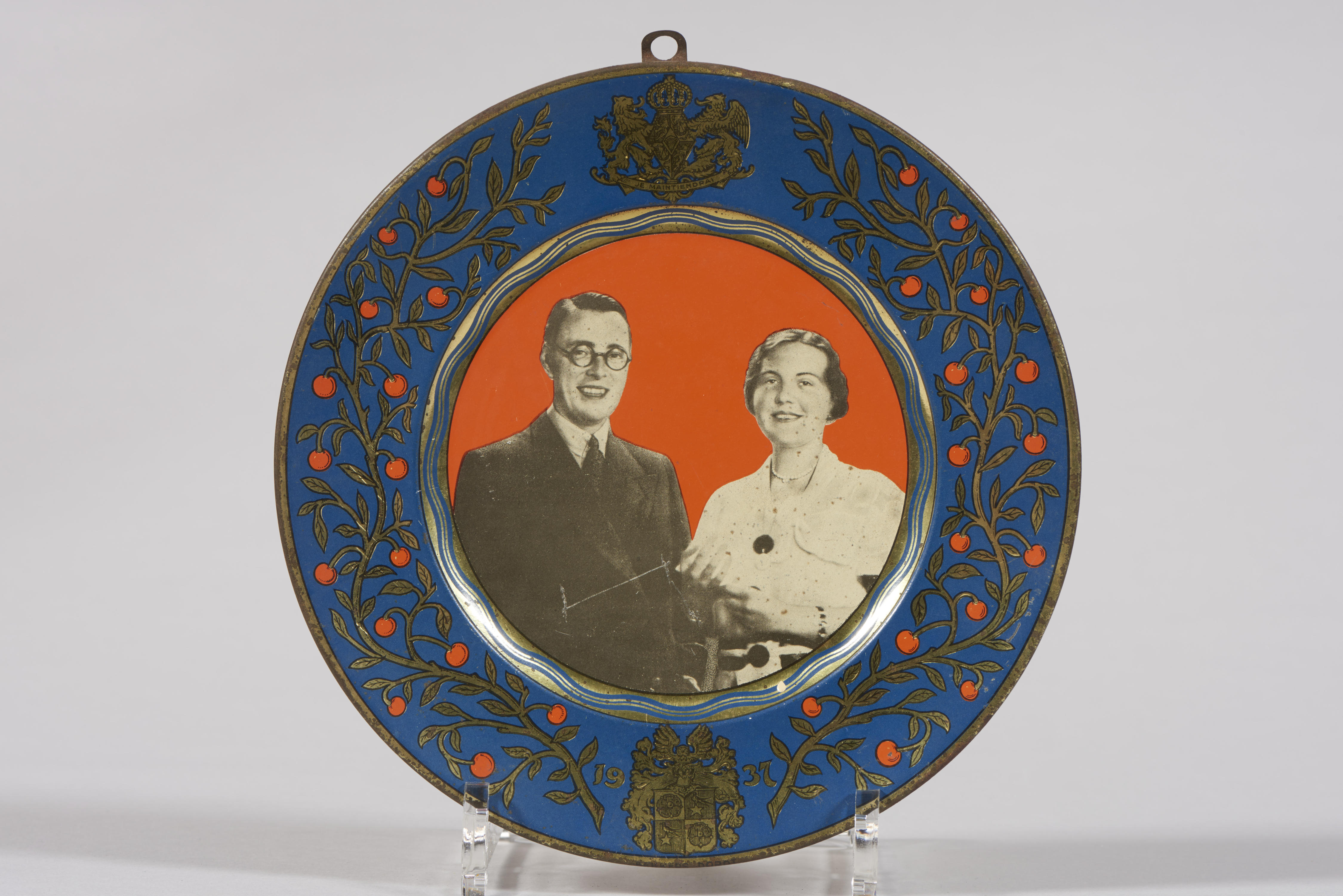 Gedenkbord, uitgebracht ter gelegenheid van het huwelijk van prinses Juliana en prins Bernhard. Op het midden van het bord staat de voorstelling van Bernhard en Juliana op een oranje fond. De blauw bordrand is versierd met oranjeappels, twee wapens en het jaartal 1937. De achterkant van het bord is bedrukt met de tekst: 'Wat Neerland ...