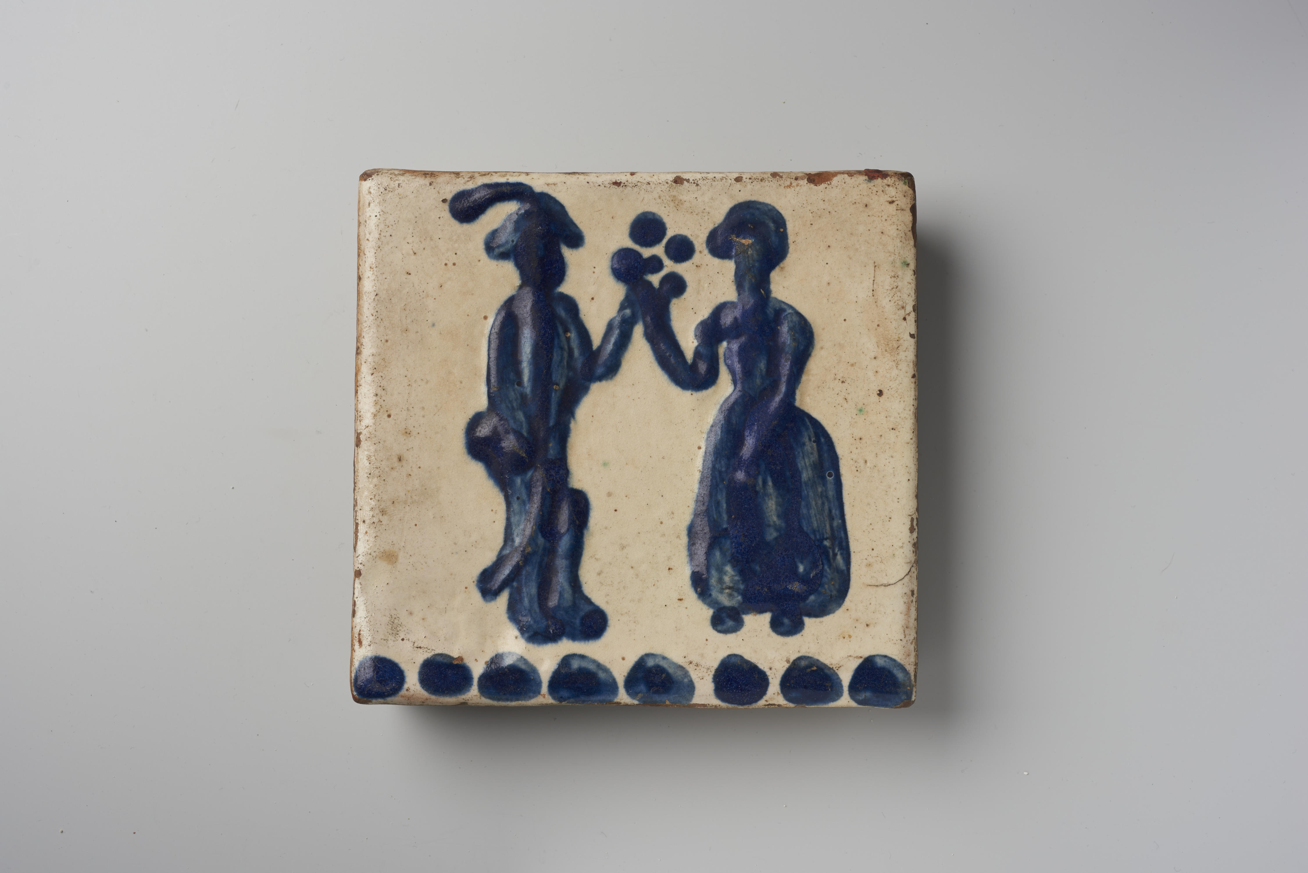Kacheltegel met een voorstelling van een man en vrouw die hand in hand staan. De tegel zou afkomstig zijn uit een pand aan de Vleeschhouwerstraat in Nijmegen.