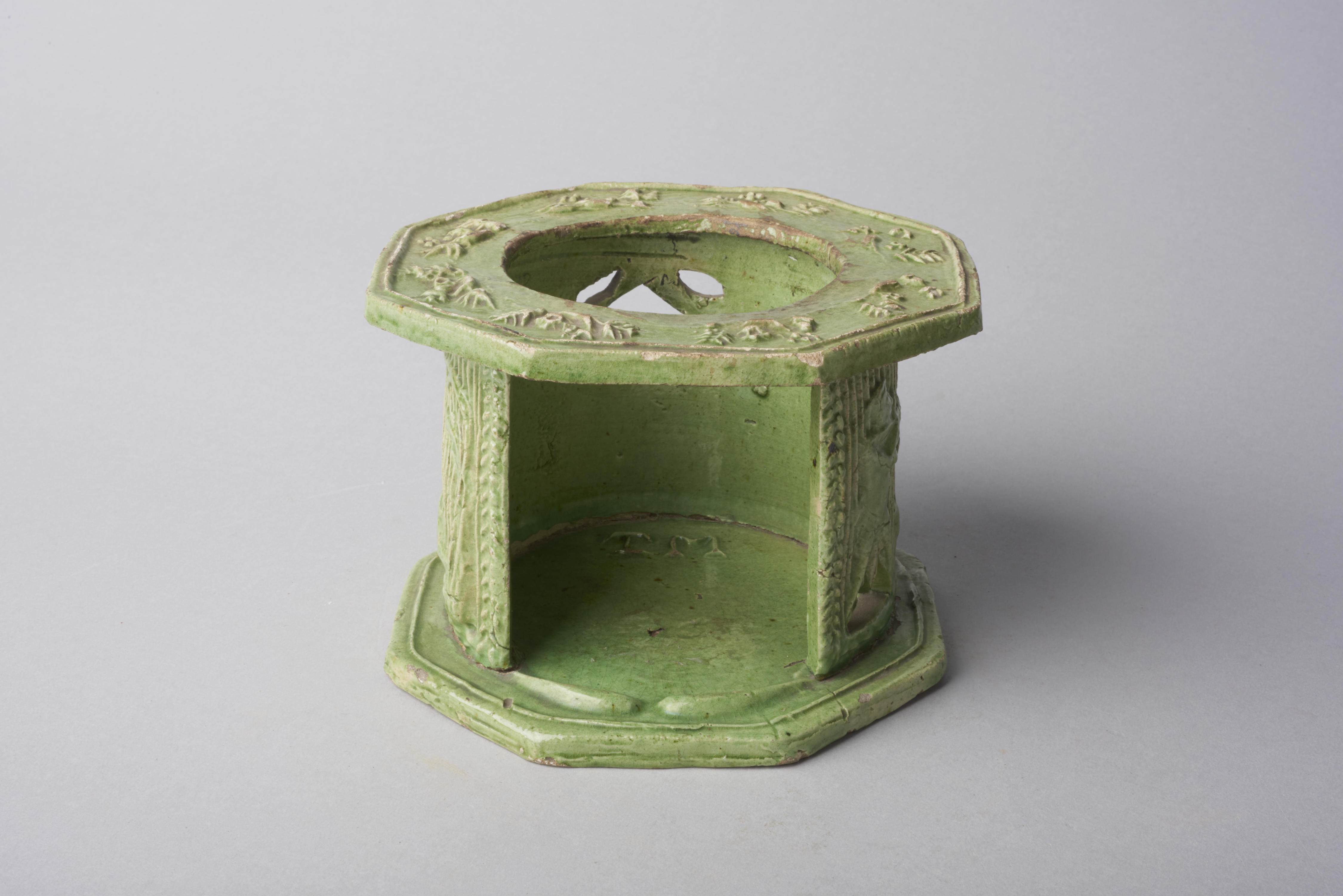 Komfoor, versierd met een jachtscène, bloemen, bladeren en vogels en het merk: 'TM'.