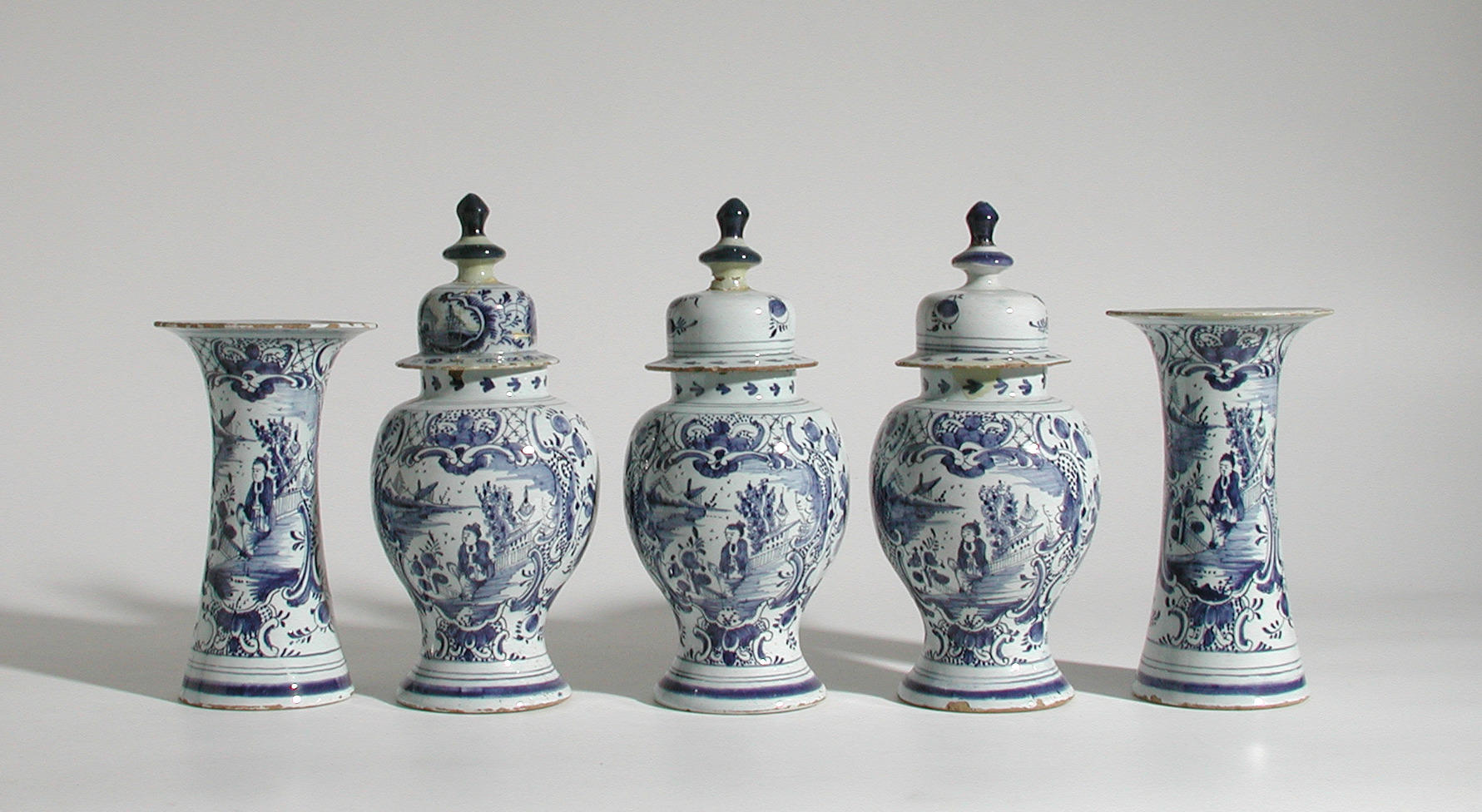 Kaststel, bestaande uit vijf vazen waarvan drie met deksel. De vazen hebben een centrale voorstelling van een man in tuin en een randversiering van bloeiende planten en geometrische ornamenten. De deksels zijn versierd met gestileerde plantaardige ornamenten.